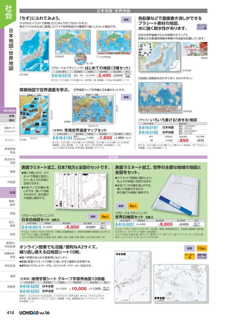 色鉛筆などで直接書き消しができるプラシート素材の地図。水に強く耐水性があります。ポリプロピレン製日本の世界遺産がわかる写真付きマップや、県章などの都道府県基本情報や白地図を記載しています。使用例日本地図行政図と地勢図を合わせており、わかりやすい!世界地図[デビカ]いろいろ書ける!消せる!地図お申込番号8-616-51818-616-5182単位1枚日本地図世界地図M価税抜¥1,000商品種別縮尺/423万分の1、型式/073101縮尺/6570万分の1、型式/073102税抜価格¥850税込価格¥935●寸法/435(縦)×620(横)×0.2(厚)mm●材質/ポリプロピレン●質量/50g●包装数:1/5「ちず」にふれてみよう。ひらがなとイラストで表現した「にほんちず」せかいちず」と、南北アメリカを左右に表現した「ワイド世界地図」の3種類を1組にしたセット商品です。紙製日本地図・世界地図世界地図ワイド世界地図[グローバルプランニング]はじめての地図(3種セット)拡大図お申込番号8-616-5219商品種別型式/001M価税抜p¥2,400税抜価格¥2,400税込価格¥2,640単位1セット(3種)●寸法/515(縦)×728(横)mm●材質/紙●質量/500g●包装数:1/10日本地図常掲地図で世界遺産を学ぶ。世界遺産マップ世界編と日本編のセットです。社会日本地図・世界地図学習支援用品保育理科発表ボード・ホワイトボードタイマータイマー日本版42cm黒板関連黒板関用品用品総合的な総合的学習学習国語国語外国語外国語社会算数・算数・数学数学音楽音楽図工・図工美術美術技術技術家庭科・家庭科学校給食学校給食保健体育・球技球技特別支援特別支道徳道徳図書室図書室白地図表面ラミネート加工、日本7地方と全図のセットです。●薄くて軽いので、マグネットで黒板に掲示したり、机上での学習に活用できます。●水性ペンでの書き消しができ、巻いて収納できるので、持ち運びや保管に便利です。[グローバルプランニング]日本白地図セット8枚入お申込番号8-616-5015M価税抜p¥8,800紙製8枚入税抜価格¥8,800税込価格¥9,680単位1セット(8枚入)●寸法/1080×780mm(B1判)●厚紙、表面樹脂加工●県境・経緯線・海岸線・主な河川入●マグネット4個付●包装数:1〈セット内容〉日本全図、北海道、東北、関東、中部、近畿、中国・四国、九州各地方図×1枚オンライン授業でも活躍!便利なA2サイズ。繰り返し使える白地図シート10枚。●調べ学習のまとめや発表用にもピッタリ。●紙製(表面ラミネート)で軽くて扱いやすく価格もお手頃です。●便利なマグネットテープ付。ホワイトボードマーカー対応です。[全教図]地理学習シートグループ学習用地図10枚組表面ラミネート加工、世界の主要な地域の地図と全図をセット。●マグネットで黒板に掲示したり、机上での学習に活用できます。●水性ペンでの書き消しができ、巻いて収納できるので、持ち運びや保管に便利です。紙製8枚入[グローバルプランニング]世界白地図セット8枚入お申込番号8-616-5021M価税抜p¥8,800税抜価格¥8,800税込価格¥9,680単位1セット(8枚入)●寸法/780×1080mm(B1判)●材質/厚紙、表面樹脂加工●国境・経緯線・海岸線・主な河川入●マグネット4個付●包装数:1南ヨーロッパ・北アフリカ、北アメリカ中心部〈セット内容〉世界全図、東アジア、東南アジア、南アジア、西アジア、ヨーロッパ中心部、紙製10枚入マーカー用裏面・両端マグネット付お申込番号8-616-52328-616-5233商品種別日本全図世界全図M価税抜税抜価格税込価格単位p¥10,000¥10,000¥11,0001セット(10枚入)●縮尺/362万分の1(日本全図)、7100万分の1世界全図)●寸法/594×420mm●材質/紙(表面ポリプロピレン加工)●質量/90g●裏面短辺にマグネットテープ付●包装数:1/5410Vol.16紙製42cm税込価格単位M価税抜¥1,900型式/ZS-SEM-A2S8-616-5134¥1,9801セット●寸法/420(縦)×594横)mm(世界版)、594(縦)×420(横)mm(日本版)●質量/20g●材質/コート紙●2013年9月現在●包装数:1/30〈セット内容〉日本地図、世界地図、解説書(14ページ)¥1,800お申込番号商品種別税抜価格世界版[全教図]常掲世界遺産マップセット59.4cm59.4cm