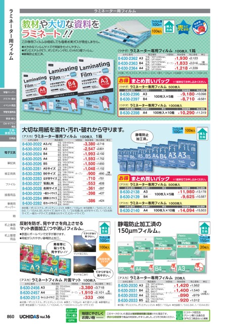 ラミネーター用フィルム教材や大切な資料をラミネート!!ラミネートこの専用フィルムは焼却しても塩素水素ガスが発生しません。●大きめなフィルムサイズで用紙をセットしやすい。●ポリエステル(PET)、ポリエチレン(PE)、EVAの3層フィルム。●静電防止加工済。フィルム厚100μm100枚入挿入方向[ウチダ]ラミネーター専用フィルム100枚入1箱お申込番号8-630-23628-630-23638-630-2364A3B4A4商品種別寸法/307×430mm、型式/UF100A3寸法/267×374mm、型式/UF100B4寸法/220×307mm、型式/UF100A4オープン¥1,930¥2,123¥1,833¥2,016¥1,218¥1,339M価税抜税抜価格税込価格単位1箱(100枚入)●材質/ポリエステル、ポリエチレン、EVA●厚さ/100μm●包装数:1/10A4)、1/5(B4・A3)お得[ウチダ]ラミネーター専用フィルム500枚入まとめ買いパック※1組単位申込。お申込番号8-630-23968-630-2397商品種別単位A3B4100枚入×5箱税抜価格税込価格¥9,180¥10,098¥8,710¥9,581[ウチダ]ラミネーター専用フィルム1000枚入お申込番号8-630-2398商品種別A4単位100枚入×10箱税抜価格税込価格¥10,290¥11,319大切な用紙を濡れ・汚れ・破れから守ります。[アスカ]ラミネーター専用フィルム100枚入1箱税抜価格税込価格単位静電防止加工済。フィルム厚100μm100枚入挿入方向M価税抜オープンお申込番号8-630-20228-630-20238-630-20248-630-20258-630-20268-630-22818-630-22808-630-22838-630-20278-630-20288-630-20298-630-22848-630-2282商品種別寸法/339×493mm、型式/BH910寸法/307×430mm、型式/BH909寸法/267×374mm、型式/BH908寸法/220×307mm、型式/BH907寸法/192×267mm、型式/BH906寸法/158×220mm、型式/BH913寸法/138×192mm、型式/BH912A3ノビA3B4A4B5A5サイズB6サイズはがきサイズ寸法/109×154mm、型式/BH905寸法/95×135mm、写真L判型式/BH904名刺サイズ寸法/60×95mm、一般カードサイズ寸法/60×90mm、診察券(小)サイズ寸法/86×54mm、IDカードサイズ寸法/57×82mm、型式/BH903型式/BH902型式/BH911型式/BH901¥3,380¥3,718¥2,547¥2,801¥1,993¥2,192¥1,593¥1,752¥1,500¥1,650¥1,048¥1,152¥990¥781¥608¥397¥437¥900¥710¥553¥361¥398¥386¥4241箱(100枚入)●材質/ポリエステル、ポリエチレン、EVA●厚さ/100μm●包装数:1/5(A3ノビ、A3、B4)、1/10(A4、B5、A5サイズ、B6サイズ)、1/20(写真L判、はがきサイズ)、1/50(名刺サイズ、一般カードサイズ、診察券(小)サイズ、IDカードサイズ)反射を防ぎ、見やすさを向上させるマット表面加工(つや消し)フィルム。●表面にボールペンで文字が書けます。●用紙が入れやすい静電防止加工。てかりがあり見づらい。黒板等に貼っても見やすい!!マット加工なし挿入方向フィルム厚100μm100枚入[アスカ]ラミネートフィルム片面マット100枚入マット加工ありてかりがなく見やすい。お申込番号8-630-24568-630-24578-630-2513商品種別M価税抜税抜価格税込価格単位A3A4キャッシュカードサイズ寸法/303×426mm、型式/F1033寸法/216×303mm、型式/F1032寸法/54×86mm、型式/F1030オープン¥3,380¥3,718¥1,910¥2,101¥366¥3331箱(100枚入)●材質/ポリエステル、ポリエチレン、EVA●厚さ/100μm●片面マット面●静電防止処理●包装数:1/5(A3)、1/10A4)、1/100キャッシュカードサイズ)お得[アスカ]ラミネーター専用フィルム500枚入まとめ買いパック※1組単位申込。お申込番号8-630-21388-630-2139商品種別単位A3B4100枚入×5箱税抜価格税込価格¥11,980¥13,178¥9,625¥10,587[アスカ]ラミネーター専用フィルム1000枚入お申込番号8-630-2140商品種別A4単位100枚入×10箱静電防止加工済の150μmフィルム。税抜価格税込価格¥14,094¥15,503挿入方向フィルム厚150μm20枚入[アスカ]ラミネーター専用フィルム20枚入税抜価格税込価格単位お申込番号8-630-20308-630-20318-630-20328-630-2033A3B4A4B5商品種別寸法/307×430mm、型式/BH078寸法/267×374mm、型式/BH077寸法/220×307mm、型式/BH076寸法/192×267mm、型式/BH075M価税抜オープン¥1,420¥1,562¥1,400¥1,540¥890¥979¥920¥1,0121袋(20枚入)●材質/ポリエステル、ポリエチレン、EVA●厚さ/150μm●包装数:1/5A3、B4)、1/10(A4、B5)ラミネーター用フィルム学習ペーパークラフト・素材イベント用品学習支援用品安全・安心OA・サプライ用品文具・事務用品日用品電子文具筆記具筆記具修正用具修正用ファイルファイル接着用品接着用事務用事務用ペーパーペーパ鞄鞄机上事務机上事用品用品机上整理机上整理用品用品860Vol.16エコマークグリーン購入GPN地球にやさしくお買い物このマークのついた商品は地球環境保護に配慮された商品です。グリーンの文字で商品の判別をしやすくしました。どうぞご利用ください。エコマークグリーン購入GPNエコマーク認定品グリーン購入法適合品GPNエコ商品ねっと掲載