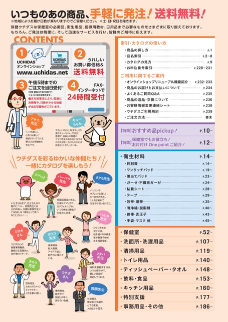 いつものあの商品、手軽に発注!送料無料!※地域によりお届け日数が異なりますのでご留意ください。※土・日・祝日を除きます。保健保健室必需品、衛生用品、指導用教材、日用品必要取揃。、発注簡便、迅速行、皆様期待応。CONTENTS1索引・カタログの使い方・商品の探し方………………………………………………………………・品名索引・カタログの見方……………………………………………………………・お申込番号索引………………………………………………………………………………………………………………P.1P.2〜8P.9P.228〜231ご利用に関するご案内P.232・233P.234・オンラインショップリニューアル機能紹介…・商品のお届けとお支払いについて……………………・よくあるご質問Q&A……………………………………………・商品の返品・交換について・お客様情報変更連絡シート…………………………………・ウチダスご利用規約………………………………………………・ご注文方法……………………………………………………………………………………………………P.235P.236P.238P.239巻末【特集】おすすめ品pickup!【特集】保健室でもお役立ち!お片付けOnepointご紹介!●衛生材料P.10〜P.12〜P.14〜・絆創膏………………………………………………………………………・ワンタッチパッド……………………………………………………・傷当てパッド…………………………………………………………・ガーゼ・不織布ガーゼ……………………………………………・粘着シート………………………………………………………………・テープ………………………………………………………………………・包帯・眼帯…………………………………………………………………・清浄綿・脱脂綿・綿棒・舌圧子・手袋・マスク他…………………………………………………………………………………………………………………………………………………………………………P.14〜P.19〜P.23〜P.24〜P.28〜P.29〜P.35〜P.40〜P.43〜P.45〜●保健室●洗面所・洗濯用品●清掃用品●トイレ用品●ティッシュペーパー・タオル●飲料・食品●キッチン用品●特別支援●事務用品・その他P.52〜P.107〜P.119〜P.140〜P.148〜P.153〜P.160〜P.177〜P.186〜2うれしいお買い得価格&送料無料424時間受付FAX・インターネットでUCHIDASUCHIDASオンラインショップwww.uchidas.netONLINESHOP3午後5時までのご注文を当日受付※(沖縄・離島は午前12時まで)※土・日・祝日を除きます。働き方改革法により、配達にお時間や、日数がかかる地域が出る可能性がございます。アヤコ先生“いつも優しく、ときには厳しく”相談にのってくれる、頼りになる保健室の先生です。キューちゃんやさしいけれど、恥ずかしがり屋なキューちゃん。手先が器用で、仲良しの保健のアヤコ先生のお手伝いをするのが大好き!かばんの中には救急セットが入っている。ウチダスを彩るゆかいな仲間たち!一緒にカタログを楽しもう!ピペットバーバラ先生いたずら好きで、目立ちたがり屋のピペット。教頭先生とは大の仲良し。日課は教頭先生に「うめぼしを1個もらって食べること」らしい・・・。外国語担当の先生。出身はアメリカのカリフォルニア州。いつも明るく陽気で生徒の人気者。ミサキさんウチダさんの後輩事務職員。趣味は文具集めと、流行物のリサーチ。タロウ先生理科担当。カタログのメインキャラクター。メカ全般に強い。ヨウコ先生音楽担当。新人教師。アイデア出し・創作力に優れている。ウチダさん事務担当。細やかで気配りがきく。涙もろい性格。タクミ先生パソコンやタブレットに詳しいICT担当の先生。1人1台端末で生徒から引っ張りだこ。ハルカ先生ヨウコ先生の双子の姉。絵を描くのが得意。新米教師の妹の良き相談相手。フタバ先生特別支援教育を担当。いつも穏やかで、優しい笑顔で対応してくれる。教頭先生社会担当。雑学系の知識がとても豊富。メカは少々苦手。
