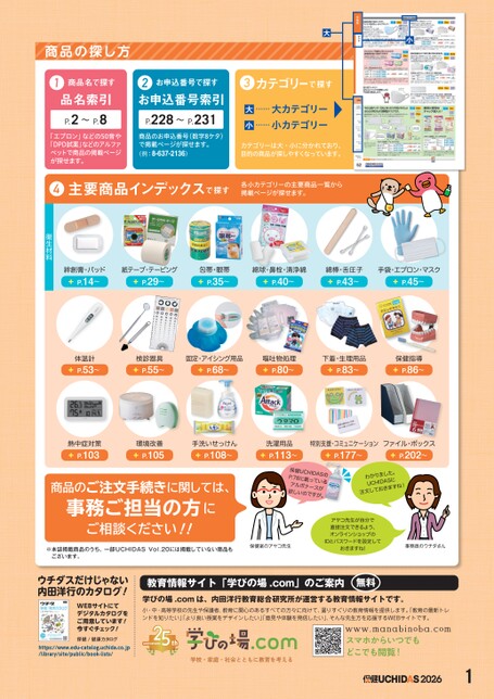 商品の探し方大小1商品名で探す品名索引P.2〜P.8「エプロン」などの50音や「DPD試薬」などのアルファベットで商品の掲載ページが探せます。お申込番号で探す2お申込番号索引P.228〜P.231商品のお申込番号(数字8ケタ)で掲載ページが探せます。(例:8-637-2136)3カテゴリーで探す大……大カテゴリー小……小カテゴリーカテゴリーは大・小に分かれており、目的の商品が探しやすくなっています。絆創膏・P.14〜紙・P.29〜包帯・眼帯P.35〜綿球・鼻栓・清浄綿P.40〜綿棒・舌圧子P.43〜手袋・・P.45〜衛生材料4主要商品インデックスで探す各小カテゴリーの主要商品一覧から掲載ページが探せます。体温計P.53〜検診器具P.55〜固定・用品P.68〜嘔吐物処理P.80〜下着・生理用品P.83〜保健指導P.86〜熱中症対策P.103環境改善P.105手洗P.108〜洗濯用品P.113〜特別支援・P.177〜・P.202〜先生自分直接注文、ID設定!事務員のウチダさん。SADI注文!UCH保健UCHIDAS.78載欲。P商品のご注文手続きに関しては、事務ご担当の方にご相談ください!!※本誌掲載商品のうち、一部UCHIDASございます。Vol.20には掲載していない商品も保健室のアヤコ先生内田洋行!WEB用意!今!保健/健康カタログhttps://www.edu-catalog.uchida.co.jp/library/site/public/book-lists/教育情報サイト「学びの場.com」のご案内無料学びの場.comは、内田洋行教育総合研究所が運営する教育情報サイトです。小・中・高等学校の先生や保護者、教育に関心のあるすべての方々に向けて、選りすぐりの教育情報を提供します。「教育の最新トレンドを知りたい」「より良い授業をデザインしたい」「意見や体験を発信したい」、そんな先生方を応援するWEBサイトです。スマホからいつでもどこでも閲覧!20261