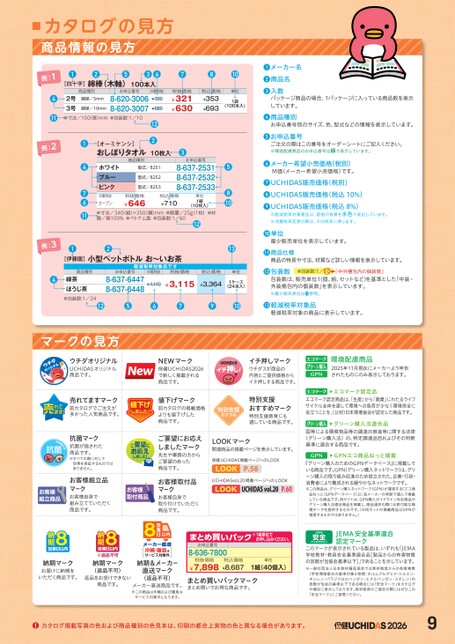カタログの見方商品情報の見方例:1411例:2例:316[白十字]綿棒(木軸)100本入532商品種別お申込番号綿径/5mm2号3号●寸法/150長)mm●包装数:1/108-620-30068-620-3007綿径/10mm78税抜価格¥321¥630税込価格¥353¥69310単位1袋(100本入)M価税抜¥330¥680122147611[オーミケンシ]おしぼりタオル10枚入商品種別ホワイトブルーピンク型式/8251型式/8252型式/82533お申込番号8-637-25318-637-25328-637-2533税抜価格¥646M価税抜オープン●寸法/340(縦)×350(横)mm●質量/25g(1枚)●材質/綿100%●ベトナム製●包装数:1/60税込価格¥710(10枚入)単位1組125810131メーカー名2商品名3入数パッケージ商品の場合、1パッケージに入っている商品数を表示しています。4商品種別お申込番号別のサイズ、色、型式などの情報を表示しています。5お申込番号ご注文の際はこの番号をオーダーシートにご記入ください。※環境配慮商品のお申込番号は緑で表示しています。6メーカー希望小売価格(税別)M価(メーカー希望小売価格)です。7UCHIDAS販売価格(税別)8UCHIDAS販売価格(税込10%)9UCHIDAS販売価格(税込8%)※軽減税率対象商品は、価格の背景を水色で表記しています。※消費税率変更の際は、その税率に準じます。10単位最少販売単位を表示しています。11商品仕様商品の特長や寸法、材質など詳しい情報を表示しています。12包装数●包装数:1/10⬅「中外梱包内の個装数」包装数は、販売単位1個、組、セットなど)を基準とした「中装・外装梱包内の個装数」を表示しています。※最少販売単位は❿参照。12[伊藤園]小型ペットボトルお〜いお茶軽減税率対象品4商品種別緑茶ほうじ茶●包装数:1/24お申込番号8-637-64478-637-6448M価税抜税抜価格税込価格単位¥4,440¥3,115¥3,3641ケース(24本入)1256791013軽減税率対象品軽減税率対象の商品に表示しています。マークの見方ウチダオリジナルUCHIDASオリジナル商品です。売れてます!売れてますマーク前カタログでご注文が多かった人気商品です。抗菌抗菌マーク抗菌が施された商品です。※すべての菌に対して効果を保証するものではありません。お客様組立品マークお客様自身で組み立てていただく商品です。イチ押しマークウチダスが商品の内容とご提供価格からイチ押しする商品です。特別支援おすすめマーク特別支援教育にも適している商品です。LOOKマーク関連商品の掲載ページを表示しています。保健UCHIDAS掲載ページへのLOOKLOOKP.50UCHIDASvol.20掲載ページへのLOOKUCHIDASvol.20P.60NEWマーク保健UCHIDAS2026で新しく掲載される商品です。値下げマーク前カタログの掲載価格よりも値下げした商品です。ご要望にお応えしましたマーク先生や事務の方からご要望のあった商品です。お客様取付品マークお客様自身で取り付けていただく商品です。環境配慮商品2025年11月現在にメーカーより申告されたものにのみ表示しております。▲エコマーク認定品エコマーク認定商品は、「生産」から「廃棄」にわたるライフサイクル全体を通して環境への負荷が少なく環境保全に役立つことを、公財)日本環境協会が認定した商品です。▲グリーン購入法適合品国等による環境物品等の調達の推進等に関する法律(グリーン購入法)の、特定調達品目およびその判断基準に適合する商品です。▲GPNエコ商品ねっと掲載『グリーン購入のためのGPNデータベース』に掲載している商品です。GPN(グリーン購入ネットワーク)は、グリーン購入の取り組み促進のため設立された、企業・行政・消費者により構成される緩やかなネットワークです。※この商品は、グリーン購入ネットワーク(GPN)が運営する『エコ商品ねっと(GPNデータベース)』に各メーカーの判断で選んで掲載している商品です。同サイトは、GPN購入ガイドライン対応商品やグリーン購入法適合商品を掲載し、商品選択の際に比較可能な環境データを提供するものです。※同ネットの掲載商品はGPNが推奨するものではありません。)納期マークお届けに納期をいただく商品です。※返品不可納期マーク(返品不可)返品をお受けできない商品です。沖縄・離島はサービス対象外納期&メーカー直送マーク(返品不可)メーカー直送商品です。※この商品は沖縄および離島はサービス対象外となります。まとめ買いパック※1組単位8-636-7800お申込番号申込。税抜価格税込価格¥8,687¥7,898まとめ買いパックマークまとめ買いでお得な商品です。単位1組(40個入)JEMA安全基準適合認定マークこのマークが表示されている製品は、いずれも「JEMA学校教材・教具安全基準適合品[製品からの有害物質の放散が当協会基準以下]」であることを示しています。※一般社団法人日本教材備品協会では教材教具からの有害物質(学校環境衛生の基準対象6物質:ホルムアルデヒド・トルエン・キシレン・パラジクロロベンゼン・エチルベンゼン・スチレン)の放散が当会の基準以下である場合には「安全マーク」をカタログや梱包に表示しております。教材教具のご選定の際にはぜひこの「安全マーク」にご留意ください。!カタログ掲載写真の色および商品種別の色見本は、印刷の都合上実物の色と異
