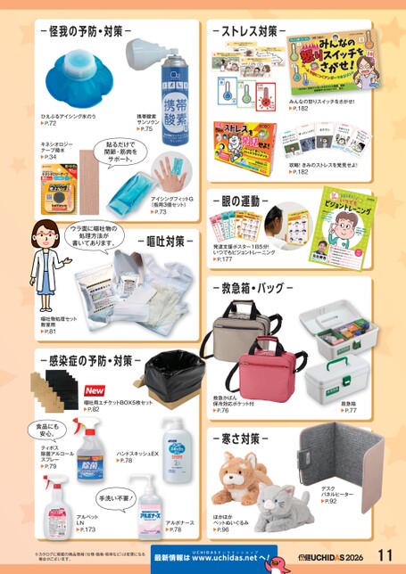 怪我の予防・対策ストレス対策ひえぷるアイシング氷のうP.72携帯酸素サンソクンP.75キネシオロジーテープ撥水P.34貼るだけで関節・筋肉をサポート。みんなの怒りスイッチをさがせ!P.182攻略!きみのストレスを発見せよ!P.182ウラ面に嘔吐物の処理方法が書いてあります。アイシングフィットG(指用3個セット)P.73眼の運動嘔吐対策発達支援ポスター1日5分!いつでもビジョントレーニングP.177救急箱・バッグ嘔吐物処理セット教室用P.81感染症の予防・対策食品にも安心。ティポス除菌アルコールスプレーP.79嘔吐用エチケットBOX5枚セットP.82ハンドスキッシュEXP.78手洗い不要!救急かばん保冷対応ポケット付P.76寒さ対策救急箱P.77デスクパネルヒーターP.92アルペットLNP.173アルボナースP.78ほかほかペットぬいぐるみP.96※カタログに掲載の商品情報(仕様・価格・税率など)は変更になる場合がございます。最新情報はUCHwIDASww.uchidas.netへ!202611