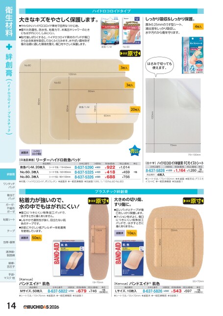 大きなキズをやさしく保護します。●やわらかいハイドロコロイド素材で自然なつけ心地。●優れた防菌性、防水性、粘着力で、お風呂やシャワーのときにもはがれにくく、しみにくい。●貼付後しばらくすると、ハイドロコロイド素材のパッドが傷口から出る体液を吸収して白くふくらみます。水やばい菌を防ぎ傷の治癒に適した環境を整え、傷口をやさしく保護します。ハイドロコロイドタイプしっかり吸収&しっかり保護。厚み0.25mmのうす型シート、浸出液をしっかり吸収し、水や汚れから傷を守ります。4枚入救急バンMNo.60ほぼ原寸3枚入はさみで切っても使えます。75mm75×100mm100mm20枚入60mm19mm救急バンM60mm100mmNo.6080mm3枚入80mmNo.80滅菌済ハイドロコロイド素材[白十字]ハイドロコロイド絆創膏FCモイストシートお申込番号8-637-58284枚入商品種別M価税抜¥1,200税抜価格税込価格¥1,164¥1,280単位1袋(4枚入)●シート寸法/75×100mm●未滅菌●販売名:プラスモイストHC●一般医療機器●包装数:1ほぼ原寸35mm45mm[日進医療器]リーダーハイドロ救急パッド商品種別お申込番号税抜価格シート寸法/19×60mm救急バンM、20枚入No.60、3枚入No.80、3枚入●材質/ハイドロコロイド、ポリウレタン●滅菌済●一般医療機器●包装数:1(M)、1/10(No.60・No.80)8-637-53908-637-53258-637-5326¥922¥418¥688シート寸法/60×80mmシート寸法/80×100mm¥420¥690単位1箱税込価格¥1,014¥459¥756M価税抜¥950大きめの切り傷、すり傷に。●広いパッドとテープが傷口をしっかり保護します。●クッション性がよく、傷口につきにくい特殊加工パッドで、はがすときに痛くありません。滅菌済10枚入ほぼ原寸13mm26mmプラスチック絆創膏粘着力が強いので、水の中でもはがれにくい!●傷口につきにくい特殊加工パッドで、はがすときに痛くありません。●しなやかで通気性が良く、目立たない肌色のテープです。●お肌にやさしい低アレルギー性粘着剤を使用しています。滅菌済50枚入[Kenvue]バンドエイド®肌色商品種別Mサイズ、50枚入●シート寸法/19×76mm●滅菌済●一般医療機器●包装数:18-637-5822¥700¥679お申込番号M価税抜税抜価格19×76mm税込価格¥746単位1箱(50枚入)2026[Kenvue]バンドエイド®肌色商品種別Lサイズ、10枚入●シート寸法/55×70mm●滅菌済●一般医療機器●包装数:18-637-5826¥560¥543お申込番号M価税抜税抜価格55×70mm税込価格¥597単位1箱(10枚入)衛生材料絆創膏(ハイドロコロイド・プラスチック)絆創膏ワンタッチワンタッチパッドパッド傷当てパッドガーゼ・ガーゼ・不織布ガーゼガーゼ粘着シートテープ包帯・眼帯清浄綿・脱脂綿脱脂綿綿棒・舌圧子手袋・マスク他マス14