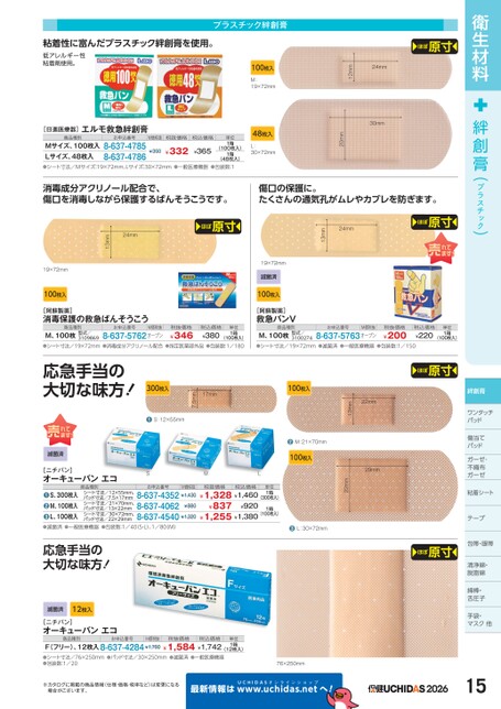 衛生材料絆創膏(プラスチック)絆創膏ワンタッチワンタッチパッドパッド傷当てパッドドガーゼ・ガーゼ・不織布布ガーゼガーゼ粘着シートーテープ包帯・眼帯清浄綿・脱脂綿脱脂綿綿棒・舌圧子手袋・マスク他ク他ほぼ原寸ほぼ原寸22mm13mm29mm22mm100枚入●M:21×70mm100枚入[阿蘇製薬]救急バンV商品種別お申込番号M価税抜税抜価格M、100枚型式/●シート寸法/19×72mm●滅菌済●一般医療機器●包装数:1/1508-637-5763オープン¥2003100274税込価格¥220単位1箱(100枚入)プラスチック絆創膏ほぼ原寸24mm12mm30mm20mm100枚入M:19×72mm48枚入L:30×72mm粘着性に富んだプラスチック絆創膏を使用。低アレルギー性粘着剤使用。[日進医療器]エルモ救急絆創膏商品種別お申込番号M価税抜税抜価格税込価格Mサイズ、100枚入Lサイズ、48枚入●シート寸法/Mサイズ:19×72mm、Lサイズ:30×72mm●一般医療機器●包装数:18-637-47858-637-4786¥332¥365¥3501箱(48枚入)(100枚入)単位1箱ほぼ原寸24mm13mmほぼ原寸24mm13mm消毒成分アクリノール配合で、傷口を消毒しながら保護するばんそうこうです。傷口の保護に。たくさんの通気孔がムレやカブレを防ぎます。19×72mm100枚入19×72mm滅菌済100枚入[阿蘇製薬]消毒保護の救急ばんそうこう商品種別お申込番号M価税抜税抜価格M、100枚型式/(100枚入)●シート寸法/19×72mm●消毒成分アクリノール配合●指定医薬部外品●包装数:1/1808-637-5762オープン¥3463109869税込価格¥380単位1箱●S:12×55mm17mm7.5mm応急手当の大切な味方!300枚入滅菌済●滅菌済●一般医療機器●包装数:1/40(S・L)、1/80M)●L:30×72mm応急手当の大切な味方!滅菌済12枚入[ニチバン]オーキューバンエコ商品種別お申込番号M価税抜税抜価格税込価格(フリー)、12枚入8-637-4284¥1,760¥1,584¥1,742F●シート寸法/76×250mm●パッド寸法/30×250mm●滅菌済●一般医療機器●包装数:1/20単位1箱(12枚入)76×250mmSMLお申込番号M価税抜税抜価格税込価格シート寸法/12×55mm、パッド寸法/7.5×17mmシート寸法/21×70mm、パッド寸法/13×22mmシート寸法/30×72mm、パッド寸法/22×29mm8-637-4352¥1,4308-637-40628-637-4540¥1,320¥880¥1,328¥1,460¥920¥1,255¥1,380¥837単位1箱(300枚入)1箱(100枚入)[ニチバン]オーキューバンエコ商品種別S、300枚入M、100枚入L、100枚入●●●※カタログに掲載の商品情報(仕様・価格・税率など)は変更になる場合がございます。最新情報はUCHIDASww.uchidas.netwへ!202615