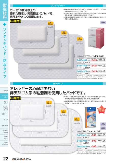 ワンタッチパッドS50枚入シート寸法50×80mm滅菌済L25枚入シート寸法80×120mm[ニチバン]お申込番号カテリーパッドマイルドM価税抜税抜価格税込価格8-637-4968¥2,500¥2,425¥2,667単位1箱(50枚入)商品種別S、50枚入8-637-4969¥2,500¥2,425¥2,6671箱(50枚入)商品種別M、50枚入8-637-4970¥2,500¥2,425¥2,6671箱(25枚入)商品種別L、25枚入●シート寸法/S:50×80mm、M:60×100mm、L:80×120mm●パッド寸法/S:25×50mm、M:30×65mm、L40×80mm●滅菌済●一般医療機器●包装数:1M50枚入シート寸法60×100mm25mm40mm65mm30mm50mm80mm防水タイプガーゼ10枚分以上の優れた吸収力(同面積比)のパッドで、患部をやさしく保護します。ほぼ原寸●柔軟性・透湿性に優れたポリプロピレン不織布に、肌にやさしいアクリル粘着剤を塗布したドレッシング材です。●パッドにはポリエチレンネット付きのレーヨン・ポリエステル不織布を採用、縫合部や創傷面に固着しにくくなっています。●低刺激性と高固定性を高い次元で両立、皮膚に良くなじみ、はがすときの痛みも軽減しました。L4枚入シート寸法80×130mm防水タイプ滅菌済[白十字]防水ワンタッチパッドお申込番号M価税抜8-620-3021¥370税抜価格¥350税込価格¥385単位1袋(6枚入)商品種別S、6枚入8-620-3022¥530商品種別M、5枚入8-620-3023¥530商品種別L、4枚入¥508¥5581袋(5枚入)¥508¥5581袋(4枚入)●シート寸法/S:50×80mm、M:60×100mm、L:80×130mm●パッド寸法/S:25×40mm、M:35×60mm、L:45×90mm●滅菌済●一般医療機器●包装数:1/1045mmM5枚入シート寸法60×100mm25mm35mm40mm60mm90mm2026アレルギーの心配が少ない非天然ゴム系の粘着剤を使用したパッドです。ほぼ原寸●1枚ずつ滅菌済みの包装。傷口につきにくい固着防止パッドで、剥がすときの痛みや出血が少なく、やさしく保護します。●絆創膏感覚で貼れる保護・防水パッドで、発汗によるムレを抑える透湿度フィルムを採用しています。S6枚入シート寸法50×80mm衛生材料ワンタッチパッド・防水タイプ絆創膏ワンタッチパッド傷当てパッドガーゼ・ガーゼ・不織布ガーゼガーゼ粘着シートテープ包帯・眼帯清浄綿・脱脂綿脱脂綿綿棒・舌圧子手袋・マスク他マス