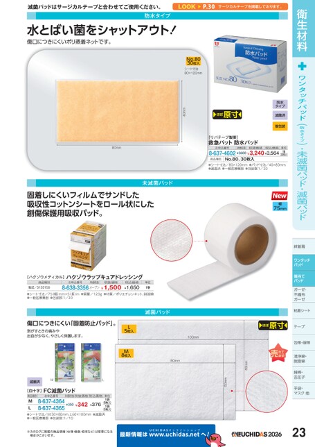 衛生材料ワンタッチパッド(防水タイプ)・未滅菌パッド・滅菌パッド絆創膏ワンタッチパッド傷当てパッドガーゼ・ガーゼ・不織布布ガーゼガーゼ粘着シートー防水タイプ滅菌済個包装ほぼ原寸40mmNo.8030枚入シート寸法80×120mm滅菌パッドはサージカルテープと合わせてご使用ください。P.30サージカルテープを掲載しております。水とばい菌をシャットアウト!傷口につきにくいポリ蒸着ネットです。防水タイプ80mm未滅菌パッド固着しにくいフィルムでサンドした吸収性コットンシートをロール状にした創傷保護用吸収パッド。[リバテープ製薬]救急パット防水パッドお申込番号M価税抜税抜価格税込価格8-637-4602¥3,600¥3,240¥3,564単位1箱(30枚入)商品種別No.80、30枚入●シート寸法/80×120mm●パッド寸法/40×80mm●滅菌済●一般医療機器●包装数:1/20幅75mmほぼ原寸テープ包帯・眼帯清浄綿・脱脂綿脱脂綿綿棒・舌圧子手袋・マスク他ク他60mm50mmへ!202623[ハクゾウメディカル]ハクゾウラップキュアドレッシング商品種別型式/3155150お申込番号M価税抜税抜価格8-638-3356オープン¥1,500税込価格¥1,650単位1巻●シート寸法/75(幅)mm×5(長)m●質量/123g●材質/ポリエチレンネット、脱脂綿●一般医療機器●包装数:1/20傷口につきにくい「固着防止パッド」。剥がすときの痛みや出血が少なく、やさしく保護します。滅菌パッドL5枚入M8枚入100mm80mm滅菌済ML[白十字]FC滅菌パッド商品種別お申込番号M価税抜税抜価格税込価格8-637-43648-637-4365ML●シート寸法/M:50×80mm、L:60×100mm●滅菌済●一般医療機器●包装数:1/10¥342¥376¥350(8枚入)1袋(5枚入)単位1袋※カタログに掲載の商品情報(仕様・価格・税率など)は変更になる場合がございます。最新情報はUCHIDASww.uchidas.netw