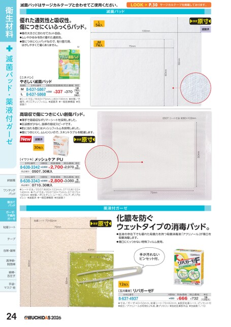 滅菌パッドはサージカルテープと合わせてご使用ください。P.30サージカルテープを掲載しております。優れた通気性と吸収性。傷につきにくいふっくらパッド。●傷の大きさに合わせてカット自由。●ムレやかゆみを防ぐ優れた通気性。●傷につきにくいパッドなので、貼り替え時、はがしやすくて痛くありません。M滅菌パッドL5枚入M7枚入100mm75mmほぼ原寸滅菌済[玉川衛材]リバガーゼFお申込番号8-637-4937(12包入)●寸法/ガーゼ:40×50mm、粘着シート:70×82mm●固定粘着シート、ピンセット付●成分/アクリノール水和物0.2%液、濃グリセリン●指定医薬部外品●包装数:1/10M価税抜¥680税抜価格¥666税込価格¥732単位1箱80mm60mm50mm0507:シート寸法:約80×103mm[ニチバン]やさしい滅菌パッド商品種別お申込番号M価税抜税抜価格税込価格¥3508-637-58678-637-5868ML(5枚入)●シート寸法/M:60×75mm、L:80×100mm●材質/不織布、ポリエチレンフィルム●滅菌済●一般医療機器●包装数:1¥337¥370(7枚入)単位1袋1袋高吸収で傷につきにくい創傷パッド。●薄手で高吸収なポリマーシートを採用しました。●圧迫感が少なく、抜群の吸収スピードです。●肌に当たる面にはメッシュフィルムを採用しました。●傷につきにくく、ムレにくいので、スキントラブルを軽減します。滅菌済30枚入ほぼ原寸[イワツキ]お申込番号メッシュケアPUM価税抜税抜価格税込価格8-638-3342¥2,800¥2,700¥2,970単位1箱(30枚入)商品種別0507、30枚入お申込番号M価税抜税抜価格税込価格8-638-3343¥2,900¥2,800¥3,080単位1箱(30枚入)商品種別0710、30枚入●シート寸法/0507:約80×103mm、0710:約103×140mm●パッド寸法/0507:50×75mm、0710:75×100mm●材質/ポリエチレン、レーヨン、パルプ、ポリプロピレン●滅菌済●一般医療機器●包装数:175mm薬液付ガーゼ粘着シート:70×82mm70mmほぼ原寸化膿を防ぐウェットタイプの消毒パッド。●血液の存在下でも優れた殺菌力を持つ殺菌消毒液「アクリノール」が傷口を殺菌消毒します。●傷口にくっつかない特殊フィルム使用。40mmガーゼ:40×50mm手が汚れないピンセット付。82mm12包入50mm2026衛生材料滅菌パッド・薬液付ガーゼ絆創膏ワンタッチワンタッチパッドパッド傷当てパッドガーゼ・不織布ガーゼ粘着シートテープ包帯・眼帯清浄綿・脱脂綿脱脂綿綿棒・舌圧子手袋・マスク他マス24