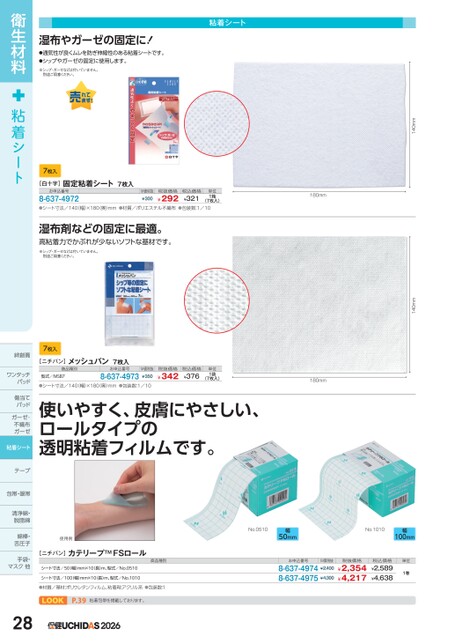 140mm140mm粘着シート湿布やガーゼの固定に!●通気性が良くムレを防ぎ伸縮性のある粘着シートです。●シップやガーゼの固定に使用します。※シップ・ガーゼなどは付いていません。別途ご用意ください。7枚入[白十字]固定粘着シート7枚入お申込番号8-637-4972M価税抜¥300税抜価格¥292税込価格¥321単位1箱(7枚入)180mm●シート寸法/140(幅)×180(奥)mm●材質/ポリエステル不織布●包装数:1/10湿布剤などの固定に最適。高粘着力でかぶれが少ないソフトな基材です。※シップ・ガーゼなどは付いていません。別途ご用意ください。7枚入[ニチバン]メッシュバン7枚入商品種別型式/MSB7お申込番号8-637-4973M価税抜¥350税抜価格¥342税込価格¥376単位1袋(7枚入)●シート寸法/140(幅)×180(奥)mm●包装数:1/10使いやすく、皮膚にやさしい、ロールタイプの透明粘着フィルムです。180mm使用例[ニチバン]カテリープTMFSロール商品種別シート寸法/50(幅)mm×10(長)m、型式/No.0510シート寸法/100幅)mm×10(長)m、型式/No.1010●材質/基材:ポリウレタンフィルム、粘着剤:アクリル系●包装数:1P.39粘着包帯を掲載しております。2026No.0510幅50mmNo.1010幅100mmお申込番号M価税抜8-637-4974¥2,4008-637-4975¥4,300税抜価格¥2,354¥4,217税込価格¥2,589¥4,638単位1巻衛生材料粘着シート絆創膏ワンタッチワンタッチパッドパッド傷当てパッドガーゼ・ガーゼ・不織布ガーゼガーゼ粘着シートテープ包帯・眼帯清浄綿・脱脂綿脱脂綿綿棒・舌圧子手袋・マスク他マス28