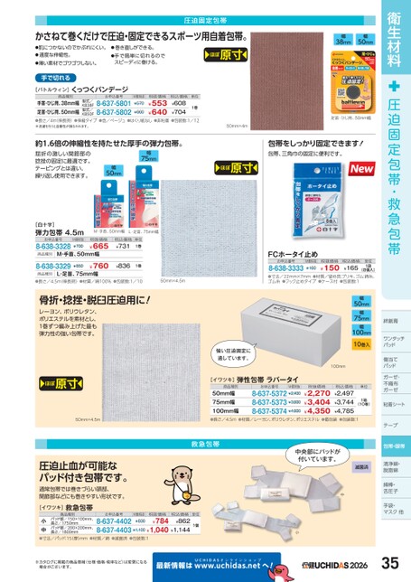衛生材料圧迫固定包帯・救急包帯絆創膏ワンタッチワンタッチパッドパッド傷当てパッドドガーゼ・ガーゼ・不織布布ガーゼガーゼ粘着シートーテープ包帯・眼帯清浄綿・脱脂綿脱脂綿綿棒・舌圧子手袋・マスク他ク他50mm×4.5m強い圧迫固定に適しています。FCホータイ止めお申込番号8-638-3333M価税抜¥160税抜価格¥150税込価格¥165単位1袋(8個入)●寸法/22mm×7mm●材質/留め具:ブリキ、ゴム:綿糸、ゴム糸●フック止めタイプ●ケース付●包装数:1幅50mm幅75mm幅100mm10巻入100mm[イワツキ]弾性包帯ラバータイM価税抜商品種別税抜価格お申込番号50mm幅75mm幅100mm幅●長さ/4.5m●材質/レーヨン、ポリウレタン、ポリエステル●個包装●包装数:18-637-5372¥2,4008-637-5373¥3,6008-637-5374¥4,600¥2,270¥3,404¥4,350税込価格¥2,497¥3,744¥4,785単位1箱(10巻)救急包帯単位1個中央部にパッドが付いています。滅菌済中※カタログに掲載の商品情報(仕様・価格・税率など)は変更になる場合がございます。最新情報はUCHIDASww.uchidas.netw小へ!202635圧迫固定包帯かさねて巻くだけで圧迫・固定できるスポーツ用自着包帯。●肌につかないのでかぶれにくい。●適度な伸縮性。●薄い素材でゴワゴワしない。●巻き直しができる。●手で簡単に切れるのでスピーディに巻ける。ほぼ原寸幅38mm幅50mm手で切れる[バトルウィン]商品種別くっつくバンデージお申込番号税抜価格単位手首・ひじ用、38mm幅足首・ひじ用、50mm幅●長さ/4m(伸長時)●伸縮タイプ●色/ベージュ●はくり紙なし●非粘着●包装数:1/12※洗濯を行うと自着性が損なわれます。8-637-58018-637-5802¥553¥640型式/KB38F型式/KB50F¥6601巻税込価格¥608¥704M価税抜¥570約1.6倍の伸縮性を持たせた厚手の弾力包帯。屈折の激しい関節部の捻挫の固定に最適です。テーピングとは違い、繰り返し使用できます。50mm75mm幅幅足首・ひじ用、50mm幅包帯をしっかり固定できます!包帯、三角巾の固定に便利です。50mm×4mほぼ原寸M・手首、50mm幅L・足首、75mm幅[白十字]弾力包帯4.5mお申込番号8-638-3328M価税抜¥700税抜価格¥665商品種別M・手首、50mm幅8-638-3329¥850¥760商品種別L・足首、75mm幅税込価格¥731単位1巻¥8361巻●長さ/4.5m(伸長時)●材質/綿100%●包装数:1/10骨折・捻挫・脱臼圧迫用に!レーヨン、ポリウレタン、ポリエステルを素材とし、1巻ずつ編み上げた最も弾力性の強い包帯です。ほぼ原寸50mm×4.5m圧迫止血が可能なパッド付き包帯です。通常包帯では巻きづらい頭部、関節部などにも巻きやすい形状です。[イワツキ]救急包帯商品種別お申込番号パッド部/150×100mm、長さ/1750mmパッド部/200×200mm、長さ/1800mm小中●寸法/パッド:15厚)mm●材質/綿●滅菌済●包装数:1税込価格8-637-4402¥8628-637-4403¥1,100¥1,040¥1,144¥784M価税抜¥830税抜価格