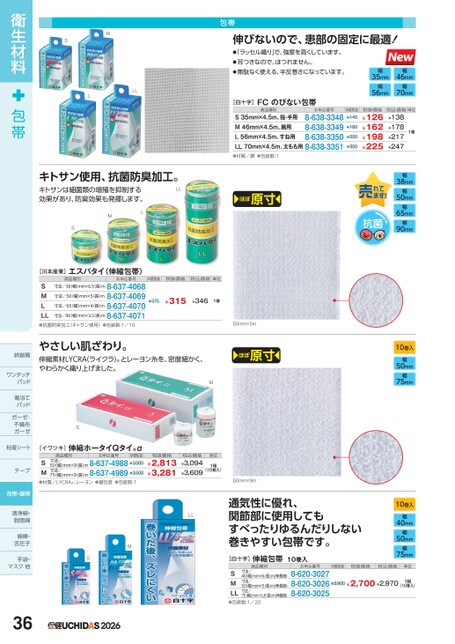 MS包帯伸びないので、患部の固定に最適!●「ラッセル織り」で、強度を高くしています。●耳つきなので、ほつれません。●無駄なく使える、半反巻きになっています。LLL[白十字]FCのびない包帯商品種別お申込番号8-638-3348S35mm×4.5m、指・手用8-638-3349M46mm×4.5m、腕用8-638-3350L56mm×4.5m、すね用LL70mm×4.5m、太もも用8-638-3351●材質/綿●包装数:1ほぼ原寸50mm×5mほぼ原寸キトサン使用、抗菌防臭加工。キトサンは細菌類の増殖を抑制する効果があり、防臭効果も発揮します。MLS[川本産業]エスパタイ(伸縮包帯)商品種別お申込番号寸法/50幅)mm×5長)m寸法/38幅)mm×6.5(長)m8-637-40688-637-40698-637-4070寸法/90幅)mm×3.5(長)m8-637-4071SMLLL●抗菌防臭加工(キトサン使用)●包装数:1/10寸法/65幅)mm×4長)mLLM価税抜税抜価格税込価格単位¥375¥315¥3461巻やさしい肌ざわり。伸縮素材LYCRA(ライクラ)とレーヨン糸を、密度細かく、やわらかく織り上げました。MS幅35mm幅56mm幅46mm幅70mmM価税抜¥140¥180¥220¥250税抜価格¥126¥162¥198¥225税込価格単位¥138¥178¥217¥2471巻幅38mm幅50mm幅65mm幅90mm抗菌10巻入幅50mm幅75mm10巻入幅40mm幅50mm幅75mm[イワツキ]伸縮ホータイQタイ®α商品種別お申込番号M価税抜寸法/50(幅)mm×9(長)m8-637-4988¥3,00075(幅)mm×9(長)m8-637-4989¥3,500SM●材質/LYCRA®、レーヨン●個包装●包装数:1寸法/MS2026税抜価格¥2,813¥3,281税込価格¥3,094¥3,609単位1箱(10巻入)50mm×9mLL通気性に優れ、関節部に使用してもすべったりゆるんだりしない巻きやすい包帯です。[白十字]伸縮包帯10巻入商品種別お申込番号寸法/寸法/40幅)mm×6長)m(伸長時)8-620-302750幅)mm×5長)m(伸長時)8-620-302675(幅)mm×3.8長)m(伸長時)8-620-3025SMLL●包装数:1/20寸法/M価税抜税抜価格税込価格単位¥2,900¥2,700¥2,9701組(10巻入)衛生材料包帯絆創膏ワンタッチワンタッチパッドパッド傷当てパッドガーゼ・ガーゼ・不織布ガーゼガーゼ粘着シートテープ包帯・眼帯清浄綿・脱脂綿脱脂綿綿棒・舌圧子手袋・マスク他マス36