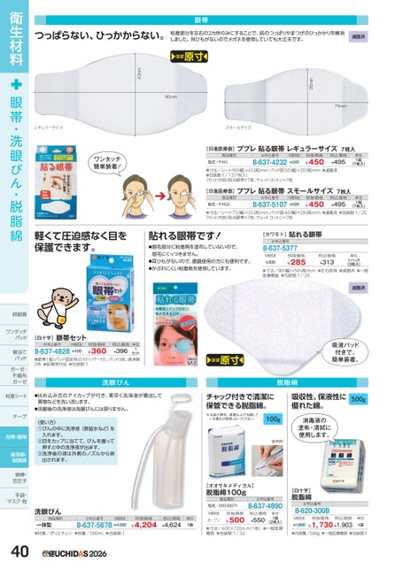 75mm35mmほぼ原寸90mm43mmつっぱらない、ひっかからない。粘着部分を左右の2カ所のみにすることで、肌のつっぱりやまつげのひっかかりを解消しました。耳ひもがないのでメガネを使用していても大丈夫です。滅菌済眼帯レギュラーサイズスモールサイズワンタッチ簡単装着!軽くて圧迫感なく目を保護できます。[日進医療器]ププレ貼る眼帯レギュラーサイズ7枚入商品種別型式/P-HGお申込番号8-637-4232M価税抜¥500税抜価格¥450税込価格¥495単位1箱(7枚入)●寸法/シート:90幅)×43(高)mm、パッド部:50(幅)×30(高)mm●滅菌済●包装数:1/12(7枚入)〈セット内容〉貼る眼帯×7枚、ウェットコットン×7枚[日進医療器]ププレ貼る眼帯スモールサイズ7枚入商品種別型式/P-HGSお申込番号8-637-5107M価税抜¥500税抜価格¥450税込価格¥495(7枚入)●寸法/シート:75幅)×35(高)mm、パッド部:40(幅)×28(高)mm●滅菌済●包装数:1/20〈セット内容〉貼る眼帯×7枚、ウェットコットン×7枚単位1箱貼れる眼帯です!●眉毛部分に粘着剤を塗布していないので、眉毛にくっつきません。●耳ひもがないので、眼鏡使用の方にも便利です。●かぶれにくい粘着剤を使用しています。貼れる眼帯[カワモト]お申込番号8-637-5377M価税抜¥300税抜価格¥285税込価格¥313単位1パック(3枚入)●寸法/90幅)×50高)mm●左右両用●滅菌済●一般医療機器●包装数:1/20滅菌済[白十字]眼帯セットお申込番号M価税抜8-637-4828¥400セット●眼帯1個(パッド固定用のストッパー付)、パッド3枚、清浄綿2枚●医薬部外品●包装数:11単位税込価格¥396税抜価格¥360ほぼ原寸吸液パッド付きで、簡単装着。洗眼びん脱脂綿●はめ込み式のアイカップが付き、素早く洗浄液が噴出して異物などを洗い流します。●洗眼後の洗浄液は洗眼びんには戻りません。〈使い方〉入れます。①びんの中に洗浄液(蒸留水など)を②目をカップに当てて、びんを握って押すと中の洗浄液が出ます。③洗浄後の液は外側のノズルから排出されます。チャック付きで清潔に保管できる脱脂綿。※包装が開封、破損および汚損している場合は使用しないでください。100g使用例吸収性、保液性に優れた綿。500g消毒液の塗布・清拭に使用します。[オオサキメディカル]脱脂綿100g商品種別型式/00030071お申込番号8-637-4890税抜価格¥4,204税込価格¥4,624単位1個税抜価格¥500M価税抜オープン(2枚入)●寸法/600×720mm(1枚)●一般医療機器●包装数:1/32税込価格¥550単位1袋[白十字]脱脂綿お申込番号8-620-3008M価税抜¥1,900税抜価格税込価格¥1,730¥1,903単位1袋●内容量/500g●一般医療機器●包装数:1洗眼びん商品種別お申込番号M価税抜一体型●材質/ポリエチレン●容量/500mL●包装数:18-637-5678¥4,3002026衛生材料眼帯・洗眼びん・脱脂綿絆創膏ワンタッチワンタッチパッドパッド傷当てパッドガーゼ・ガーゼ・不織布ガーゼガーゼ粘着シートテープ包帯・眼帯清浄綿・脱脂綿綿棒・舌圧子手袋・マスク他マス40