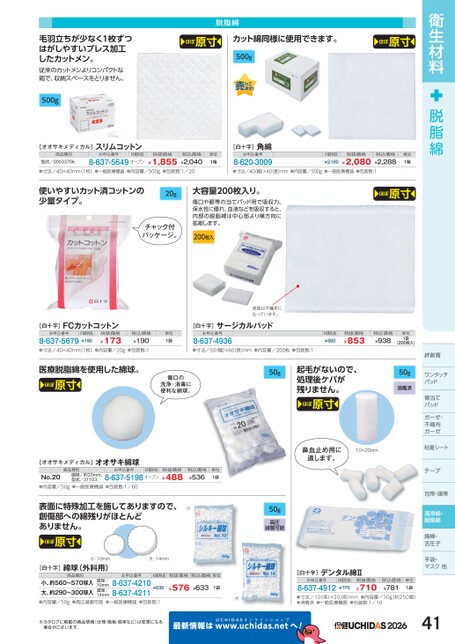 衛生材料脱脂綿絆創膏ワンタッチワンタッチパッドパッド傷当てパッドドガーゼ・ガーゼ・不織布布ガーゼガーゼ粘着シートーテープ包帯・眼帯清浄綿・脱脂綿綿棒・舌圧子手袋・マスク他ク他脱脂綿ほぼ原寸カット綿同様に使用できます。ほぼ原寸500g毛羽立ちが少なく1枚ずつはがしやすいプレス加工したカットメン。従来のカットメンよりコンパクトな箱で、収納スペースをとりません。500g[オオサキメディカル]スリムコットン商品種別型式/00033706お申込番号M価税抜8-637-5649オープン税抜価格¥1,855税込価格¥2,040単位1箱[白十字]角綿お申込番号8-620-3009M価税抜¥2,180税抜価格¥2,080税込価格¥2,288単位1箱●寸法/40×40mm(1枚)●一般医療機器●内容量/500g●包装数:1/20●寸法/40(幅)×40長)mm●内容量/500g●一般医療機器●包装数:1使いやすいカット済コットンの少量タイプ。20gチャック付パッケージ。大容量200枚入り。傷口や眼帯の当てパッド用で吸収力、保水性に優れ、血液などを吸収すると、内部の脱脂綿は中心部より横方向に拡散します。200枚入ほぼ原寸表面は不織布になっています。[白十字]FCカットコットンM価税抜お申込番号8-637-5679¥190税込価格¥190●寸法/40×40mm(1枚)●内容量/20g●包装数:1¥173税抜価格単位1袋[白十字]サージカルパッドお申込番号8-637-4936●寸法/50(幅)×60(長)mm●内容量/200枚●包装数:1M価税抜¥880税抜価格¥853税込価格¥938単位1袋(200枚入)医療脱脂綿を使用した綿球。ほぼ原寸傷口の洗浄・消毒に便利な綿球。[オオサキメディカル]オオサキ綿球商品種別お申込番号M価税抜No.20●内容量/50g●一般医療機器●包装数:1/60直径/約20mm、型式/311038-637-5198オープン税抜価格¥488税込価格¥536単位1袋50g起毛がないので、処理後ケバが残りません。ほぼ原寸50g消毒済鼻血止め用に適します。10×20mm表面に特殊加工を施してありますので、創傷部への綿残りがほとんどありません。ほぼ原寸小50g高圧滅菌可能小:10mm大:14mm[白十字]綿球(外科用)商品種別お申込番号M価税抜小、約560〜570球入大、約290〜300球入●内容量/50g●高圧滅菌可能●一般医療機器●包装数:18-637-42108-637-4211直径/10mm直径/14mm¥630税抜価格税込価格単位¥576¥6331袋[白十字]デンタル綿Ⅱお申込番号8-637-4912M価税抜¥770税抜価格¥710税込価格¥781単位1袋大●寸法/10(径)×20(高)mm●内容量/50g約250個)●消毒済●一般医療機器●包装数:1/10※カタログに掲載の商品情報(仕様・価格・税率など)は変更になる場合がございます。最新情報はUCHIDASww.uchidas.netwへ!202641