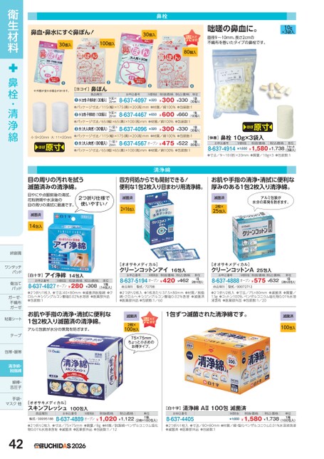 鼻血・鼻水にすぐ鼻ぽん!30個入100個入鼻栓30個入咄嗟の鼻血に。直径9〜10mm、長さ2cmの不織布を巻いたタイプの鼻栓です。10g×3袋入80個入●※外観が変わる場合があります。小:9×20mm大:11×20mmほぼ原寸●[ヨコイ]鼻ぽん商品種別●小(女性・子供向き)(30個入)9(径)×20mm●●お申込番号8-637-4097M価税抜¥320税抜価格¥300税込価格¥330単位1袋(30個入)●パッケージ寸法/115(幅)×175(奥)×20(高)mm●材質/綿100%●包装数:1●小(女性・子供向き)100個入)9(径)×8-637-4467¥600¥660¥65020mm1箱(100個入)●パッケージ寸法/65(幅)×65(奥)×100(高)mm●材質/綿100%●包装数:1●大(大人向き)(30個入)11径)×8-637-4096¥300¥330¥32020mm1袋(30個入)ほぼ原寸●パッケージ寸法/115(幅)×175(奥)×20(高)mm●材質/綿100%●包装数:1●8-637-4567オープン¥475大(大人向き)(80個入)11径)×¥52220mm1箱(80個入)●パッケージ寸法/65(幅)×65(奥)×100(高)mm●材質/綿100%●包装数:1[伸秦]鼻栓10g×3袋入お申込番号8-637-4914M価税抜¥1,650税抜価格税込価格¥1,580¥1,738単位1セット(3袋入)●寸法/9〜10(径)×20mm●質量/10g×3●包装数:1目の周りの汚れを拭う滅菌済みの清浄綿。目やにや点眼前後の清拭、花粉時期や水泳後の目の周りの清拭に最適です。2つ折り仕様で使いやすい!滅菌済14包入清浄綿四方何処からでも開封できる!便利な1包2枚入り目まわり用清浄綿。お肌や手指の清浄・清拭に便利な厚みのある1包2枚入り清浄綿。滅菌済2×16包入滅菌済2枚×25包入アルミ包装が水分の蒸発を防ぎます。[白十字]アイ浄綿14包入お申込番号M価税抜税抜価格8-637-4827オープン¥280(14包入)●2つ折り1枚入●寸法:40×80mm●滅菌済脱脂綿●クロルヘキシジングルコン酸塩0.02%水溶液●医薬部外品●包装数:1税込価格¥308単位1箱[オオサキメディカル]クリーンコットンアイ16包入[オオサキメディカル]クリーンコットンA25包入お申込番号M価税抜税抜価格8-637-5194オープン¥420税込価格¥462単位1箱(2枚×16包入)お申込番号M価税抜税抜価格税込価格8-637-4888オープン¥575¥632単位1箱(2枚×25包入)商品種別型式/72708商品種別型式/00072712●2つ折り2枚入●1枚あたり:37.5×80mm●材質/脱脂綿・クロルヘキシジングルコン酸塩0.02%含浸●滅菌済●医薬部外品●包装数:1/60●2つ折り2枚入●寸法/75×80mm●滅菌済●質量/13g●コットン100%、ベンザルコニウム塩化物0.01%水溶液含有●医薬部外品●包装数:1/20お肌や手指の清浄・清拭に便利な1包2枚入り滅菌済の清浄綿。アルミ包装が水分の蒸発を防ぎます。滅菌済2枚×100包入1包ずつ滅菌された清浄綿です。滅菌済100包入75×75mmちょっと小さめのお得タイプ。[オオサキメディカル]スキンフレッシュ100包入商品種別お申込番号M価税抜税抜価格税込価格型式/000951888-637-4889オープン¥1,020¥1,122(2枚×100包入)●2つ折り2枚入●寸法/75×75mm●質量/8g●材質/脱脂綿・ベンザルコニウム塩化物0.01%水溶液含有●滅菌済●医薬部外品●包装数:1/12単位1箱2026[白十字]清浄綿AⅡ100包滅菌済お申込番号8-637-4405M価税抜税抜価格¥1,660¥1,580¥1,738税込価格単位1箱(100包入)●2つ折り1枚入●寸法/80×80mm●材質/綿・塩化ベンザルコニウム0.01%水溶液含浸●滅菌済●医薬部外品●包装数:1衛生材料鼻栓・清浄綿絆創膏ワンタッチワンタッチパッドパッド傷当てパッドガーゼ・ガーゼ・不織布ガーゼガーゼ粘着シートテープ包帯・眼帯清浄綿・脱脂綿綿棒・舌圧子手袋・マスク他マス42