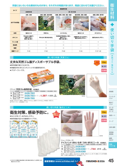 衛生材料使い切り手袋(天然ゴム・塩化ビニル)絆創膏ワンタッチワンタッチパッドパッド傷当てパッドドガーゼ・ガーゼ・不織布布ガーゼガーゼ粘着シートーテープ包帯・眼帯清浄綿・脱脂綿脱脂綿綿棒・舌圧子手袋・マスク他[ショーワグローブ]ナイスハンドきれいな手つかいきりビニール100枚入商品種別お申込番号M価税抜税抜価格税込価格単位手のひらまわり/19cm、手のひらまわり/17cm、型式/49017920431448-636-8367型式/49017920431518-636-8368型式/49017920431688-636-8369SML●全長/23cm●厚み/約0.05mm●材質/塩化ビニル、非フタル酸エステル系可塑剤●色/半透明●調理使用不可●包装数:1/10オープン¥744手のひらまわり/21cm、(100枚入)¥8181箱※カタログに掲載の商品情報(仕様・価格・税率など)は変更になる場合がございます。最新情報はUCHIDASww.uchidas.netwへ!202645手袋にはいろいろな素材のものがあり、それぞれの特長があります。用途に合わせてお選びください。家庭用手袋使い切り手袋清掃、園芸、衛生管理配膳、調理、清掃、衛生・検診衛生管理、清掃、園芸配膳、調理、軽作業天然ゴムニトリルゴム塩化ビニルポリエチレンタイプ炊事用手袋炊事、清掃おすすめ用途材質ポイントフィット感耐油性強度掲載ページ塩化ビニルやわらかい素材で、作業しやすい。洗剤・油に強い。△◯◯P.45やわらかく弾力性がある。引き裂きや突き刺しに強く、破れにくい。洗剤・油に強い。◎△◎P.45◯◎◎P.46使い切り手袋(天然ゴム)丈夫な天然ゴム製ディスポーサブル手袋。●素手感覚で使えて丈夫です。●伸縮性があり手にピッタリフィットする極薄手袋です。●パウダーフリーです。[アトム]天然ゴム極薄手袋100枚入商品種別お申込番号M価税抜税抜価格税込価格単位型式/319-100、掌幅/85mm、中指の長さ/76mm型式/319-100、掌幅/95mm、中指の長さ/80mm型式/319-100、掌幅/106mm、中指の長さ/82mmSML●全長/約24cm●厚み/掌部:0.1mm以上、指部:0.12mm以上●材質/天然ゴム●パウダーフリー●包装数:1/208-636-79538-636-79548-636-7955¥1,387¥1,525オープン1箱(100枚入)使い切り手袋(塩化ビニル)衛生対策、感染予防に。●ゆとりがあって、ぬぎはめしやすい。●素手感覚が活かせる極薄手タイプです。比較的手になじみやすく、脱ぎはめもしやすい。脱ぎはめがしやすい。△◯◯P.45×◯△P.47・48使用例100枚入使い切り左右兼用100枚入使い切り左右兼用使用例