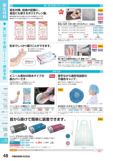 使い切り手袋(ポリエチレン)衛生対策、給食の配膳に。食品にも使えるポリエチレン製。●素手感覚で活かせる薄さの0.025mm極薄手タイプです。●内面にエンボス加工を施すことで、ベタつきを緩和します。100枚入使い切り左右兼用食品衛生法適合お申込番号8-637-25208-637-25218-637-2522[ショーワグローブ]きれいな手つかいきりポリエチレン100枚入使用例商品種別SML手のひらまわり/24.5cm、型式/4901792044189手のひらまわり/27.5cm、型式/4901792044196手のひらまわり/28.5cm、型式/4901792044202M価税抜オープン税抜価格¥310税込価格¥341単位1箱(100枚入)●全長/27.5cm●厚み/0.025mm●材質/ポリエチレン●加工/内面エンボス加工●調理使用可●包装数:1/30肘までしっかり覆うことができます。●ズレ落ちにくいゴム袖付き。●介護・掃除・炊事などに。左右兼用食品衛生法適合30枚入使い切り全長58cmのロングタイプ。[オオサキメディカル]使い捨て介護用手袋ロング透明フリー30枚入使用例商品種別お申込番号M価税抜税抜価格型式/000702078-637-0800オープン透明(30枚入)●全長/58cm●手のひらの幅/14cm●厚み/0.11mm●材質/ポリエチレン、天然ゴムラテックス(肌に直接触れる部分には不使用)●包装数:1/20¥928税込価格¥1,020単位1箱ビニール素材の防水タイプの腕カバーです。防水素材の腕カバー、手首側はゴムバンドが2重になっておりズレ落ちを防止します。感染予防厚手ながら通気性抜群の不織布キャップ。●ポリプロピレン不織布のディスポキャップ。●ラテックスフリーのゴムを使用。使用例100枚入[アトム]ビニール腕カバークリア商品種別型式/C313クリアお申込番号M価税抜8-637-0818オープン税抜価格¥360税込価格¥396単位1双●寸法/全長400±10mm×190幅)×80下口幅)×80上口幅)mm●質量/60g●材質/本体:ポリ塩化ビニル、ゴム紐:天然ゴム●防水仕様●包装数:1/200WiSMディスポキャップ(厚手)ブルー商品種別型式/WDCT-Bお申込番号M価税抜8-637-5668¥1,200税抜価格¥1,091税込価格¥1,200(100枚入)●寸法/約29(径)cm●質量/3g●材質/ポリプロピレン不織布、合成ゴム●サイズ/フリー●包装数:1/10単位1箱使用例首から掛けて簡単に装着できます。50枚入720mm1200mmブルーピンクホワイトブルーピンク[ムトウ]プラスチックエプロン商品種別お申込番号M価税抜税抜価格税込価格単位ホワイトブルーピンク●寸法/720(幅)mm●着丈/1200mm●材質/ポリエチレン●包装数:1/148-637-46408-637-46418-637-4642¥1,364¥1,500¥1,5001箱(50枚入)P.105・106白衣・エプロンを掲載しております。2026衛生材料使い切り手袋(ポリエチレン)・感染予防絆創膏ワンタッチワンタッチパッドパッド傷当てパッドガーゼ・ガーゼ・不織布ガーゼガーゼ粘着シートテープ包帯・眼帯清浄綿・脱脂綿脱脂綿綿棒・舌圧子手袋・マスク他48