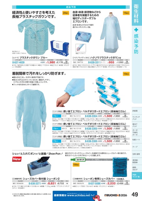 衛生材料感染予防絆創膏ワンタッチワンタッチパッドパッド傷当てパッドドガーゼ・ガーゼ・不織布布ガーゼガーゼ粘着シートーテープ包帯・眼帯清浄綿・脱脂綿脱脂綿綿棒・舌圧子手袋・マスク他感染予防経済性と使いやすさを考えた長袖プラスチックガウンです。20枚入血液・体液・排泄物などから従事者を保護するための袖付ディスポーザブルエプロンです。血液・体液などの水分や菌を通さないポリエチレン製。15枚入袖を伸ばした状態での長さ1740mm親指フックタイプ1100mm[ムトウ]プラスチックガウンブルーお申込番号8-637-4639M価税抜¥2,200税抜価格¥1,980税込価格¥2,178単位1箱(20枚入)●寸法/袖を伸ばした状態:1740幅)mm●着丈/1100mm●袖口ゴム入●材質/ポリエチレン●包装数:1(15枚入)●寸法/着丈:1050±5mm、エプロン幅:約970±5mm、袖を伸ばした状態:1790±5mm、親指穴間:1745±5mm●袖口親指フックタイプ●材質/ポリエチレン●包装数:1/18[ハクゾウメディカル]ハクゾウプラスチックガウンα商品種別型式/3087735お申込番号M価税抜8-638-3311オープン税抜価格¥955税込価格¥1,050単位1箱着脱簡単で汚れをしっかり防ぎます。●畳み方を工夫し、すばやく着用が可能です。●肩口に切れ込みが入っているため、着脱がしやすく、エプロンの汚れが顔や衣服に付着しにくいです。●フィット性を求めた3サイズ展開です。10枚入SML[ミドリ安全]使い捨てエプロンベルデポリガードエプロン(長袖袖口ゴム)税込価格¥1,650単位1箱商品種別お申込番号M価税抜税抜価格Sサイズブルー●寸法/260(幅)×150(奥)×100高)mm●質量/540g●寸法/着丈:1050mm、身幅:800mm、裄丈:820mm●対応身長目安/〜155cm●袖口ゴムタイプ●材質/ポリエチレン(エンボス加工)●包装数:1/208-638-3304¥3,000型式/No.1211-S¥1,500(10枚入)[ミドリ安全]使い捨てエプロンベルデポリガードエプロン(長袖袖口ゴム)商品種別お申込番号M価税抜税抜価格Mサイズブルー●寸法/260(幅)×150(奥)×100高)mm●質量/570g●寸法/着丈:1100mm、身幅:860mm、裄丈:870mm●対応身長目安/155〜165cm●袖口ゴムタイプ●材質/ポリエチレン(エンボス加工)●包装数:1/208-638-3305¥3,000型式/No.1211-M¥1,500(10枚入)[ミドリ安全]使い捨てエプロンベルデポリガードエプロン(長袖袖口ゴム)税込価格¥1,650単位1箱商品種別お申込番号M価税抜税抜価格Lサイズブルー●寸法/260(幅)×150(奥)×100高)mm●質量/600g●寸法/着丈:1200mm、身幅:920mm、裄丈:900mm●対応身長目安/165cm〜●袖口ゴムタイプ●材質/ポリエチレン(エンボス加工)●包装数:1/20※本製品は使い捨て商品です。再使用はお止めください。※本製品は未滅菌です。8-638-3306¥3,000型式/No.1211-L¥1,500(10枚入)税込価格¥1,650単位1箱シュッ!と入れてポンッ!と装着!Shoe-Pon!踏むだけワンタッチでシューズカバーを装着できる便利なシューズカバー取付器です。靴をカバーしたいさまざまなシーンで活躍します。詰め替え用シューポン専用シューズカバー100枚入[三和製作所]シューズカバー取付器シューポン2商品種別型式/00366030お申込番号M価税抜8-638-3371¥9,800税抜価格¥8,821税込価格¥9,703単位1台[三和製作所]商品種別型式/00035270シューポン専用シューズカバー100枚入お申込番号M価税抜8-637-5086¥2,480税抜価格¥2,233税込価格¥2,456単位1袋(100枚入)●寸法/215(幅)×420(奥)×130(高)mm●質量/1.35kg●材質/プラスチック、ポリプロピレン●包装数:1●適応シューズ目安/30cmまで●材質/ポリエチレン●包装数:1※カタログに掲載の商品情報(仕様・価格・税率など)は変更になる場合がございます。最新情報はUCHIDASww.uchidas.netwへ!202649