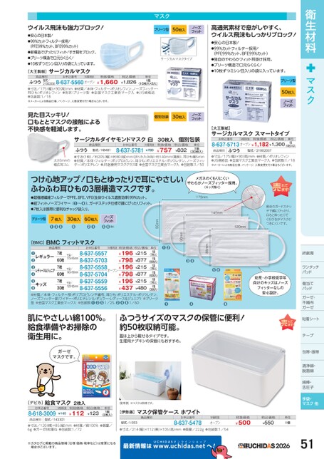 衛生材料マスク絆創膏ワンタッチワンタッチパッドパッド傷当てパッドドガーゼ・ガーゼ・不織布布ガーゼガーゼ粘着シートーテープ包帯・眼帯清浄綿・脱脂綿脱脂綿綿棒・舌圧子手袋・マスク他ウイルス飛沫も強力ブロック!●安心の日本製!●99%カットフィルター採用!(PFE99%カット、BFE99%カット)●新構造でぴったりフィット!すき間をブロック。●プリーツ構造で口元らくらく!●10枚ずつミシン目入りの袋に入っています。[大王製紙]サージカルマスクマスクプリーツ型50枚入ノーズフィットサージカルマスクタイプ高通気素材で息がしやすく、ウイルス飛沫もしっかりブロック!●安心の日本製!●99%カットフィルター採用!(PFE99%カット、BFE99%カット)●独自のやわらかフィット耳掛け採用。●プリーツ構造で口元らくらく!●10枚ずつミシン目入りの袋に入っています。商品種別お申込番号M価税抜税抜価格210020368-637-5560オープンふつう型式/(10枚入×5入)●寸法/175幅)×90(高)mm●材質/本体・フィルター:ポリオレフィン、ノーズフィッター・耳ひも:ポリオレフィン●形状:プリーツ型●全国マスク工業会マーク入●JIS規格品●包装数:1/18※メーカーによる商品仕様、パッケージ、入数変更を行う場合もございます。¥1,660税込価格¥1,826単位1箱見た目スッキリ!口もととマスクの接触による不快感を軽減します。個別包装30枚入ノーズフィットサージカルダイヤモンドマスク白30枚入個別包装商品種別お申込番号税抜価格型式/H84818-637-5781ふつう●寸法(1枚)/約205(幅)×約80(縦)mm(折りたたみ時)・約140mm(最長)、耳ひも幅5mm●材質/本体・フィルター:ポリプロピレン、耳ひも:ポリエステル・ポリウレタン、ノーズフィッター:ポリエチレン●JIS医療用マスククラスⅢ●全国マスク工業会マーク入●包装数:1/50(30枚入)¥757税込価格¥832単位1箱M価税抜¥780太さ5mmの幅広耳ゴムプリーツ型50枚入ノーズフィット[大王製紙]サージカルマスクスマートタイプお申込番号M価税抜税抜価格税込価格8-637-5713オープン¥1,182¥1,300単位1箱(10枚入×5入)商品種別ふつう型式/21002037●寸法/175幅)×90高)mm●材質/ポリオレフィン●JIS規格品●全国マスク工業会マーク入●包装数:1/18※メーカーによる商品仕様、パッケージ、入数変更を行う場合もございます。メガネのくもりにくいやわらかノーズフィッター採用。(キッズ除く)175mm145mm斜めのガードステッチで顔にぴったり、口もとゆったりでくちびるがマスクにつきにくいです。120mmつけ心地アップ!口もとゆったりで耳にやさしいふわふわ耳ひもの3層構造マスクです。●超極細繊維フィルターでPFE、BFE、VFE生体ウイルス遮断効率)99%カット。●超フィットノーズワイヤー(●〜●)、ガードステッチ仕様で顔にぴったりフィット。●7枚入は携帯に便利なチャック袋入り。95mmプリーツ型7枚入●●●30枚入60枚入●●●ノーズフィット●●除く幼児・小学校低学年向けのキッズはノーズフィッターなしの安心設計。●●85mm●●90mm●●●●●7枚60枚7枚60枚7枚30枚寸法/175×95mm寸法/145×90mm寸法/120×85mmお申込番号8-637-55578-637-57038-637-55588-637-57048-637-55598-637-5556M価税抜税抜価格税込価格¥215¥877¥215¥877¥215¥480¥196¥798¥196¥798¥196¥437オープン単位1袋(7枚入)(60枚入)(7枚入)(60枚入)(7枚入)1箱1袋1箱1袋1箱レギュラーレディース&ジュニアキッズ●●●●●●(30枚入)●材質/本体・フィルター部:ポリプロピレン不繊布、耳ひも:ポリエステル・ポリウレタン、ノーズフィッター部:ワイヤー・ポリエチレン(レギュラー・レディース&ジュニア)●プリーツ型●全国マスク工業会マーク入●包装数:❶❸❺1/25、❷❹❻1/60[BMC]BMCフィットマスク商品種別肌にやさしい綿100%。給食準備やお掃除の衛生用に。ふつうサイズのマスクの保管に便利!約50枚収納可能。蓋は上から載せるタイプです。生理用ナプキンの保管にもおすすめ。ガーゼマスクです。[デビカ]給食マスク2枚入お申込番号8-618-3009M価税抜¥140税抜価格¥112商品種別型式/143301税込価格¥123単位1組(2枚入)●寸法/120(横)×85(縦)mm●材質/綿100%●質量/6g●ガーゼ8枚重ね●包装数:1/72使用例※マスクは別売です。[伊勢藤]マスク保管ケースホワイト商品種別型式/I-593お申込番号8-637-5478M価税抜オープン税抜価格¥500税込価格¥550単位1個●寸法/214(幅)×112(奥)×105(高)mm●質量/222g●包装数:1/54※カタログに掲載の商品情報(仕様・価格・税率など)は変更になる場合がございます。最新情報はUCHIDASww.uchidas.netwへ!202651