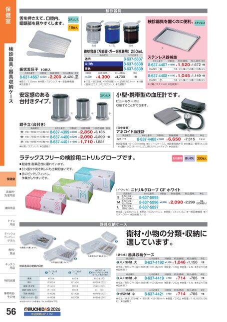 舌を押さえて、口腔内、咽頭部を見やすくします。ステンレス10枚入検診器具検診器具を置くのに便利。ステンレス板状舌圧子10枚入お申込番号8-637-4667¥2,320M価税抜税抜価格税込価格¥2,200¥2,420透明ルリ色茶色M価税抜¥4,800単位1組(10枚入)税抜価格¥4,300税込価格¥4,730単位1個透明ルリ色茶色綿球容器(万能壺・ガーゼ瓶兼用)250mL商品種別お申込番号8-637-58378-637-58388-637-5839大大小ステンレス器械皿お申込番号M価税抜税抜価格税込価格単位8-637-4407¥1,600¥1,520¥1,6721個商品種別寸法/210(幅)×150奥)×10高)mm8-637-4408¥1,100¥1,045¥1,1491個商品種別寸法/215(幅)×115奥)×10高)mm●長さ/125mm●材質/ステンレス●一般医療機器●包装数:1●寸法/約78(径)×約90高)mm、内径:約63mm●材質/容器:ガラス、ふた:ステンレス●包装数:1●材質/ステンレス●包装数:1安定感のある台付きタイプ。ステンレス小型・携帯型の血圧計です。ビニールケースに収納することができます。大中小鉗子立(台付き)商品種別お申込番号M価税抜税抜価格税込価格寸法/90(径)×155(高)mm8-637-4399¥3,000¥2,850¥3,135寸法/75(径)×120(高)mm8-637-4400¥2,200¥2,090¥2,299寸法/60(径)×100(高)mm8-637-4401¥1,800¥1,710¥1,881大中小●材質/ステンレス●包装数:1単位1個[田中産業]アネロイド血圧計商品種別型式/YAお申込番号M価税抜8-637-4468¥7,000税抜価格¥6,650税込価格¥7,315単位1セット●測定範囲/0〜300mmHg●ビニールケース入●医療用具許可●付属品/腕帯(大人用145(幅)×500(長)mm)、ゴム球(スクリュータイプ)●包装数:1ラテックスフリーの検診用ニトリルグローブです。●耐油性・耐薬品性に優れています。●引っ張りや突き刺しにも比較的強いです。●手にピッタリフィットし、作業がしやすいです。左右兼用使い切り200枚入[イワツキ]ニトリルグローブCFホワイト商品種別お申込番号M価税抜税抜価格税込価格単位手のひら幅/80±10mm手のひら幅/95±10mm手のひら幅/110±10mmSML●全長/230mm以上●厚み/0.05mm以上●材質/ニトリルゴム●一般医療機器●パウダーフリー●包装数:1/108-637-58958-637-58968-637-5897¥2,090¥2,299(200枚入)¥2,2001箱●器具収納ケース衛材・小物の分類・収納に適しています。●※鼻鏡は付属しません。検診器具収納数の目安※耳鏡は付属しません。●※歯鏡他は付属しません。●スノコ付き大●スノコ付き小●仕切付き小(カッコ内は仕切りをはずした場合の数)鼻鏡探針歯鏡(普及型)歯鏡(高級・玉付)耳鏡(朝顔型)耳鏡(トレルチー型)約30本約300本約150本約110本約400個約480個※仕切りを付けての保管は、サイズの関係で不可。2026本誌掲載はP.1161約15本約150本約80本約60本約180個約220個約15本(20)約150本(200)約80本(120)※-(100)約150個(200)約180個(240)[錦化成]器具収納ケース商品種別お申込番号M価税抜税抜価格税込価格スノコ付き、大●●寸法/外形:275幅)×185奥)×84高)mm●質量/330g●容量/2.6L●水切り可能●包装数:18-637-4192¥1,100¥1,046¥1,150単位1個商品種別お申込番号税抜価格スノコ付き、小●●寸法/外形:275幅)×185奥)×50高)mm●質量/292g●容量/1.4L●水切り可能●包装数:18-637-4419¥714税込価格¥785単位1個M価税抜¥750商品種別お申込番号税抜価格仕切付き、小●●寸法/外形:275(幅)×185(奥)×50高)mm●質量/292g●容量/1.4L仕切り2枚付)●包装数:18-637-4421¥714税込価格¥785単位1個M価税抜¥750保健室検診器具・器具収納ケース保健室洗面所・洗面洗濯用品洗濯用清掃用品清掃用品トイレトイ用品用ティッシュティッペーパー・タオルタオル飲料・飲料・食品食キッチンキッチン用品用特別支援特別支事務用品・事務用品・その他その他56