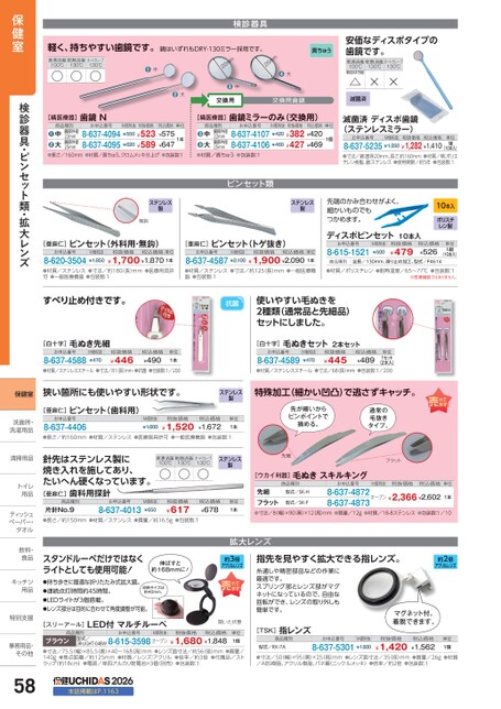 検診器具軽く、持ちやすい歯鏡です。鏡はいずれもDRY-130ミラー採用です。煮沸消毒100℃○乾熱消毒130℃○オートクレーブ130℃○●中●大25mm22●中交換用真ちゅうmm●大安価なディスポタイプの歯鏡です。煮沸消毒100℃数回は可能△乾熱消毒130℃オートクレーブ130℃××交換用歯鏡滅菌済単位1個滅菌済ディスポ歯鏡(ステンレスミラー)お申込番号M価税抜税抜価格税込価格8-637-5235¥1,350¥1,282¥1,410(10本入)●寸法/鏡:直径20mm、長さ:約160mm●材質/柄:ポリエチレン樹脂、鏡:ステンレス●使用期限/約5年●包装数:1単位1組[橘医療器]歯鏡ミラーのみ(交換用)お申込番号8-637-41078-637-4106M価税抜税抜価格税込価格¥420¥382¥420¥460¥427¥469商品種別鏡部外径22mm鏡部外径25mm中大●●●材質/真ちゅう●包装数:1ピンセット類お申込番号8-637-40948-637-4095M価税抜税抜価格¥550¥523¥620¥589単位1本税込価格¥575¥647●●長さ/160mm●材質/真ちゅう、クロムメッキ仕上げ●包装数:1鏡部外径22mm鏡部外径25mm中大●商品種別[橘医療器]歯鏡Nステンレス製無鈎ステンレス製先端のかみ合わせがよく、細かいものでもつかめます。10本入ポリスチレン製[亜麻仁]ピンセット(外科用・無鈎)お申込番号8-620-3504M価税抜¥1,850税抜価格税込価格単位¥1,700¥1,8701本[亜麻仁]ピンセット(トゲ抜き)お申込番号8-637-4587¥2,100¥1,900¥2,0901本M価税抜税抜価格税込価格単位ディスポピンセット10本入お申込番号8-615-1521M価税抜¥500税抜価格¥479税込価格¥526単位1組(10本入)商品種別全長/130mm、滑り止め加工、型式/P4614●材質/ステンレス●寸法/約180(長)mm●医療用具許可●一般医療機器●包装数:1●材質/ステンレス●寸法/約125(長)mm●一般医療機器●包装数:1●材質/ポリスチレン●耐熱温度/65〜77℃●包装数:1※医療機器ではありません。抗菌使いやすい毛ぬきを2種類(通常品と先細品)セットにしました。[白十字]毛ぬき先細お申込番号8-637-4588M価税抜¥470税抜価格¥446税込価格¥490単位1本[白十字]毛ぬきセット2本セットお申込番号8-637-4589M価税抜¥470税抜価格¥445税込価格¥489単位1セット(2本入)●材質/ステンレススチール●寸法/81長)mm●抗菌●包装数:1/200●材質/ステンレススチール●寸法/68長)mm●包装数:1/200狭い箇所にも使いやすい形状です。[亜麻仁]ピンセット(歯科用)お申込番号8-637-4406M価税抜¥1,600税抜価格¥1,520ステンレス製特殊加工(細かい凹凸)で逃さずキャッチ。税込価格¥1,672単位1本先が細いからピンポイントで摘める。通常の毛抜きタイプ。●長さ/約160mm●材質/ステンレス●医療器具許可●一般医療機器●包装数:1針先はステンレス製に焼き入れを施してあり、たいへん硬くなっています。[亜麻仁]歯科用探針商品種別お申込番号煮沸消毒100℃○乾熱消毒130℃○オートクレーブ130℃○ステンレス製片針No.9●長さ/約150mm●材質/ステンレス●質量/約16.5g●包装数:18-637-4013¥617税抜価格M価税抜¥650税込価格¥678単位1本先細フラット[ウカイ利器]毛ぬきスキルキング商品種別お申込番号M価税抜税抜価格税込価格単位型式/SK-H先細フラット●寸法/8幅)×90(奥)×12(高)mm●質量/12g●材質/18-8ステンレス●包装数:1/108-637-4872オープン¥2,366¥2,6028-637-4873型式/SK-F1本拡大レンズスタンドルーペだけではなくライトとしても使用可能!伸ばすと約168mmに!約3倍アクリルレンズ●持ち歩きに最適な折りたたみ式拡大鏡。●連続点灯時間約45時間。●LEDライトが3個搭載。●レンズ部分は目的に合わせて角度調整が可能。収納サイズは約40mm。[スリーアール]LED付マルチルーペ開いた状態商品種別お申込番号M価税抜税抜価格税込価格型式/3R-LIGHT-04BW8-615-3598オープン¥1,680¥1,848ブラウン●寸法/75.5幅)×85.5(奥)×40〜168(高)mm●レンズ面寸法/約56(径)mm●質量/140g●焦点距離/約125mm●材質/レンズ:アクリル●倍率/約3倍●付属品/ストラップ(約18cm)●電源/単四アルカリ乾電池×3個(別売)●包装数:1単位1個2026本誌掲載はP.1163指先を見やすく拡大できる指レンズ。約2倍アクリルレンズ糸通しや精密部品などの作業に最適です。スプリング部とレンズ部がマグネットになっているので、自由な回転ができ、レンズの取り外しも簡単です。[TSK]指レンズ商品種別型式/RX-7Aお申込番号M価税抜8-637-5301¥1,500マグネット付。着脱できます。税抜価格¥1,420税込価格¥1,562単位1個●寸法/50(幅)×95(奥)×25(高)mm●レンズ面寸法/35(径)mm●質量/26g●材質/ABS樹脂、アクリル樹脂、バネ鋼(ニッケルメッキ)●倍率/約2倍●包装数:1保健室検診器具・ピンセット類・拡大レンズ保健室洗面所・洗面洗濯用品洗濯用清掃用品清掃用品トイレトイ用品用ティッシュティッペーパー・タオルタオル飲料・飲料・食品食キッチンキッチン用品用特別支援特別支事務用品・事務用品・その他その他58