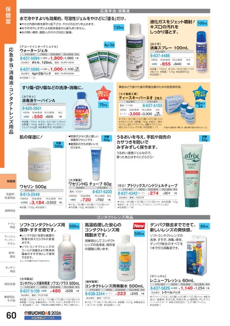 応急手当・消毒液水で冷やすよりも効果的。可溶性ジェルをやけどに「塗る」だけ。●やけど内部の熱を素早く低下させ、やけどの広がりを止めます。●水での冷やしすぎによる低体温症の心配もありません。●水の無い場所、複数人のやけど対応に最適。120mL液化ガスをジェット噴射!キズ口の汚れをしっかり落とす。100mL[アコードインターナショナル]ウォータージェルお申込番号M価税抜税抜価格税込価格8-637-5094¥1,800¥1,800¥1,980商品種別ボトル、120mL型式/WJP0120HA4g×3包単位1本8-637-5095¥1,000¥1,000¥1,1001袋(3包入)商品種別4g×3包パック型式/WJP0340HA●包装数:1/24[白十字]消毒スプレー100mLお申込番号8-637-4488M価税抜¥900税抜価格¥855税込価格¥940単位1本●容量/100mL●寸法/約40径)×150(高)mm●質量/125g●医薬部外品●包装数:1すり傷・切り傷などの洗浄・消毒に。事故などで抜けた歯の再植治療のための救急保存液。[カワモト]消毒液ケーパインAお申込番号8-620-3501M価税抜¥600税抜価格¥550税込価格¥605単位1本●容量/75mL●寸法/62×38×118mm●質量/100g●成分/塩化ベンザルコニウム37.5mg他●医薬部外品●包装数:1肌の保湿に!容量500g75mL[ネオ製薬工業]ティースキーパーネオ2本入商品種別型式/11106お申込番号8-637-5103単位1箱M価税抜オープン税抜価格税込価格¥3,000¥3,300(2本入)●寸法/82(長)×42(幅)×65(高)mm●40mL×2本●質量/90g●成分/塩化カリウム、塩化マグネシウム、硫酸マグネシウム、塩化カルシウムその他●包装数:1/540mL×2本※抜けた歯を持つ際には、歯の根の部分を持たないこと。●刺激が少なく肌に優しい保護用ワセリンです。●敏感肌の方もお使いいただけます。容量60gうるおいを与え、手肌や指先のカサつきを防いでみずみずしく保ちます。うるおい浸透ジェルなので、使ったあとはすぐにさらさら!容量50gワセリン500gお申込番号8-615-2549M価税抜¥3,350税抜価格税込価格¥3,184¥3,502●容量/500g●包装数:1[大洋製薬]ワセリンHGチューブ60g商品種別型式/23221お申込番号8-637-5220単位1本M価税抜¥800税抜価格¥720税込価格¥792単位1本●寸法/38幅)×30奥)×150高)mm●内容量/60g●包装数:1/100[花王]アトリックスハンドジェルチューブお申込番号M価税抜8-637-4342オープン税抜価格¥274税込価格¥301単位1本商品種別型式/745279●寸法/48(幅)×30(奥)×131(高)mm●内容量/50g●成分/水、エタノール、グリセリン、ジメチコンなど●包装数:1/96ソフトコンタクトレンズ用保存・すすぎ液です。500mL●レンズや目に有害な雑菌の繁殖を抑えた0.9%の食塩水です。●ソフトコンタクトレンズのコールド消毒および煮沸消毒後のすすぎ液として使用できます。※レンズを消毒するものではありません。コンタクトレンズ用品高温処理した安心のコンタクトレンズ用精製水です。溶解剤としてコンタクトレンズの洗浄液、保存液の調製に用います。500mL60mLタンパク除去までできて、新しいレンズの爽快感。ソフトコンタクトレンズの洗浄、すすぎ、消毒、保存、タンパク除去のすべてを1本で行う消毒液です。[大洋薬品]コンタクトレンズ保存用液ソフコンプラス500mLお申込番号8-637-5109M価税抜¥600税抜価格¥480税込価格¥528単位1本商品種別型式/TCLZ-500●容量/500mL●寸法/70(幅)×70(奥)×180(高)mm●質量/550g●構成成分/0.9%NaCl、添加物:ゼオライト●包装数:1/25※開封後は冷蔵庫で保管の上、早めにご使用ください。2026本誌掲載はP.1165[健栄製薬]コンタクトレンズ用精製水500mLお申込番号M価税抜8-638-3344オープン税抜価格¥223税込価格¥245単位1本商品種別型式/12712●寸法/71(径)×186(高)mm●質量/557g●構成成分/水(イオン交換)●包装数:1/20[ボシュロム]レニューフレッシュ60mLお申込番号M価税抜税抜価格税込価格8-637-5829¥1,200¥1,140¥1,254単位1本商品種別トラベルパック●パッケージ寸法/66(幅)×44(奥)×142(高)mm●配合成分/緩衝剤、安定化剤、等張化剤、ph調整剤、ポロキサミン、ハイドラネート●表示指定成分/エデト酸ナトリウム●包装数:1保健室応急手当・消毒液・コンタクトレンズ用品保健室洗面所・洗面洗濯用品洗濯用清掃用品清掃用品トイレトイ用品用ティッシュティッペーパー・タオルタオル飲料・飲料・食品食キッチンキッチン用品用特別支援特別支事務用品・事務用品・その他その他60