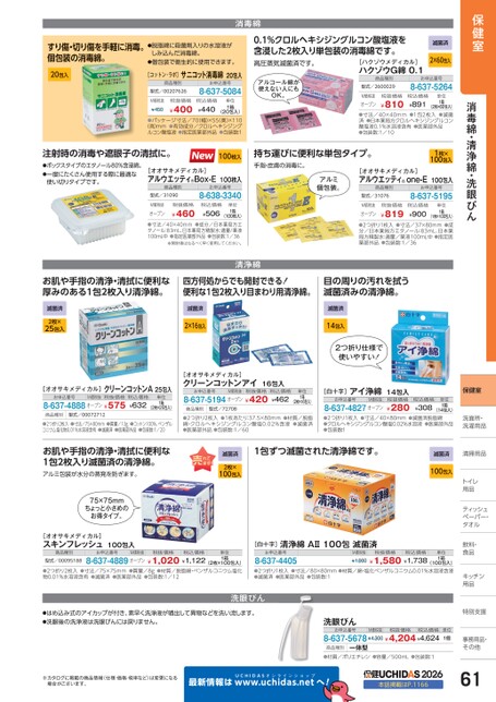 保健室消毒綿・清浄綿・洗眼びん保健室洗面所・面所・洗濯用品濯用品トイレイ用品品ティッシュシュペーパー・パー・タオルタオル飲料・飲料・食品品キッチンキッチン用品品特別支援別支援事務用品・事務用品・その他その他すり傷・切り傷を手軽に消毒。個包装の消毒綿。20包入●脱脂綿に殺菌剤入りの水溶液がしみ込んだ消毒綿。●個包装で衛生的に使用できます。[コットン・ラボ]サニコット消毒綿20包入商品種別型式/00207626お申込番号8-637-5084M価税抜¥450税抜価格¥400税込価格¥440(20包入)●パッケージ寸法/70(幅)×55(奥)×110(高)mm●有効成分/クロルヘキシジングルコン酸塩液●指定医薬部外品●包装数:1単位1箱消毒綿0.1%クロルヘキシジングルコン酸塩液を含浸した2枚入り単包装の消毒綿です。高圧蒸気滅菌済です。[ハクゾウメディカル]ハクゾウG綿0.1滅菌済2×60包入アルコール綿が使えない人にもOK。商品種別型式/2600029お申込番号8-637-5264単位1箱税抜価格¥810税込価格M価税抜¥891オープン(2枚×60包入)●寸法/40×40mm●1包2枚入●滅菌済●日本薬局方クロルヘキシジングルコン酸塩液0.1%水溶液含有●医薬部外品●包装数:1/101枚×100包入[オオサキメディカル]アルウエッティone-E100包入商品種別型式/31076お申込番号8-637-5195注射時の消毒や遮眼子の清拭に。●ボックスタイプのエタノール80%含浸綿。●一度にたくさん使用する際に最適な使い切りタイプです。100枚入持ち運びに便利な単包タイプ。[オオサキメディカル]アルウエッティ®Box-E100枚入商品種別型式/31090お申込番号8-638-3340手指・皮膚の消毒に。アルミ個包装。単位1箱M価税抜オープン税抜価格¥460税込価格¥506(100枚入)●寸法/40×40mm●成分/日本薬局方エタノール:83mL、日本薬局方精製水:適量/薬液100mL中●指定医薬部外品●包装数:1/36※開封後はなるべく早く使用してください。単位1箱M価税抜オープン税抜価格¥819税込価格¥900(1枚×100包入)●2つ折り1枚入●寸法/37×80mm●成分/日本薬局方エタノール:83mL、日本薬局方精製水:適量/薬液100mL中●指定医薬部外品●包装数:1/36お肌や手指の清浄・清拭に便利な厚みのある1包2枚入り清浄綿。四方何処からでも開封できる!便利な1包2枚入り目まわり用清浄綿。目の周りの汚れを拭う滅菌済みの清浄綿。清浄綿滅菌済2枚×25包入滅菌済2×16包入滅菌済14包入2つ折り仕様で使いやすい![オオサキメディカル]クリーンコットンアイ16包入お申込番号M価税抜税抜価格8-637-5194オープン¥420税込価格¥462単位1箱(2枚×16包入)商品種別型式/72708[白十字]アイ浄綿14包入お申込番号M価税抜8-637-4827オープン税抜価格¥280税込価格¥308単位1箱(14包入)●2つ折り2枚入綿・クロルヘキシジングルコン酸塩0.02%含浸●滅菌済●医薬部外品●包装数:1/60●1枚あたり:37.5×80mm●材質/脱脂●2つ折り1枚入●寸法/40×80mm●クロルヘキシジングルコン酸塩0.02%水溶液●医薬部外品●包装数:1●滅菌済脱脂綿滅菌済2枚×100包入1包ずつ滅菌された清浄綿です。滅菌済清掃用品清掃用品100包入[オオサキメディカル]クリーンコットンA25包入お申込番号8-637-4888オープン¥575M価税抜税抜価格税込価格¥632単位1箱(2枚×25包入)商品種別型式/00072712●2つ折り2枚入●寸法/75×80mm●質量/13g●コットン100%、ベンザルコニウム塩化物0.01%水溶液含有●滅菌済●医薬部外品●包装数:1/20お肌や手指の清浄・清拭に便利な1包2枚入り滅菌済の清浄綿。アルミ包装が水分の蒸発を防ぎます。75×75mmちょっと小さめのお得タイプ。[オオサキメディカル]スキンフレッシュ100包入商品種別型式/00095188お申込番号M価税抜税抜価格税込価格8-637-4889オープン¥1,020¥1,122単位1箱お申込番号8-637-4405(2枚×100包入)●材質/脱脂綿・ベンザルコニウム塩化●2つ折り2枚入●寸法/75×75mm●質量/8g物0.01%水溶液含有●滅菌済●医薬部外品●包装数:1/12●2つ折り1枚入●寸法/80×80mm●材質/綿・塩化ベンザルコニウム0.01%水溶液含浸●滅菌済●医薬部外品●包装数:1M価税抜税抜価格¥1,660¥1,580¥1,738税込価格単位1箱(100包入)[白十字]清浄綿AⅡ100包滅菌済●はめ込み式のアイカップが付き、素早く洗浄液が噴出して異物などを洗い流します。●洗眼後の洗浄液は洗眼びんには戻りません。洗眼びん洗眼びんお申込番号商品種別一体型8-637-5678¥4,300¥4,204¥4,624M価税抜税抜価格税込価格単位1個※カタログに掲載の商品情報(仕様・価格・税率など)は変更になる場合がございます。最新情報はUCHIDASww.uchidas.netw●材質/ポリエチレン●容量/500mL●包装数:1へ!2026本誌掲載はP.116661