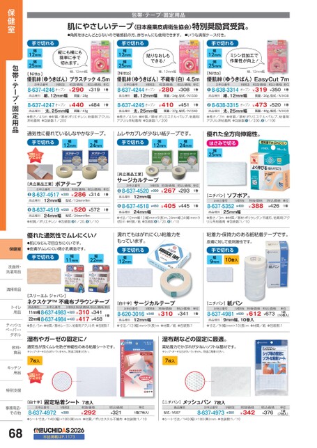 包帯・テープ・固定用品肌にやさしいテープ〈日本産業皮膚衛生協会〉特別奨励賞受賞。●角質をほとんどとらないので敏感肌の方、赤ちゃんにも使用できます。●いつも清潔ケース付き。手で切れる幅12mm幅25mm縦にも横にも簡単に手で切れます。手で切れる幅12mm幅25mm貼りなおしもできる![Nitto]優肌絆(ゆうきばん)プラスチック4.5m細、12mm幅[Nitto]優肌絆(ゆうきばん)不織布(白)4.5m細、12mm幅税抜価格¥290税込価格¥319単位1巻お申込番号M価税抜商品種別8-637-4246オープン細、12mm幅8-637-4247オープン商品種別太、25mm幅質量/28g¥440質量/43g¥4841巻お申込番号M価税抜商品種別8-637-4244オープン細、12mm幅8-637-4245オープン太、25mm幅商品種別税抜価格¥280税込価格¥308単位1巻質量/24g、型式/N1330¥410¥4511巻質量/37g、型式/N1340手で切れる幅12mm幅ミシン目加工で作業性が向上!25mm[Nitto]優肌絆(ゆうきばん)EasyCut7m細、12mm幅お申込番号M価税抜8-638-3314オープン細、12mm幅8-638-3315オープン太、25mm幅●商品種別●商品種別税抜価格¥319税込価格単位¥3501巻質量/26g、型式/N1438¥473¥5201巻質量/48g、型式/N1439●長さ/4.5m●材質/基材:ポリエチレン、粘着剤:アクリル系粘着剤●包装数:1/200●長さ/4.5m●材質/基材:ポリエステル・パルプ、粘着剤:アクリル系粘着剤●包装数:1/200●長さ/7m●材質/基材:ポリエステル・パルプ、粘着剤:アクリル系粘着剤●包装数:❶1/200、❷1/100通気性に優れているしなやかなテープ。ムレやカブレが少ない紙テープです。手で切れる幅12mm幅24mm手で切れる幅12mm幅24mm優れた全方向伸縮性。はさみで切る幅25mm[共立薬品工業]ポアテープお申込番号●商品種別8-637-451712mm幅8-637-451924mm幅●商品種別M価税抜¥300税抜価格¥286税込価格¥314単位1巻型式/12mm×9m¥550¥520¥5721巻型式/24mm×9m●材質/ポリエチレン●包装数:❸1/20、❹1/10優れた通気性でムレにくい!●肌になじんで目立ちにくいです。●皮膚がムレにくい微小孔構造です。手で切れる幅11mm幅22mm[スリーエムジャパン]ネクスケアTM不織布ブラウンテープ商品種別お申込番号M価税抜税抜価格税込価格単位11mm幅8-637-4983¥320¥310¥34122mm幅8-637-4984¥430¥417¥4581巻[共立薬品工業]サージカルテープお申込番号●商品種別8-637-452012mm幅8-637-451824mm幅●商品種別M価税抜¥300¥450税抜価格¥267税込価格¥293単位1巻¥405¥4451巻[ニチバン]ソフポア®お申込番号8-637-5352M価税抜¥400税抜価格¥388税込価格¥426単位1巻商品種別25mm幅●寸法/12mm幅:12(幅)mm×9長)m、24mm幅:24幅)mm×9(長)m●材質/紙●包装数:❺1/20、❻1/10●長さ/3m●材質/基材:ポリウレタン不織布、粘着剤:アクリル系粘着剤●包装数:1/10濡れてもはがれにくい粘着力をもっています。粘着力・保持力のある紙粘着テープです。皮膚に対して低刺激性です。手で切れる幅12mm手で切れる幅10巻入9mm[白十字]サージカルテープお申込番号8-620-3016M価税抜¥340税抜価格¥310商品種別12mm幅税込価格¥341単位1巻[ニチバン]紙バンお申込番号8-637-4981M価税抜¥630税抜価格¥612税込価格¥673単位1箱(10巻入)商品種別9mm幅、10巻入●長さ/5m●材質/基材:ーヨン、粘着剤:アクリル系●包装数:1●寸法/12(幅)mm×9(長)m●材質/紙●包装数:1●寸法/9幅)mm×10(長)m●材質/紙●包装数:1湿布やガーゼの固定に!通気性が良くムレを防ぎ伸縮性のある粘着シートです。※シップ・ガーゼなどは付いていません。別途ご用意ください。7枚入湿布剤などの固定に最適。高粘着力でかぶれが少ないソフトな基材です。※シップ・ガーゼなどは付いていません。別途ご用意ください。7枚入[白十字]固定粘着シート7枚入お申込番号8-637-4972M価税抜¥300税抜価格¥292税込価格¥321単位1箱(7枚入)[ニチバン]メッシュバン7枚入商品種別型式/MSB7お申込番号8-637-4973M価税抜¥350税抜価格¥342税込価格¥376単位1袋(7枚入)●シート寸法/140(幅)×180(奥)mm●材質/ポリエステル不織布●包装数:1/10●シート寸法/140(幅)×180(奥)mm●包装数:1/102026本誌掲載はP.1173保健室包帯・テープ・固定用品保健室洗面所・洗面洗濯用品洗濯用清掃用品清掃用品トイレトイ用品用ティッシュティッペーパー・タオルタオル飲料・飲料・食品食キッチンキッチン用品用特別支援特別支事務用品・事務用品・その他その他