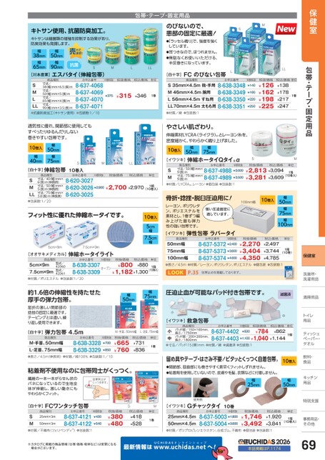 保健室包帯・テープ・固定用品保健室洗面所・面所・洗濯用品濯用品通気性に優れ、関節部に使用してもすべったりゆるんだりしない巻きやすい包帯です。10巻入幅40mm幅50mm幅75mm[白十字]伸縮包帯10巻入S商品種別寸法/40幅)mm×6(長)m(伸長時)寸法/50幅)mm×5(長)m(伸長時)寸法/75幅)mm×3.8(長)m(伸長時)SMLL●包装数:1/20お申込番号8-620-30278-620-30268-620-3025MLLM価税抜税抜価格税込価格単位¥2,900¥2,700¥2,9701組(10巻入)10巻入5cm幅7.5cm幅5cm×9m7.5cm×9m商品種別[オオサキメディカル]伸縮ホータイライト8-638-3307オープン8-638-33095cm×9m7.5cm×9m●材質/ポリエステル●包装数:1/20型式/42060型式/42061お申込番号M価税抜税抜価格¥800税込価格¥880¥1,182¥1,300単位1箱(10巻入)やさしい肌ざわり。伸縮素材LYCRA(ライクラ)とレーヨン糸を、密度細かく、やわらかく織り上げました。10巻入幅幅50mm75mm[イワツキ]伸縮ホータイQタイ®αS商品種別お申込番号寸法/50幅)mm×9(長)m寸法/75幅)mm×9(長)mSM●材質/LYCRA®、レーヨン●個包装●包装数:18-637-49888-637-4989M価税抜¥3,000¥3,500税抜価格税込価格¥2,813¥3,094¥3,281¥3,609M単位1箱(10巻入)骨折・捻挫・脱臼圧迫用に!強い圧迫固定に適しています。レーヨン、ポリウレタン、ポリエステルを素材とし、1巻ずつ編み上げた最も弾力性の強い包帯です。[イワツキ]弾性包帯ラバータイ100mm幅10巻入幅50mm幅75mm幅100mmM価税抜商品種別税抜価格お申込番号50mm幅75mm幅100mm幅●長さ/4.5m●材質/レーヨン、ポリウレタン、ポリエステル●個包装●包装数:18-637-5372¥2,4008-637-5373¥3,6008-637-5374¥4,600¥2,270¥3,404¥4,350税込価格¥2,497¥3,744¥4,785単位1箱(10巻)P.35包帯止めを掲載しております。P.35約1.6倍の伸縮性を持たせた厚手の弾力包帯。幅50mm幅75mm圧迫止血が可能なパッド付き包帯です。滅菌済清掃用品清掃用品屈折の激しい関節部の捻挫の固定に最適です。テーピングとは違い、繰り返し使用できます。[白十字]弾力包帯4.5m商品種別お申込番号M・手首、50mm幅L・足首、75mm幅●長さ/4.5m(伸長時)●材質/綿100%●包装数:1/108-638-33288-638-3329¥850M価税抜¥700L・足首、75mm幅M・手首、50mm幅税抜価格¥665¥760税込価格¥731¥836単位1巻粘着剤不使用なのに包帯同士がくっつく。繊維の一本一本がらせん状のバネになっているので生地全体が伸縮し、激しい動きにもやわらかくフィット。包帯同士がくっつきます。[白十字]FCワンタッチ包帯お申込番号商品種別25mm×3mSM●材質/不織布(フェリベンディ®)●包装数:18-637-41218-637-412250mm×3mM価税抜¥430¥540税抜価格¥380¥480S税込価格¥418¥528M単位1巻小[イワツキ]救急包帯商品種別パッド部/150×100mm、長さ/1750mmパッド部/200×200mm、長さ/1800mm小中●寸法/パッド:15(厚)mm中お申込番号税込価格8-637-4402¥8628-637-4403¥1,100¥1,040¥1,144¥784M価税抜¥830税抜価格●材質/綿●滅菌済●包装数:1単位1個トイレイ用品品ティッシュシュペーパー・パー・タオルタオル留め具やテープ・はさみ不要!ピタッとくっつく自着包帯。●関節部、屈曲部にも巻きやすく素早くフィットしずれません。●粘着剤を使用していないので、皮膚や毛髪、衣類などに付着しません。幅25mm使用例Gチャックタイ10巻[イワツキ]商品種別お申込番号M価税抜税抜価格25mm×4.5m50mm×4.5m●材質/ポリプロピレンエラスタン、合成ゴム、不織布●個包装●包装数:18-637-5003¥1,8008-637-5004¥3,600¥1,746¥3,492税込価格¥1,920¥3,84110巻入飲料・飲料・食品品幅50mmキッチンキッチン用品品特別支援別支援事務用品・事務用品・その他その他単位1箱(10巻入)※カタログに掲載の商品情報(仕様・価格・税率など)は変更になる場合がございます。最新情報はUCHIDASww.uchidas.netwへ!2026本誌掲載はP.117469キトサン使用、抗菌防臭加工。キトサンは細菌類の増殖を抑制する効果があり、防臭効果も発揮します。幅38mm幅65mm幅50mm幅抗菌90mmエスパタイ(伸縮包帯)S[川本産業]寸法/38(幅)mm×6.5長)m寸法/50(幅)mm×5長)m寸法/65(幅)mm×4長)m寸法/90(幅)mm×3.5長)mSMLLL●抗菌防臭加工(キトサン使用)●包装数:1/108-637-40688-637-40698-637-40708-637-4071商品種別お申込番号M価税抜税抜価格税込価格単位¥375¥315¥3461巻包帯・テープ・固定用品のびないので、患部の固定に最適!MS●「ラッセル織り」で、強度を強くしています。●耳つきなので、ほつれません。●無駄なくお使いいただける、半反巻きになっています。[白十字]FCのびない包帯MLLLLLL商品種別お申込番号8-638-3348S35mm×4.5m指・手用8-638-3349M46mm×4.5m腕用8-638-3350L56mm×4.5mすね用LL70mm×4.5m太もも用8-638-3351M価税抜¥140¥180¥220¥250税抜価格¥126¥162¥198¥225税込価格単位¥138¥178¥217¥2471巻●材質/綿●包装数:1