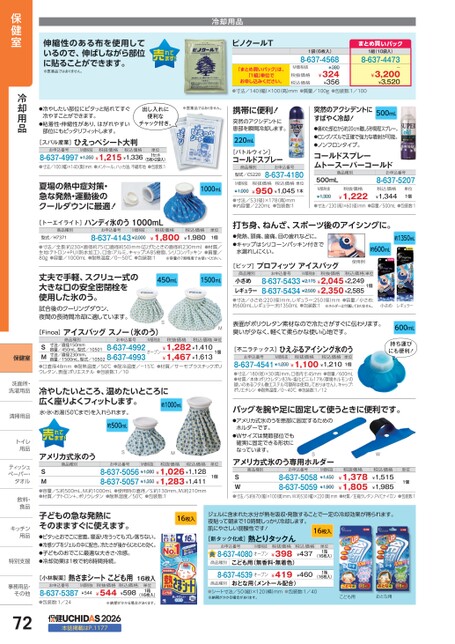 伸縮性のある布を使用しているので、伸ばしながら部位に貼ることができます。※医薬品ではありません。冷却用品ピノクールT「まとめ買いパック」は、「1組」単位でお申し込みください。1袋(6枚入)8-637-4568M価税抜税抜価格税込価格¥380¥324¥356まとめ買いパック1組(10袋入)8-637-4473ー¥3,200¥3,520●寸法/140(幅)×100(高)mm●質量/100g●包装数:1/100●冷やしたい部位にピタッと貼れてすぐ冷やすことができます。●粘着性・伸縮性があり、はがれやすい部位にもピッタリフィットします。[スバル産業]お申込番号ひえっぺシート大判M価税抜税抜価格税込価格8-637-4997¥1,350¥1,215¥1,336(5枚×2袋入)●寸法/100(幅)×140(奥)mm●メントール、ハッカ油、不織布地●包装数:1単位1セット夏場の熱中症対策・急な発熱・運動後のクールダウンに最適![トーエイライト]ハンディ氷のう1000mL出し入れに便利なチャック付き。※医薬品ではありません。携帯に便利!突然のアクシデントに患部を瞬間冷却します。220mL[バトルウィン]コールドスプレー商品種別型式/CS220お申込番号8-637-41801000mLM価税抜¥1,000税抜価格税込価格単位¥950¥1,0451本●寸法/53(径)×178(高)mm●内容量/220mL●包装数:1500mL突然のアクシデントにすばやく冷却!●痛めた部位から約20cm離し5秒間程スプレー。●ロングノズルで正確で強力な噴射が可能。●ノンフロンタイプ。コールドスプレームトースーパーコールド商品種別500mLお申込番号8-637-5207M価税抜¥1,300税抜価格¥1,222税込価格¥1,344単位1個●寸法/230高)×60(径)mm●容量/500mL●包装数:1商品種別型式/H7371お申込番号M価税抜8-637-4143¥2,000税抜価格¥1,800税込価格¥1,980単位1個●寸法/全長:約230×直径約75口直径約50)mm(広げたときの直径約230mm)●材質/生地:テトロン+PU(防水加工)、口金:アルミ、キャップ:ABS樹脂、シリコンパッキン●質量/80g●容量/1000mL●耐熱温度/0〜50℃●包装数:1※容量の7割程度でお使いください。●発熱、頭痛、歯痛、目の疲れなどに。●キャップはシリコーンパッキン付きで水漏れしにくい。約1350mL約600mL使用例打ち身、ねんざ、スポーツ後のアイシングに。丈夫で手軽、スクリュー式の大きな口の安全密閉栓を使用した氷のう。試合後のクーリングダウン、夜間の長時間冷却に適しています。450mL1500mLS[Finoa]アイスバッグスノー(氷のう)商品種別お申込番号M価税抜税抜価格税込価格単位寸法/直径150mm容量/450mL、型式/10501寸法/直径230mm、SM●口直径48mm●耐熱温度/50℃●耐冷温度/-15℃●材質/サーモプラスチックポリウレタン、表面:ポリエステル●包装数:1/108-637-4992オープン¥1,282¥1,410¥1,467¥1,613容量/1500mL、型式/105028-637-49931個M冷やしたいところ、温めたいところに広く座りよくフィットします。約1000mL水・氷・お湯(50℃まで)を入れられます。約500mLアメリカ式氷のうSM商品種別お申込番号M価税抜税抜価格税込価格単位SM●容量/S:約500mL、M:約1000mL●使用時の直径/S:約130mm、M:約210mm●材質/テトロン+、ポリウレタン●耐熱温度/50℃●包装数:18-637-5056¥1,080¥1,026¥1,1288-637-5057¥1,350¥1,283¥1,4111個[ピップ]プロフィッツアイスバッグ商品種別お申込番号M価税抜税抜価格税込価格単位8-637-5433¥2,175¥2,045¥2,2498-637-5434¥2,500¥2,350¥2,585小さめレギュラー●寸法/小さめ:220(径)mm、レギュラー:250(径)mm●容量/小さめ:約600mL、レギュラー:約1350mL●包装数:1※ホルダーは付属しておりません。1個小さめレギュラー表面がポリウレタン素材なので冷たさがすぐに伝わります。臭いが少なく、軽くて柔らかな使い心地です。[不二ラテックス]ひえぷるアイシング氷のうお申込番号8-637-4541¥1,200¥1,100¥1,210M価税抜税抜価格税込価格単位1個600mL持ち運びにも便利!●寸法/180(径)×30(高)mm、口径内寸:45mm●容量/600mL●材質/本体:ポリウレタン83%・塩化ビニル17%(環境ホルモンの疑いのあるフタル酸エステル可塑剤は使用しておりません)、キャップ:ポリエチレン●耐熱温度/0〜40℃●包装数:1/12バッグを腕や足に固定して使うときに便利です。●アメリカ式氷のうを患部に固定するためのホルダーです。●Wサイズは関節部位でも確実に固定できる形状になっています。SWアメリカ式氷のう専用ホルダー商品種別お申込番号SW●寸法/S:約670(幅)×100奥)mm、W:約530(幅)×220奥)mm●材質/圧縮ウレタン、PVCナイロン●包装数:18-637-50588-637-5059¥1,378¥1,805¥1,9001個税込価格¥1,515¥1,985税抜価格単位M価税抜¥1,450子どもの急な発熱にそのまますぐに使えます。●ピタッとおでこに密着。寝返りをうってもズレ落ちない。●冷感ツブをジェルの中に配合。冷たさが後からじわじわ効く。●子どものおでこに最適な大きさ・冷感。●冷却効果は1枚で約8時間持続。16枚入[小林製薬]お申込番号8-637-5387●包装数:1/24熱さまシートこども用16枚入M価税抜¥544税抜価格¥544税込価格¥598単位1箱(16枚入)※納期がかかる場合があります。2026本誌掲載はP.1177ジェルに含まれた水分が熱を吸収・発散することで一定の冷却効果が得られます。夜貼って朝まで10時間しっかり冷却します。肌にやさしい弱酸性です![新タック化成]熱とりタックん16枚入お