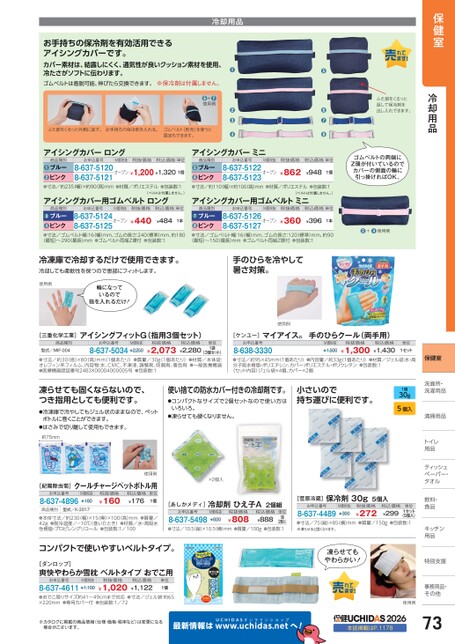保健室冷却用品保健室洗面所・面所・洗濯用品濯用品清掃用品清掃用品トイレイ用品品ティッシュシュペーパー・パー・タオルタオル飲料・飲料・食品品キッチンキッチン用品品特別支援別支援事務用品・事務用品・その他その他マイアイス手のひらクール(両手用)M価税抜¥1,500税抜価格¥1,300税込価格¥1,430単位1セット●寸法/約95×45mm(1個あたり)●内容量/約33g(1個あたり)●材質/ジェル袋:水・高分子吸水樹脂・ポリエチレン、カバー:ポリエステル・ポリウレタン●包装数:1〈セット内容〉ジェル袋×4個、カバー×2個ふた部をくるっと返して保冷剤を出し入れできます。●●●●税抜価格税込価格単位¥862¥9481個ゴムベルトの両端にZ環が付いているのでカバーの側面の輪に引っ掛ければOK。冷却用品お手持ちの保冷剤を有効活用できるアイシングカバーです。カバー素材は、結露しにくく、通気性が良いクッション素材を使用、冷たさがソフトに伝わります。ゴムベルトは着脱可能、伸びたら交換できます。※保冷剤は付属しません。●●+使用例ふた部をくるっと外側に返す。お手持ちの保冷剤を入れる。ゴムベルト(別売)を使うと固定もできます。●●●●お申込番号M価税抜8-637-5122オープン8-637-5123商品種別ブルーピンク●●お申込番号M価税抜税抜価格税込価格単位8-637-5120オープン¥1,200¥1,3201個8-637-5121商品種別ブルーピンク●●アイシングカバーロングアイシングカバーミニ●+●使用例●寸法/約235(幅)×約90高)mm●材質/ポリエステル●包装数:1●寸法/約110幅)×約100(高)mm●材質/ポリエステル●包装数:1アイシングカバー用ゴムベルトロングアイシングカバー用ゴムベルトミニお申込番号M価税抜税抜価格税込価格単位お申込番号M価税抜税抜価格税込価格単位(ベルトは付属しません。)(ベルトは付属しません。)¥360¥3961本8-637-5126オープン8-637-5127商品種別ブルーピンク●●¥440¥4841本8-637-5124オープン8-637-5125商品種別ブルーピンク●●●寸法/ゴムベルト幅:16幅)mm、ゴムの長さ:240標準)mm、約180(最短)〜290最長)mm●ゴムベルト両端Z環付●包装数:1●寸法/ゴムベルト幅:16(幅)mm、ゴムの長さ:120(標準)mm、約90(最短)〜150最長)mm●ゴムベルト両端Z環付●包装数:1冷凍庫で冷却するだけで使用できます。冷却しても柔軟性を保つので患部にフィットします。手のひらを冷やして暑さ対策。使用例輪になっているので指を入れるだけ!使用例[三重化学工業]アイシングフィットG(指用3個セット)商品種別型式/MIF-004お申込番号M価税抜8-637-5034¥2,250税抜価格¥2,073税込価格¥2,280(3個セット)●寸法/約30(径)×80(高)mm(1個あたり)●質量/30g(1個あたり)●材質/本体袋:オレフィン系フィルム、内容物:水、CMC、不凍液、調整剤、防腐剤、着色剤●医療機器認証番号24B3X00004000005号●包装数:1●一般医療機器単位1袋[ケンユー]お申込番号8-638-3330凍らせても固くならないので、つき指用としても便利です。●冷凍庫で冷やしてもジェル状のままなので、ペットボトルに巻くことができます。●はさみで切り離して使用もできます。約75mm使用例[紀陽除虫菊]クールチャージペットボトル用お申込番号8-637-4896M価税抜¥180税抜価格¥160税込価格¥176単位1個商品種別型式/K-2017●本体寸法/約230(幅)×15(奥)×100高)mm●質量/42g●耐冷温度/-10℃(巻いたとき)●材質/水・高吸水性樹脂・プロピレングリコール●包装数:1/100使い捨ての防水カバー付きの冷却剤です。●コンパクトなサイズで2個セットなので使い方はいろいろ。●凍らせても硬くなりません。×2個入[あしかメディ]冷却剤ひえ子A2個組お申込番号8-637-5498M価税抜¥820税抜価格¥808税込価格¥888単位1袋(2個入)●寸法/10.5縦)×10.5横)mm●質量/100g●包装数:1コンパクトで使いやすいベルトタイプ。[ダンロップ]爽快やわらか雪枕ベルトタイプおでこ用お申込番号M価税抜8-637-4611¥1,100税抜価格¥1,020税込価格¥1,122単位1個●おでこ周りサイズ約41〜49cmまで対応●寸法/ジェル袋:約65×220mm●専用カバー付●包装数:1/72※カタログに掲載の商品情報(仕様・価格・税率など)は変更になる場合がございます。最新情報は小さいので持ち運びに便利です。1個30g5個入[菅原冷蔵]保冷剤30g5個入お申込番号8-637-4489M価税抜¥300税抜価格¥272税込価格¥299単位1セット(5個入)●寸法/75縦)×85横)mm※凍らせると固くなります。●質量/150g●包装数:1凍らせてもやわらかい!UCHIDASww.uchidas.netwへ!使用例2026本誌掲載はP.117873