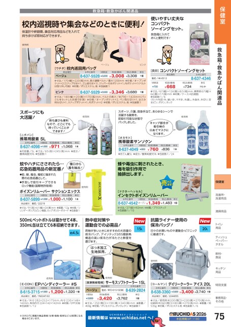 保健室救急箱・救急かばん関連品救急箱・救急かばん関連品校内巡視時や集会などのときに便利!体温計や絆創膏、鼻血対応用品などを入れて持ち歩けば即対応ができます。使いやすい丈夫なコンパクトソーイングセット。救急箱に入れておくと便利です!使用例ベージュピンク[ウチダ]校内巡回用バッグ商品種別お申込番号税込価格¥3,308ベージュ●寸法/170幅)×220(高)mm、長さ調整ベルト/最大1200mm●仕様/オープンポケット×2スナップ付き×1、ゴム紐付き×1)、ジッパー付きポケット×1、内ポケット×1(ベルトは取り外し可能)●材質/ポリエステル、他●包装数:18-637-5528¥3,200¥3,008税抜価格単位1個M価税抜8-637-5529¥3,560ピンク●寸法/180(幅)×20(奥)×170(高)mm、ベルトの長さ/約790〜1420mm(バックルをセットした状態で計測)●仕様/オープンポケット×2、ペン用仕切り×1、はさみ用仕切り×1、スナップポケット×1、内ポケット×2●材質/ポリエステル、他●包装数:1¥3,346¥3,6801個[貝印]コンパクトソーイングセット商品種別型式/HK-0512M価税抜¥750税抜価格¥668お申込番号8-637-4346税込価格¥734単位1セット●寸法/67(幅)×124(奥)×8.5(高)mm、携帯時:67幅)×64(奥)×17(高)mm●材質/ケース:ABS樹脂●包装数:1/6〈セット内容〉糸、縫い針、マチ針、糸通し、糸抜き、糸切り、安全ピン、ボタン、ホックスポーツにも大活躍![ニチバン]携帯用酸素5L持ち運びも便利なので、どこにでも持っていくことができます!使用例単位1本お申込番号8-637-4098¥1,000M価税抜税抜価格税込価格¥971¥1,068●内容量/5L酸素純度95%●包装数:1●寸法/65(径)×245(高)mm●成分/蚊やハチにさされたら…応急処置用品の新定番!傷口から毒を抽出!●蚊、蜂、毒虫、毒蛇に噛まれた際の応急処置として。●手放しで吸引キープできるロック機能(国際特許取得)ポイズンリムーバーサクションエックスお申込番号M価税抜税抜価格税込価格8-637-5899¥1,030¥1,000¥1,100単位1本商品種別型式/22219●寸法/91(高)×61(幅)×24奥)mm●質量/12g●材質/シリンダー:ポリプロピレン樹脂、カップ:ポリカーボネート●包装数:1使用例スポーツ、介護、救急手当て、あらゆるシーンで活躍する酸素を、即吸引可能な状態でパックしました。キャップ部分が使用例吸引時の口あてマスクになります。[オカモト]携帯酸素サンソクンお申込番号8-637-4049M価税抜¥800税抜価格¥760税込価格¥836単位1本●充てん量5L●成分/酸素純度95%●包装数:1/24蜂や毒虫に刺されたとき、毒を吸引作用で抽排出します。[ドクターヘッセル]インセクトポイズンリムーバーお申込番号M価税抜税抜価格税込価格8-637-4542オープン¥1,349¥1,483単位1個●寸法/27径)×92mm●材質/プラスチック●包装数:1/10500mLペットボトルは寝かせて4本、350mL缶は立てて6本収納できます。熱中症対策や運動会での必需品!約4.5L荷物が多いときにおすすめの大容量の保冷バッグ。アイソテック2の5層断熱構造の高い保冷力が冷たさと鮮度を運びます。はっ水加工生地採用。抗菌ライナー使用の保冷バッグ!日々のお買いものや運動会・ピクニックに最適です。15L使用例保健室洗面所・面所・洗濯用品濯用品清掃用品清掃用品トイレイ用品品20Lティッシュシュペーパー・パー・タオルタオル飲料・飲料・食品品キッチンキッチン用品品特別支援別支援事務用品・事務用品・その他その他使用例[E-CON]お申込番号EPハンディクーラー#5M価税抜税抜価格税込価格単位8-615-3715¥1,560¥1,200¥1,3201個商品種別型式/760247-02●寸法/外寸:282×252×175mm、内寸:230×148×142mm、有効内寸:224×142×142mm●包装数:1/12●材質/EPP30倍使用例[廣瀬無線電機]サーモスソフトクーラー15Lベージュ商品種別型式/RFD-0151SDBEお申込番号8-639-2824M価税抜¥3,800税抜価格¥3,420税込価格¥3,762単位1個●寸法/250(間口)×190(奥)×340(高)mm400g●材質/ポリエステル、ポリウレタン●包装数:1●質量/[コールマン]デイリークーラーアイス20Lお申込番号M価税抜税抜価格税込価格8-638-3360¥3,500¥3,400¥3,740単位1個商品種別型式/2244055●寸法/使用時:約330(間口)×230(奥)×270(高)mm、収納時:約360間口)×80(奥)×270(高)mm535g●材質/ポリエステル他●包装数:1/6●質量/約※カタログに掲載の商品情報(仕様・価格・税率など)は変更になる場合がございます。最新情報はUCHIDASww.uchidas.netwへ!2026本誌掲載はP.118075