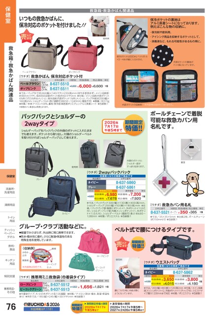 いつもの救急かばんに、保冷対応のポケットを付けました!!救急箱・救急かばん関連品使用例保冷ポケットの裏地はアルミ蒸着シートになっております。例えばこんな物の収納に。・保冷剤や飲料用。・アイシング用品を収納するポケットとして。・消毒液など、もれる可能性があるもの用に。ペールブラウンポップピンク[ウチダ]救急かばん保冷対応ポケット付商品種別お申込番号M価税抜税抜価格税込価格単位型式/CB-NB型式/CP-PK8-637-55108-637-5511¥6,800¥6,000¥6,600ペールブラウンポップピンク●寸法/バッグ外寸:約260(幅)×140(マチ)×230(高)mm(持ち手部含まず)、メイン収納部:約90mm(マチ)、保冷対応収納ポケット部:約50(マチ)mm●仕様/メイン収納:内部ポケット4カ所(うち3カ所はメッシュ)、保冷収納:内部ポケット1カ所(メッシュ)、バッグ外側:約200(幅)×160(高)mm、ショルダーベルト(長さ調節可(約650〜1240mm)・着脱不可)●質量/約315g●材質/本体:ナイロン100%、裏地・保冷部:高密度ポリエチレンアルミ蒸着シート●包装数:1※救急カバン用名札は別売となります。1個保冷ポケットは500mLペットボトル×3〜4本が縦に入る大きさ。内部ポケットの裏地がドット柄になっています。内部ポケットの収納例※内容物は含まれておりません。バックパックとショルダーの2wayタイプショルダーバッグをバックパックの外側のポケットに入れたままでも使えます。ポケットから取り出し、付属のショルダーベルトを取り付ければショルダーバッグとして使えます。2026年7月17日午後5時ボールチェーンで着脱可能な救急カバン用名札です。使用例外側のポケットにショルダー部がすっぽり収まります。裏面グレー[ウチダ]2wayバックパック在庫無次第終了商品商品種別ネイビーグレーお申込番号8-637-58608-637-5861M価税抜¥9,800期間限定特価税抜価格¥6,980税抜価格¥7,2001個¥7,678税込価格¥7,920税込価格通常価格単位ネイビー●寸法/バックパック:300(幅)×130(奥)×400(高)mm、ショルダーバッグ:250(幅)×50(奥)×180(高)mm●仕様/バックパック部:背側にポケット×1、外ポケット×1(ふた付)、ショルダーバック部:内側メッシュポケット×1、外ポケット×1(ふた付)、ショルダーベルト(着脱可)長さ:約680〜1280mm●材質/ポリエステル●包装数:1[ウチダ]救急カバン用名札お申込番号M価税抜税抜価格税込価格8-637-5521オープン¥350¥385単位1個●寸法/35×35×5mm●台紙2枚、ボールチェーン(約150mm)付●包装数:1グループ・クラブ活動などに。●軽量でかさばらず、外出時に常に携帯できます。●防水・撥水性に優れ、さらに耐湿・保温性のある特殊生地を使用しています。ベルト式で腰につけるタイプです。[ウチダ]ウエストバッグ在庫無次第終了商品商品種別ネイビーM価税抜¥4,000お申込番号8-637-5862期間限定特価税抜価格¥3,650税抜価格¥3,8001個¥4,015税込価格¥4,180税込価格通常価格単位腰につけた時に手前が開くようになっています。●寸法/200(幅)×80(奥)×120高)mm●仕様/メイン収納部:メッシュポケット×2、外側ポケット×1(チャック付)、ウエストサイズ最大1200mmまで対応●材質/ポリエステル●包装数:1通常価格の期間2026年7月17日午後5時〜2027年2月26日午後5時綿棒(収納例)かゆみ止め解熱剤※内容物は別売です。ソーイングセットローズピンク使用例ピーコックグリーン期間限定特価の期間2026年7月17日午後5時2026本誌掲載はP.1181[ウチダ]携帯用ミニ救急袋(巾着袋タイプ)商品種別お申込番号M価税抜税抜価格税込価格単位ローズピンクピーコックグリーン●巾着袋タイプ、大・小の外ポケット各1共通蓋)●材質/ナイロン(防水・撥水、耐湿・保温性あり)●外形寸法/185(縦)×245(幅)×30(マチ)mm●包装数:1¥1,850¥1,656¥1,8218-637-55128-637-5513型式/U-NP4型式/U-NP51個保健室救急箱・救急かばん関連品保健室洗面所・洗面洗濯用品洗濯用清掃用品清掃用品トイレトイ用品用ティッシュティッペーパー・タオルタオル飲料・飲料・食品食キッチンキッチン用品用特別支援特別支事務用品・事務用品・その他その他76