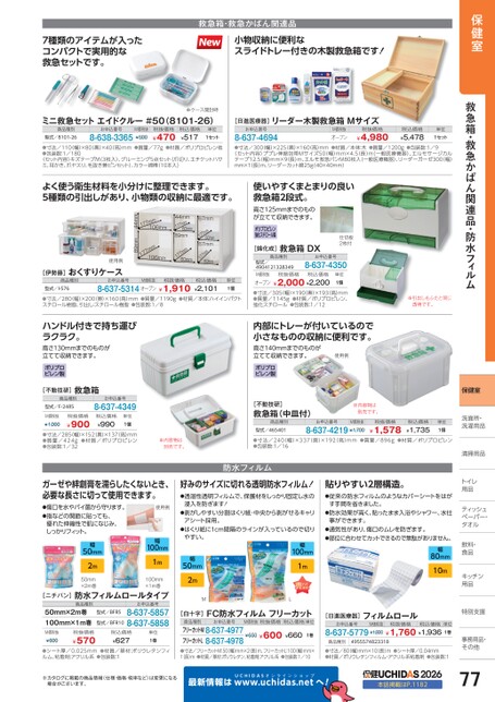 保健室救急箱・救急かばん関連品・防水フィルム保健室洗面所・面所・洗濯用品濯用品清掃用品清掃用品トイレイ用品品ティッシュシュペーパー・パー・タオルタオル飲料・飲料・食品品キッチンキッチン用品品特別支援別支援事務用品・事務用品・その他その他7種類のアイテムが入ったコンパクトで実用的な救急セットです。救急箱・救急かばん関連品小物収納に便利なスライドトレー付きの木製救急箱です!※ケース開封時ミニ救急セットエイドクルー#50(8101-26)[日進医療器]リーダー木製救急箱Mサイズ商品種別型式/8101-26お申込番号M価税抜8-638-3365¥500税抜価格¥470税込価格¥517単位1セットお申込番号8-637-4694●寸法/110幅)×80(奥)×40(高)mm●包装数:1/180〈セット内容〉キズテープM(3枚入)、グルーミング5点セット(爪切り、エチケットハサミ、耳かき、爪ヤスリ、毛抜き兼ピンセット)、カラー綿棒(10本入)●材質/ポリプロピレン他●質量/77g●寸法/300(幅)×225(奥)×160(高)mm〈セット内容〉ププレ伸縮包帯Mサイズ50(幅)mm×4.5(長)m(一般医療機器)、エルモサージカルテープ12.5(幅)mm×9(長)m、エルモ救急バンM80枚入(一般医療機器)、リーダーガーゼ300(幅)mm×1長)m、リーダーカット綿25g40×40mm)●包装数:1/9税抜価格M価税抜オープン●材質/本体:木●質量/1200g¥4,980税込価格¥5,478単位1セットよく使う衛生材料を小分けに整理できます。5種類の引出しがあり、小物類の収納に最適です。使いやすくまとまりの良い救急箱2段式。高さ125mmまでのものが立てて収納できます。ポリプロピレン強化スチロール製仕切板2枚付[錦化成]救急箱DX商品種別型式/4904121328349M価税抜税抜価格お申込番号8-637-4350税込価格オープン¥2,000¥2,200単位1個●寸法/305(幅)×190(奥)×193(高)mm●質量/1145g強化スチロール●包装数:1/12●材質/ポリプロピレン、※引出しもふたと同じ透明です。内部にトレーが付いているので小さなものの収納に便利です。高さ140mmまでのものが立てて収納できます。ポリプロピレン製使用例※内容物は別売です。[不動技研]救急箱(中皿付)商品種別型式/465401お申込番号M価税抜8-637-4219¥1,700税抜価格¥1,578税込価格¥1,735単位1個※内容物は別売です。●寸法/240(幅)×337(奥)×192(高)mm●包装数:1/16●質量/896g●材質/ポリプロピレン防水フィルム好みのサイズに切れる透明防水フィルム!貼りやすい2層構造。●透湿性透明フィルムで、保護材をしっかり固定し水の●従来の防水フィルムのようなカバーシートをはが●剥がしやすい分割はくり紙・中央から剥がせるキャリ●防水効果が高く、貼ったまま入浴やシャワー、水仕す手間を省きました。事ができます。●はくり紙に1cm間隔のラインが入っているので切り●通気性があり、傷口のムレを防ぎます。●部位に合わせてカットできるので無駄がありません。幅100mm1mL幅80mm10m[白十字]商品種別FC防水フィルムフリーカットお申込番号M価税抜税抜価格税込価格単位フリーカットM8-637-49778-637-4978フリーカットL●寸法/フリーカットM:50幅)mm×2長)m、フリーカットL100幅)mm×1(長)m●材質/基材:ポリウレタン、粘着剤:アクリル系●包装数:1/10¥650¥600¥6601巻[日進医療器]フィルムロールお申込番号M価税抜税抜価格税込価格単位8-637-5779¥1,800¥1,760¥1,9361巻商品種別4955574823318●寸法/80(幅)mm×10(長)m●材質/ポリウレタンフィルム・アクリル系粘着剤●包装数:1●シート厚/0.04mm67mm77mm160mm67mm7mm1760mm771m106mmm744mmmm760mm189mm771mm106mmm77m160mm44mm89mm使用例[伊勢藤]おくすりケース商品種別型式/I-576お申込番号M価税抜税抜価格8-637-5314オープン¥1,910税込価格¥2,101単位1個●寸法/280幅)×200(奥)×160(高)mmスチロール樹脂、引出し:スチロール樹脂●包装数:1/8●質量/1190g●材質/本体:ハイインパクトハンドル付きで持ち運びラクラク。高さ130mmまでのものが立てて収納できます。ポリプロピレン製[不動技研]救急箱商品種別型式/F-2485お申込番号8-637-4349M価税抜¥1,000税抜価格¥900税込価格¥990単位1個●寸法/285幅)×152奥)×137(高)mm●質量/424g●材質/ポリプロピレン●包装数:1/32ガーゼや絆創膏を濡らしたくないとき、必要な長さに切って使用できます。●傷口を水やバイ菌から守ります。●指などの関節に貼っても、優れた伸縮性で肌になじみ、しっかりフィット。幅50mm2m使用例幅100mm1m100mm×1m巻50mm×2m巻商品種別[ニチバン]防水フィルムロールタイプ50mm×2m巻100mm×1m巻型式/BFR5型式/BFR10お申込番号8-637-58578-637-5858M価税抜¥600税抜価格¥570税込価格¥627単位1巻●シート厚/0.025mm●材質/基材:ポリウレタンフィルム、粘着剤:アクリル系●包装数:1浸入を防ぎます!アシート採用。やすい。幅50mm2mM※カタログに掲載の商品情報(仕様・価格・税率など)は変更になる場合がございます。最新情報はUCHIDASww.uchidas.netwへ!2026本誌掲載はP.118277
