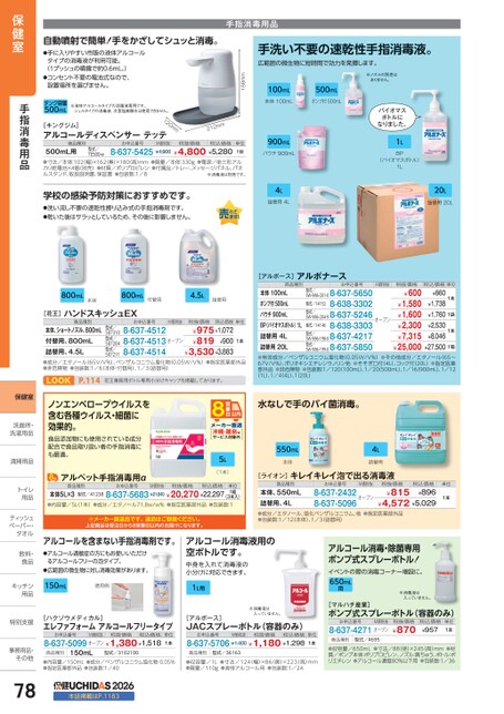 900mLパウチ900mL4L詰替用4Lバイオマスボトルになりました。1L(バイオマスボトル)BP1L20L詰替用20L[アルボース]アルボナース商品種別お申込番号M価税抜税抜価格税込価格単位型式/型式/14152型式/SW-986-201-08-637-56508-638-3302SW-986-204-98-637-52468-638-3303SW-986-198-08-637-4217SW-986-199-08-637-5850本体100mLポンプ付500mLパウチ900mLBP(バイオマスボトル)1L詰替用4L¥27,5001箱詰替用20L●有効成分/ベンザルコニウム塩化物(0.05W/V%)●その他成分/エタノール(65〜67V/V%)、ポリオキシエチレンラノリン他●そそぎ口付(4L)、コック付(20L)●指定医薬部外品●非危険物●包装数:1/120(100mL)、1/20500mL)、1/16900mL)、1/12¥600¥1,580¥1,600¥2,300¥7,315¥25,000¥660¥1,738¥1,7601袋¥2,530¥8,046型式/14146型式/オープン型式/1本1本(1L)、1/44L)、1(20L)水なしで手のバイ菌消毒。550mL本体4L詰替用[ライオン]キレイキレイ泡で出る消毒液商品種別お申込番号M価税抜本体、550mL詰替用、4L●成分/エタノール、塩化ベンザルコニウム、他●指定医薬部外品●包装数:1/12(本体)、1/3(詰替用)8-637-2432オープン8-637-5096税抜価格¥815税込価格¥896¥4,572¥5,029単位1本手洗い不要の速乾性手指消毒液。広範囲の微生物に短時間で効力を発揮します。※ノズルの別売はありません。100mL本体100mL500mLポンプ付500mL188mm手指消毒用品自動噴射で簡単!手をかざしてシュッと消毒。●手に入りやすい市販の液体アルコールタイプの消毒液が利用可能。(1プッシュの噴霧で約0.6mL。)●コンセント不要の電池式なので、設置場所を選びません。タンク容量500mL※液体アルコールタイプの消毒液専用です。ジェルタイプの消毒液、次亜塩素酸水は使用できません。商品種別お申込番号M価税抜税抜価格税込価格型式/TE500-w8-637-5425¥4,900¥4,800¥5,280500mL用●寸法/本体:102(幅)×162(奥)×180高)mm●質量/本体:330g●電源/単三形アルカリ乾電池×4個(別売)●材質/ポリプロピレン●付属品/トレー、メッセージパネル、パネルスタンド、取扱説明書、保証書●包装数:1/8※消毒液は別売です。単位1台mm2120m12m[キングジム]アルコールディスペンサーテッテ学校の感染予防対策におすすめです。●洗い流し不要の速乾性擦り込み式の手指消毒剤です。●乾いた後はサラッとしているため、その後に影響しません。800mL本体800mL付替用4.5L詰替用[花王]ハンドスキッシュEX商品種別お申込番号M価税抜税抜価格税込価格単位本体、ショートノズル、800mL付替用、800mL詰替用、4.5L●成分/エタノール(65V/V%)、ベンザルコニウム塩化物(0.05W/V%)●指定医薬部外品●非危険物●包装数:1/6本体・付替用)、1/3詰替用)¥975¥1,072¥819¥900¥3,530¥3,8838-637-45128-637-45138-637-4514型式/507310型式/507204型式/507211オープン1本LOOKP.1142花王業務用ボトル専用小分けキャップを掲載しております。ボト専分ャップを載しりま。ノンエンベロープウイルスを含む各種ウイルス・細菌に効果的。食品添加物にも使用されている成分配合で食品取り扱い者の手指消毒にも最適。沖縄・離島はサービス対象外5L(1本)アルペット手指消毒用α商品種別お申込番号M価税抜税抜価格税込価格型式/412388-637-5683¥21,840¥20,270¥22,297本体5L×3●内容量/5L1本)●成分/エタノール71.8w/w%●指定医薬部外品●包装数:1(3本入)単位1組※メーカー直送品です。返品はご容赦ください。上記商品は受注日から8営業日以内のお届けになります。アルコールを含まない手指消毒剤です。●アルコール過敏症の方にもお使いいただけるアルコールフリーの泡タイプ。●広範囲の微生物に対し消毒効果があります。150mL使用例アルコール消毒液用の空ボトルです。中身を入れて消毒液の小分けに対応できます。1L用[ハクゾウメディカル]エレファフォームアルコールフリータイプお申込番号M価税抜税抜価格税込価格8-637-5099オープン¥1,380¥1,518単位1本※消毒液は入っていません。[アルボース]JACスプレーボトル(容器のみ)お申込番号M価税抜税抜価格税込価格8-637-5706¥1,400¥1,180¥1,298単位1本商品種別150mL型式/3102100商品種別型式/36163●内容量/150mL●成分/ベンザルコニウム塩化物0.05%●指定医薬部外品●包装数:1/40●収容量/1L●寸法/124(幅)×86(奥)×223(高)mm●質量/110g●液体アルコール用●包装数:1/242026本誌掲載はP.1183アルコール消毒・除菌専用ポンプ式スプレーボトル!イベントの際の消毒コーナー増設に。650mL用※消毒液は入っていません。[マルハチ産業]ポンプ式スプレーボトル(容器のみ)お申込番号M価税抜8-637-4271オープン税抜価格¥870税込価格¥957単位1本商品種別型式/#695●収容量/650mL●寸法/88(径)×245(高)mm●材質/ポンプ本体:ポリプロピレン、ノズル:真ちゅう、ボトル:ポリエチレン●アルコール濃度80%以下用●包装数:1/36保健室手指消毒用品保健室洗面所・洗面洗濯用品洗濯用清掃用品清掃用品トイレトイ用品用ティッシュティッペーパー・タオルタオル飲料・飲料・食品食キッチンキッチン用品用特別支援特別支事務用品・事務用品・その他その他78