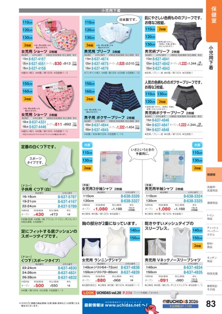 保健室小児用下着保健室洗面所・面所・洗濯用品濯用品清掃用品清掃用品トイレイ用品品ティッシュシュペーパー・パー・タオルタオル飲料・飲料・食品品キッチンキッチン用品品特別支援別支援事務用品・事務用品・その他その他商品種別お申込番号M価税抜税抜価格税込価格単位商品種別お申込番号M価税抜税抜価格税込価格単位M価税抜税抜価格税込価格単位オープン¥830¥9131セット(2枚組)オープン¥1,828¥2,0101セット(3枚組)オープン¥1,222¥1,3441袋(2枚入)●細かい柄入●材質/綿100%●包装数:1/5●ワンポイント柄入●材質/綿100%●日本製●包装数:1/20●色柄/グレー、紺●材質/綿100%●包装数:1150cm160cm2枚組※色・柄は変更になる場合があります。商品種別女児用ショーツ2枚組150cm8-637-4331オープン¥811¥892お申込番号M価税抜税抜価格税込価格単位1セット(2枚組)160cm8-637-4446●細かい柄入●材質/綿100%●包装数:1/5※足ゴムまたはウエストゴムがフラットになる場合があります。定番の白くつ下です。スポーツタイプです。[ナコー]子供用くつ下(白)商品種別16-18cm19-21cm22-24cmお申込番号8-637-57878-637-41678-637-5789M価税抜オープン税抜価格¥430税込価格¥473単位1足●抗菌・防臭●材質/綿、アクリル、ナイロン、ポリウレタン●吸水速乾●包装数:1足にフィットする底クッションのスポーツタイプです。150cm160cm2枚組※色・柄は変更になる場合があります。商品種別男子用ボクサーブリーフ2枚組150cm8-637-4844オープン¥1,322¥1,4541セットM価税抜税抜価格税込価格お申込番号単位160cm8-637-4845(2枚組)人気の色柄もののボクサーブリーフです。お得な2枚組。110cm130cm120cm2枚組※色柄は選べません。(色柄は、写真と変更になることがあります。)男児柄ボクサーブリーフ2枚組M価税抜税抜価格税込価格単位オープン¥1,222¥1,3441袋(2枚入)商品種別お申込番号110cm8-637-4846120cm8-637-4847130cm8-637-4848●材質/本体:綿100%●包装数:1/10●色柄/グレー、紺●材質/綿100%●包装数:1抗菌110cm130cm2枚組いざというときの予備用に。[双基]女児用3分袖シャツ2枚組商品種別110cm130cm[双基]男児用半袖シャツ2枚組商品種別110cm130cmお申込番号8-638-33268-638-3327抗菌110cm130cm2枚組お申込番号8-638-33248-638-3325M価税抜オープン税抜価格¥1,080税込価格¥1,188●白無地●材質/綿100%●包装数:1単位1セット(2枚組)M価税抜オープン税抜価格¥1,080税込価格¥1,188●白無地●材質/綿100%●包装数:1単位1セット(2枚組)胸の部分が2重になっています。140cm乾きやすいメッシュタイプのスリーブレス。140cm150cm150cm2枚組[ナコー]くつ下(スポーツタイプ)商品種別22-24cm24-26cm26-28cmM価税抜オープン税抜価格¥500税込価格¥550単位1足●材質/綿100%●日本製●包装数:1/5お申込番号8-637-48308-637-48318-637-4832女児用ランニングシャツ商品種別140cm(バスト64〜72cm)150cm(バスト70〜80cm)お申込番号8-637-48388-637-4839M価税抜オープン税抜価格¥880税込価格¥968単位1枚140cm150cmM価税抜オープン男児用Vネックノースリーブシャツ商品種別お申込番号8-637-48348-637-4835税抜価格¥891税込価格¥980単位1セット(2枚組)●抗菌防臭加工●白無地●材質/綿100%●包装数:1/5●白無地●材質/綿63%、ポリエステル37%●包装数:1/5P.336CHIASvol.20Tシャツを掲載しております。P.336Tシャツを掲載しております。※カタログに掲載の商品情報(仕様・価格・税率など)は変更になる場合がございます。最新情報はUCHIDASww.uchidas.netwへ!2026本誌掲載はP.118883小児用下着日本製です。肌にやさしい色柄もののブリーフです。お得な2枚組。2枚組110cm120cm110cm120cm130cm2枚組※色・柄は変更になる場合があります。女児用ショーツ2枚組110cm8-637-4157120cm8-637-4551130cm8-637-4158110cm120cm130cm3枚組※色・柄は変更になる場合があります。男児用ブリーフ3枚組110cm8-637-4674120cm8-637-4675130cm8-637-4676※色柄は選べません。(色柄は、写真と変更に130cm男児柄ブリーフ2枚組なることがあります。)商品種別お申込番号110cm8-637-4841120cm8-637-4842130cm8-637-4843