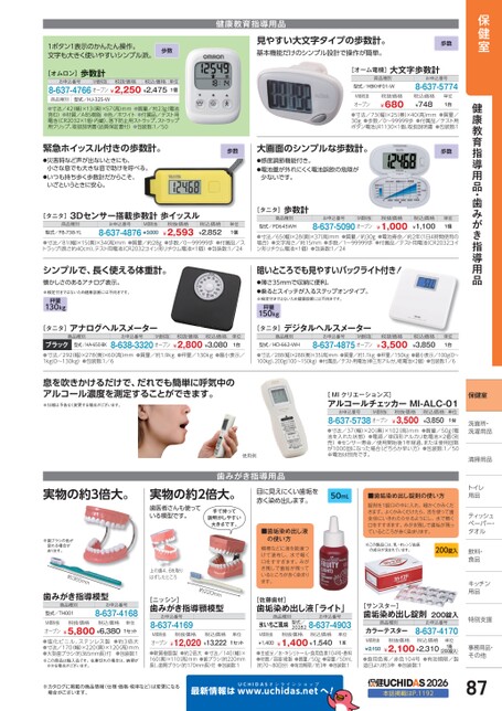保健室健康教育指導用品・歯みがき指導用品保健室洗面所・面所・洗濯用品濯用品清掃用品清掃用品トイレイ用品品ティッシュシュペーパー・パー・タオルタオル飲料・飲料・食品品キッチンキッチン用品品特別支援別支援事務用品・事務用品・その他その他■歯垢染め出し錠剤の使い方錠剤を1錠口の中に入れ、細かくかみくだきます。よくかみくだけたら、舌を使って歯全体にいきわたらせるようにし、水で軽く口をすすぎます。みがき残しで歯垢が残っているところが赤く染まります。※この製品には、乳・オレンジ由来の成分が含まれています。200錠入[サンスター]歯垢染め出し錠剤200錠入商品種別カラーテスターお申込番号8-637-4170M価税抜¥2,150税抜価格税込価格¥2,100¥2,310(200錠入)●食用色素/赤色104号●有効期限/製造日より約3年●包装数:1単位1箱約365mm歯4上の、6を取りはずしたところ歯みがき指導模型商品種別型式/TH001お申込番号8-637-4168M価税抜税抜価格税込価格オープン¥5,800¥6,380単位1セット●塩化ビニル、ステンレス製●約3倍大●寸法/170(幅)×220(奥)×120(高)mm●大型歯ブラシ(約365mm長)付●包装数:1※この商品は輸入品です。在庫切れの場合は、納期がかかる場合がございます。約220mm[ニッシン]歯みがき指導顎模型お申込番号8-637-4169単位税抜価格税込価格¥12,020¥13,222M価税抜オープン●軟質樹脂製●約2倍大●寸法/140幅)×160(奥)×110(高)mm●歯ブラシ(約220mm長)、歯間ブラシ(約170mm長)付●包装数:11セット[佐藤歯材]歯垢染め出し液「ライト」商品種別氷いちご風味お申込番号型式/202828-637-4903M価税抜¥1,400税抜価格税込価格¥1,400¥1,540単位1本●主成分/水・キシリトール・食用色素104号・香料●容量/50mL●材質/容器:樹脂(約70〜80回分)●有効期限/約3年●包装数:1●質量/50g※カタログに掲載の商品情報(仕様・価格・税率など)は変更になる場合がございます。最新情報はUCHIDASww.uchidas.netwへ!2026本誌掲載はP.1192871ボタン1表示のかんたん操作。文字も大きく使いやすいシンプル派。歩数健康教育指導用品見やすい大文字タイプの歩数計。基本機能だけのシンプル設計で操作が簡単。歩数[オムロン]お申込番号歩数計M価税抜税抜価格税込価格8-637-4766オープン¥2,250¥2,475単位1個商品種別型式/HJ-325-W●寸法/42(幅)×13奥)×57(高)mm●質量/約23g(電池含む)●材質/ABS樹脂●色/ホワイト●付属品/テスト用電池(CR2032×1個・内蔵)、落下防止用ストラップ、ストラップ用クリップ、取扱説明書(品質保証書付)●包装数:1/50緊急ホイッスル付きの歩数計。●災害時など声が出ないときにも、小さな息でも大きな音で助けを呼べる。●いつも持ち歩く歩数計だからこそ、いざというときに安心。[オーム電機]商品種別大文字歩数計型式/HBKHF01-WM価税抜オープン税抜価格¥680お申込番号8-637-5774税込価格¥748単位1台●寸法/73幅)×25奥)×40高)mm●質量/30g●歩数/0〜99999歩●付属品/テスト用ボタン電池LR1130×1個、取扱説明書●包装数:1歩数大画面のシンプルな歩数計。●感度調節機能付き。●電池蓋が外れにくく電池誤飲の危険が少ないです。歩数[タニタ]3Dセンサー搭載歩数計歩イッスル商品種別型式/FB-738-YLお申込番号M価税抜8-637-4876¥3,000税抜価格¥2,593税込価格¥2,852単位1個●寸法/81幅)×15奥)×34(高)mm●質量/約28gトラップ(長さ約40cm)、テスト用電池(CR2032コイン形リチウム電池×1個)●包装数:1/24●歩数/0〜99999歩●付属品/スシンプルで、長く使える体重計。懐かしさのあるアナログ表示。※検定付きではないため健康診断には不向きです。秤量130kg[タニタ]歩数計商品種別型式/PD645WHお申込番号M価税抜8-637-5090オープン税抜価格¥1,000税込価格¥1,100単位1個●寸法/65幅)×28奥)×37高)mm●質量/約30g●電池寿命/約2年(1日4時間使用の場合)●文字高さ/約15mm●歩数/1〜99999歩●付属品/テスト用電池(CR2032コイン形リチウム電池×1個)●包装数:1/24暗いところでも見やすいバックライト付き!●薄さ35mmで収納に便利。●乗るとスイッチが入るステップオンタイプ。※検定付きではないため健康診断には不向きです。秤量150kg[タニタ]アナログヘルスメーター商品種別お申込番号M価税抜税抜価格税込価格型式/HA-650-BKブラック●寸法/292(幅)×278(奥)×60高)mm●質量/約1.9kg●秤量/130kg1kg(0〜130kg)●包装数:1/68-638-3320オープン¥2,800¥3,080●最小表示/[タニタ]デジタルヘルスメーター単位1台商品種別型式/HD-662-WHお申込番号M価税抜8-637-4875オープン税抜価格¥3,500●寸法/288(幅)×288奥)×35高)mm100kg)、200g100〜150kg)●付属品/テスト用電池(単三形アルカリ乾電池×2個)●包装数:1/6●質量/約1.1kg●秤量/150kg単位1台税込価格¥3,850●最小表示/100g0〜息を吹きかけるだけで、だれでも簡単に呼気中のアルコール濃度を測定することができます。※仕様は予告なく変更する場合がございます。使用例歯みがき指導用品[MIクリエーションズ]アルコールチェッカーMI-ALC-01M価税抜税抜価格お申込番号¥3,5008-637-5738オープン税込価格¥3,850●寸法/37(幅)×20(奥)×102(高)mm●質量/50g(電池を入れた状態)●電源/単四形アルカリ乾電池×2個(別売)●センサー寿命/使