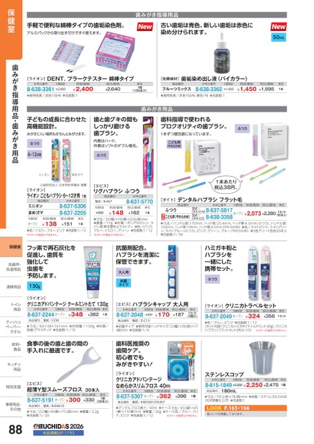 手軽で便利な綿棒タイプの歯垢染色剤。アルミパックから取り出すだけですぐ使えます。古い歯垢は青色、新しい歯垢は赤色に染め分けられます。歯みがき指導用品[ライオン]DENT.プラークテスター綿棒タイプお申込番号M価税抜8-638-3361¥2,400税抜価格¥2,400税込価格¥2,640単位1箱(100本入)[佐藤歯材]歯垢染め出し液〈バイカラー〉商品種別お申込番号フルーツミックス●食用色素/赤色104号、青色1号●包装数:18-638-3362M価税抜¥1,450税抜価格¥1,45050mL税込価格¥1,595単位1本●食用色素/赤色106号●包装数:1子どもの成長に合わせた高機能設計。みがきにくい場所もきちんとみがけます。ふつう6〜12才用歯と歯グキの間もしっかり磨ける歯ブラシ。内側はハード、外側はソフトのダブル植毛。ふつうミニオンまめゴマ公益財団法人日本学校保健会推薦[ライオン]ライオンこどもハブラシ6〜12才用1本商品種別ミニオンまめゴマお申込番号8-637-53068-637-2205税抜価格¥138M価税抜オープン●色/イエロー、ブルー、ピンク●包装数:1/12※カラーの指定はできません。税込価格¥151単位1本フッ素で再石灰化を促進し、歯質を強化して虫歯を予防します。130g[エビス]リグハブラシふつう商品種別型式/B-A67お申込番号8-637-5770M価税抜¥220税抜価格¥148税込価格¥162単位1本●寸法/33(幅)×19(奥)×230高)mm●質量/17g●材質/ポリプロピレン、ラバー部:熱可塑性エラストマー●色/ピンク、ブルー、イエロー、グリーン●包装数:1/12※カラーの指定はできません。抗菌剤配合。ハブラシを清潔に保管できます。大人用抗菌タイプ歯みがき用品歯科指導で使われるプロクオリティの歯ブラシ。1本ずつ個包装になっています。ふつうこども用(やわらかめ)1本あたり税込38円。[ダイト]デンタルハブラシフラット毛商品種別ふつうこども用(やわらかめ)型式/DPA-02Sお申込番号M価税抜税抜価格税込価格単位型式/DPS-01M8-637-5817オープン¥2,073¥2,2801セット(60本入)8-638-3358●寸法/ハンドル長:170mm、ヘッド長:20.4mm、ヘッド厚:4.5mm(ふつう)、ハンドル長:150mm、ヘッド長:19mm、ヘッド厚:4.5mm(やわらかめ)●色/ライトピンク、ライトグリーン、ライトブルー(ふつう)、ピンク、グリーン、ブルー(やわらかめ)●3色アソート各色20本入●包装数:1/30ハミガキ粉とハブラシを一緒にした携帯セット。ふつう[ライオン]クリニカアドバンテージクールミントたて130gお申込番号M価税抜8-637-2244オープン税抜価格¥348税込価格¥382単位1本[エビス]ハブラシキャップ大人用お申込番号8-637-2048M価税抜¥200税抜価格¥170税込価格¥187単位1セット(3個入)商品種別型式/CCM商品種別型式/Z-C13●寸法/60×38×161mm●内容量/130g●材質/容器:プラスチック●包装数:1/10●抗菌タイプ●使用可能ヘッドサイズ:12幅)×29長)×17(高)mm●包装数:1/6[ライオン]クリニカトラベルセットお申込番号M価税抜8-637-2049オープン税抜価格¥324税込価格¥356単位1セット●色/ブルー、ピンク●包装数:1/12〈セット内容〉クリニカハミガキ(マイルドミント30g)、クリニカハブラシ(フラットカット3列ふつう)※カラーの指定はできません。飲料・飲料・食品食食事の後の歯と歯の間の手入れに最適です。キッチンキッチン用品用特別支援特別支事務用品・事務用品・その他その他88[エビス]超薄Y型スムーズフロス30本入お申込番号M価税抜税抜価格8-637-5191オープン¥300税込価格¥330単位1袋(30本入)商品種別型式/B-D4610●寸法/22(幅)×8(奥)×75(高)mm●質量/2.2g●包装数:1/202026本誌掲載はP.1193歯科医推奨の歯間ケア。初心者でもみがきやすい![ライオン]クリニカアドバンテージなめらかスリムフロス40mお申込番号M価税抜8-637-5307オープン税抜価格¥362商品種別型式/4903301276357税込価格¥398単位1個ステンレスコップお申込番号M価税抜税抜価格税込価格8-615-1849¥2,300¥2,250¥2,475単位1個商品種別180mL●寸法/70上径)×78高)mm●材質/ステンレスSUS430(光沢研磨仕上げ)●包装数:1●デンタルフロス長さ/40m●ケース寸法/45(縦)×45(横)×19(厚)mm●質量/20g●ケース色/ブルー、クリ※カラーの指定はできません。ア、ピンク●包装数:1/12P.1213・1214・1紙コップを掲載しております。保健室歯みがき指導用品・歯みがき用品保健室洗面所・洗面洗濯用品洗濯用清掃用品清掃用品トイレトイ用品用ティッシュティッペーパー・タオルタオル