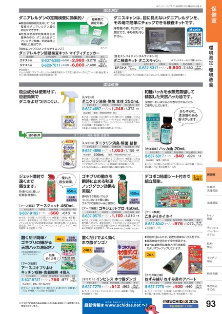 保健室環境測定・環境改善保健室洗面所・面所・洗濯用品濯用品清掃用品清掃用品トイレイ用品品ティッシュシュペーパー・パー・タオルタオル飲料・飲料・食品品キッチンキッチン用品品特別支援別支援事務用品・事務用品・その他その他※パッケージデザインは変更となる場合がございます。ダニアレルゲンの定期検査に効果的!●家庭用掃除機を使用して15分程度でダニアレルゲン量の判別ができます。●文部科学省学校環境衛生の基準の中の、ダニまたはダニアレルゲン検査。判定基準に準拠した商品です。5テスト[住化エンバイロメンタルサイエンス]ダニアレルゲン簡易検査キットマイティチェッカー商品種別お申込番号M価税抜税抜価格税込価格単位8-637-5388¥3,000¥2,980¥3,2788-620-7011¥7,000¥6,800¥7,4802テスト入5テスト入●包装数:1セット内容(マイティチェッカー(検査用紙片)・ゴミ取り袋・チャック付ビニール袋・抽出液)×セット数、取扱説明書(判定用色見本)1枚(2回分入)(5回分入)1セット1セット環境測定※パッケージデザインは変更になる場合があります。短時間で測定可能。ダニスキャンは、目に見えないダニアレルゲンを、その場で簡単にチェックできる検査キットです。掃除機不要。約20分で測定でき、手も服も汚しません。Movie[住化エンバイロメンタルサイエンス]ダニ検査キットダニスキャン®※アレルキエールは付属しません。商品種別お申込番号M価税抜税抜価格税込価格単位型式/1330125テスト入●包装数:1〈セット内容〉5回分:ちり採取器(アルミ袋入)×5、現像液×5、取扱説明書×18-637-5317オープン¥6,800¥7,4801セット(5回分入)殺虫成分は使用せず、忌避効果でダニをよせつけにくい。環境改善[UYEKI]ダニクリン消臭・除菌本体250mLお申込番号M価税抜税抜価格税込価格8-637-4897オープン¥1,248¥1,372単位1本商品種別型式/4968909061354●寸法/90(幅)×50(奥)×205(高)mm●質量/355g●用途/寝装具、タタミ、カーペットなど●使用量の目安/1㎡に5〜6回程度スプレー(シングルシーツの大きさなら10回程度)●包装数:1/24※凍結したり高温になる場所には保管しないでください。詰め替え用ダニクリン消臭・除菌詰替用和種ハッカを水蒸気蒸留して精製した天然ハッカ油です。虫除け、おしぼりなどの香り付けなどにもご使用いただけます。さわやかな、清涼感のある香りがします。[UYEKI]ダニクリン消臭・除菌詰替お申込番号M価税抜税抜価格税込価格8-637-4898オープン¥1,053¥1,158単位1袋商品種別230mL型式/4968909061361●寸法/120(幅)×60奥)×210高)mm●質量/234g●主成分/脂肪族系カルボン酸エステル、サトウキビ抽出エキス、イソプロピルメチルフェノール(除菌剤)●包装数:1/24※子どもの手の届かない、直射日光を避けた場所に保管してください。ゴキブリの動きを瞬時に止める秒速ノックダウン効果を実現!450mL便利なすき間用ノズルがついて、狭いすき間に潜む医薬部外品ゴキブリの駆除が一段と容易に。[アース製薬]ゴキジェットプロ450mL防除用お申込番号8-637-9575オープンM価税抜税抜価格税込価格¥1,100¥1,210単位1本●寸法/73(幅)×60(奥)×230(高)mm●質量/410g●容量/450mL●有効成分/イミプロトリン(ピレスロイド系)0.4755w/v%(原液量105mL)●対象虫種/ゴキブリ●火気厳禁●包装数:1/30※本品は使い切ってから捨ててください。置くだけでよく効くホウ酸ダンゴ!24個入防除用医薬部外品45mmmm45[オカモト]インピレスホウ酸ダンゴお申込番号M価税抜税抜価格8-637-7279オープン¥512税込価格¥563単位1セット(24個入)[大洋製薬]ハッカ油20mLお申込番号M価税抜8-637-5017オープン税抜価格¥840税込価格¥924単位1本商品種別型式/20145●寸法/34(幅)×34(奥)×75(高)mm●質量/73g●包装数:1/120●内容量/20mLデコボコ粘着シート付きで組立簡単。2パック(10個入)[アース製薬]ごきぶりホイホイお申込番号M価税抜税抜価格税込価格8-637-8042オープン¥976¥1,073単位1組(5個×2パック入)●包装数:1/10●死骸が目にふれず、処理も簡単なハウス型です。●有害物質を使用せず安全無害です。●強力な業務用粘着剤と凹凸接着面でよりパワーアップしています。2枚入[カモ井加工紙]ねずみ捕りねずみ男のアパートお申込番号8-637-7278M価税抜¥580税抜価格¥400税込価格¥440単位1セット(2枚入)●パッケージ寸法/155×245×15mm●質量/98g●包装数:1/48●パッケージ寸法/124幅)×48奥)×279長)mm●材質/基材:紙、粘着剤:ゴム系●包装数:1/30ジェット噴射で遠くまで届きます。目・鼻・のどに優しい低刺激・無香料。優れた殺虫効果。450mL防除用医薬部外品[アース製薬]アースジェット450mLお申込番号M価税抜8-637-9192オープン税抜価格¥560税込価格¥616単位1本●質量/390g●容量/●寸法/66(径)×230(高)mm450mL●有効成分/d-T80-フタルスリン0.465w/v%、フェノトリン0.17w/v%(原液量90mL)●対象虫種/ハエ成虫、蚊成虫、ゴキブリ、ノミ、ナンキンムシ、イエダニ、マダニ●火気厳禁●包装数:1/304個入防除用医薬部外品置くだけ簡単!ゴキブリの嫌がる天然ハッカ油配合!※本品は駆除を目的としたものではありません。効果約1カ月![アース製薬]アースゴキブリよけキッ