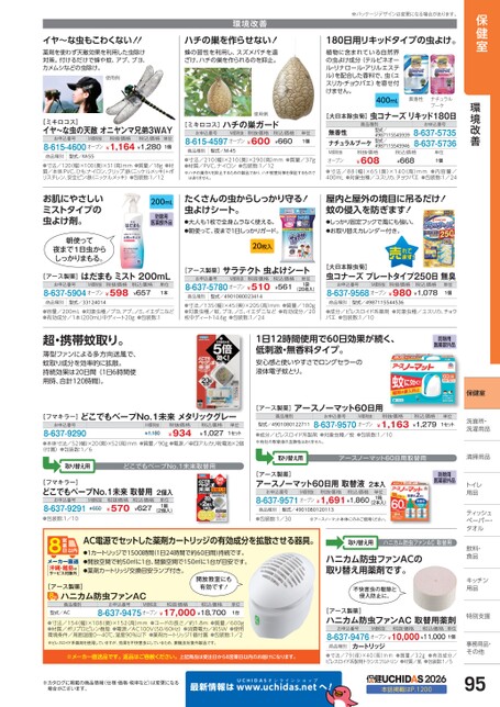 保健室環境改善保健室洗面所・面所・洗濯用品濯用品清掃用品清掃用品トイレイ用品品ティッシュシュペーパー・パー・タオルタオル飲料・飲料・食品品キッチンキッチン用品品特別支援別支援事務用品・事務用品・その他その他※メーカー直送品です。返品はご容赦ください。上記商品は受注日から8営業日以内のお届けになります。●寸法/79(径)×40(高)mm●質量/32g●有効成分/ピレスロイド系製剤トランスフルトリン●材質/紙●包装数:1/5※カタログに掲載の商品情報(仕様・価格・税率など)は変更になる場合がございます。最新情報はUCHIDASww.uchidas.netwへ!2026本誌掲載はP.120095※パッケージデザインは変更となる場合がございます。イヤ〜な虫もこわくない!!薬剤を使わず天敵効果を利用した虫除け対策。付けるだけで蜂や蚊、アブ、ブヨ、カメムシなどの虫除け。使用例環境改善ハチの巣を作らせない!蜂の習性を利用し、スズメバチを遠ざけ、ハチの巣を作られるのを抑止。[ミキロコス]イヤ〜な虫の天敵オニヤンマ兄弟3WAYお申込番号M価税抜税抜価格税込価格8-615-4600オープン¥1,164¥1,280単位1個商品種別型式/M-55●寸法/120(幅)×100(奥)×31高)mm●質量/18g●材質/本体:PVC、ひも:ナイロン、クリップ:鉄(ニッケルメッキ)+ポリスチレン、安全ピン:鉄(ニッケルメッキ)●包装数:1/12使用例[ミキロコス]ハチの巣ガードお申込番号M価税抜税抜価格8-615-4597オープン¥600税込価格¥660単位1個商品種別型式/M-45●寸法/210(幅)×210(奥)×290(高)mm●材質/PVC、ナイロン●包装数:1/12※ハチの巣作りを抑止するための製品であり、ハチ被害対策を保証するもので●質量/37gはありません。※パッケージデザインは変更になる場合があります。180日用リキッドタイプの虫よけ。植物に含まれている自然界の虫よけ成分(テルピネオール・リナロール・アリルエステル)を配合した香料で、虫(ユスリカ・チョウバエ)を寄せ付けません。400mL無香性ナチュラルブーケ[大日本除虫菊]虫コナーズリキッド180日商品種別無香性ナチュラルブーケ型式/4987115545939型式/4987115545946お申込番号8-637-57358-637-5736M価税抜オープン税抜価格¥608税込価格¥668単位1個●寸法/88(幅)×65(奥)×140(高)mm400mL●内容量/●対象虫種/ユスリカ、チョウバエ●包装数:1/24お肌にやさしいミストタイプの虫よけ剤。朝使って夜まで1日虫からしっかりまもる。200mL防除用医薬部外品たくさんの虫からしっかり守る!虫よけシート。屋内と屋外の境目に吊るだけ!蚊の侵入を防ぎます!●大人も1枚で全身ムラなく使える。●朝使って、夜まで1日しっかりガード。●しっかり固定フックで風にも強い。●お取り替えカレンダー付き。20枚入[アース製薬]はだまもミスト200mLお申込番号M価税抜税抜価格8-637-5904オープン¥598税込価格¥657単位1本商品種別型式/33124014●容量/200mL●有効成分/1本(200mL)中ディート20g●包装数:1●対象虫種/ブヨ、アブ、ノミ、イエダニなど超・携帯蚊取り。薄型ファンによる多方向送風で、蚊取り成分を効率的に拡散。持続効果は20日間(1日6時間使用時、合計120時間)。[アース製薬]サラテクト虫よけシートお申込番号M価税抜税抜価格8-637-5780オープン¥510税込価格¥561単位1袋(20枚入)商品種別型式/4901080023414●寸法/135(幅)×45奥)×205高)mm●質量/180g●対象虫種/蚊、ブヨ、ノミ、イエダニなど●有効成分/20枚中ディート14.6g●包装数:1/24[大日本除虫菊]虫コナーズプレートタイプ250日無臭お申込番号M価税抜税抜価格税込価格8-637-9568オープン¥980¥1,078単位1個商品種別型式/4987115544536●成分/ピレスロイド系薬剤●対象虫種/ユスリカ、チョウバエ●包装数:1/101日12時間使用で60日効果が続く、低刺激・無香料タイプ。安心感と使いやすさでロングセラーの液体電子蚊とり。防除用医薬部外品[フマキラー]どこでもベープNo.1未来メタリックグレーお申込番号8-637-9290M価税抜¥1,180税抜価格¥934税込価格¥1,027単位1セット●本体寸法/52(幅)×20奥)×52(高)mm●質量/90g●電源/単四アルカリ乾電池×2個(付属)●包装数:1/6取り替え用どこでもベープNo.1未来取替用[フマキラー]どこでもベープNo.1未来取替用2個入お申込番号8-637-9291M価税抜¥650税抜価格¥570税込価格¥627単位1組(2個入)[アース製薬]アースノーマット60日用商品種別型式/4901080122711お申込番号M価税抜8-637-9570オープン税抜価格¥1,163税込価格¥1,279単位1セット●成分/ピレスロイド系製剤●対象虫種/蚊●包装数:1/10※他社の取替液の互換性はありません。取り替え用アースノーマット60日用取替用[アース製薬]アースノーマット60日用取替液2本入お申込番号M価税抜税抜価格税込価格8-637-9571オープン¥1,691¥1,860単位1箱(2本入)商品種別型式/4901080120113防除用医薬部外品●包装数:1/10●包装数:1/30※アースノーマット本体にのみご使用ください。AC電源でセットした薬剤カートリッジの有効成分を拡散させる器具。取り替え用ハニカム防虫ファンAC取替用●1カートリッジで1500時間(1日24時間で約60日間)持続です。●開放空間で約50㎡に1台、閉鎖空間で150㎡に1台が目安です。●薬剤カートリッジ交換目安ランプ付
