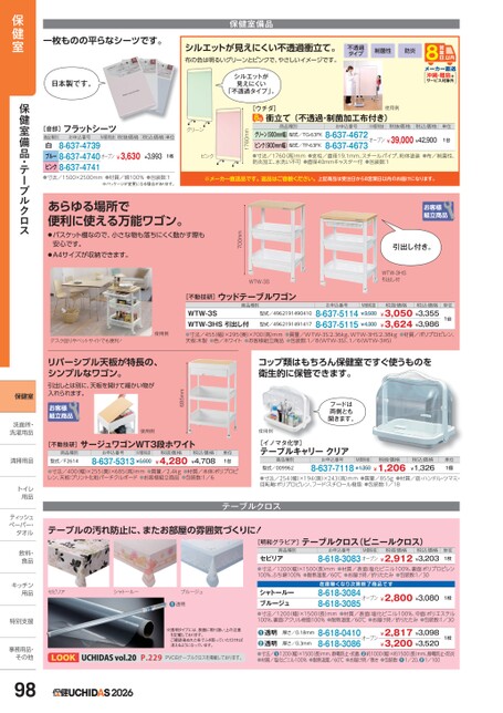 保健室備品一枚ものの平らなシーツです。シルエットが見えにくい不透過衝立て。布の色は明るいグリーンとピンクで、やさしいイメージです。不透過タイプ制菌性防炎日本製です。シルエットが見えにくい「不透過タイプ」。沖縄・離島はサービス対象外商品種別お申込番号M価税抜税抜価格税込価格単位グリーン(900mm幅)型式/TG-63FKピンク(900mm幅)型式/TP-63FK●寸法/1760高)mm●支柱/直径19.1mm、スチールパイプ、粉体塗装●布/制菌性、防炎加工、水洗い不可●直径40mmキャスター付●包装数:18-637-4672オープン¥39,000¥42,9008-637-46731台1760mm[ウチダ]衝立て(不透過・制菌加工布付き)使用例[音部]フラットシーツ商品種別お申込番号M価税抜税抜価格税込価格単位グリーン8-637-4739白ブルー8-637-4740ピンク8-637-4741オープン¥3,630¥3,9931枚ピンク●寸法/1500×2500mm●材質/綿100%●包装数:1※パッケージが変更になる場合があります。※メーカー直送品です。返品はご容赦ください。上記商品は受注日から8営業日以内のお届けになります。引出し付き。WTW-3HS引出し付WTW-3S700mmあらゆる場所で便利に使える万能ワゴン。●バスケット棚なので、小さな物も落ちにくく動かす際も安心です。●A4サイズが収納できます。[不動技研]ウッドテーブルワゴン商品種別WTW-3SWTW-3HS引出し付●寸法/455(幅)×295奥)×700(高)mm●質量/WTW-3S:2.36kg、WTW-3HS:2.38kg●材質/ポリプロピレン、天板:木製●色/ホワイト●お客様組立商品●包装数:1/8(WTW-3S)、1/6(WTW-3HS)¥3,050¥3,355¥3,624¥3,9868-637-51148-637-5115型式/4962191490410型式/4962191491417¥4,3001台お申込番号税抜価格税込価格単位M価税抜¥3,500コップ類はもちろん保健室ですぐ使うものを衛生的に保管できます。フードは両側とも開きます。685mmデスク回りやベットサイドでも便利!使用例リバーシブル天板が特長の、シンプルなワゴン。引出しとは別に、天板を開けて細かい物が入れられます。使用例使用例[不動技研]サージュワゴンWT3段ホワイト商品種別型式/F2614お申込番号M価税抜8-637-5313¥5,600税抜価格¥4,280税込価格¥4,708単位1台●寸法/400(幅)×255(奥)×685(高)mm●質量/2.4kg●材質/本体:ポリプロピレン、天板:プリント化粧パーチクルボード●お客様組立商品●包装数:1/6[イノマタ化学]テーブルキャリークリア商品種別型式/009962お申込番号M価税抜税抜価格8-637-7118¥1,350¥1,206税込価格¥1,326単位1個●寸法/254幅)×194(奥)×243高)mm●質量/855g●材質/底・ハンドル・ツマミ・回転軸:ポリプロピレン、フード:スチロール樹脂●包装数:1/18テーブルクロステーブルの汚れ防止に、またお部屋の雰囲気づくりに![明和グラビア]テーブルクロス(ビニールクロス)商品種別お申込番号M価税抜税抜価格税込価格セビリア●寸法/1200幅)×1500長)mm●材質/表面:塩化ビニル100%、裏面:ポリプロピレン100%、ふち:綿100%●耐熱温度/60℃●お届け時/折りたたみ●包装数:1/308-618-3083オープン¥2,912¥3,203単位1枚1枚8-618-0410オープン¥2,817¥3,098¥3,200¥3,5208-618-3086厚さ/0.18mm厚さ/0.3mm透明透明●●●寸法/●1200(幅)×1500(長)mm、静電防止・抗菌、●約1000幅)×約1500(長)mm、静電防止・防炎●材質/塩化ビニル100%●耐熱温度/60℃●お届け時/巻き●包装数:●1/20、●1/100※透明タイプには、表面に取り扱い上の注意を記載しております。ご確認後ぬれた布でふき取っていただければ消えるようになっています。UCHIDASvol.20P.229PVC白テーブルクロスを掲載しております。2026セビリアシャトールーブルージュ●透明在庫無次第終了商品8-618-3084オープン¥2,800¥3,080シャトールーブルージュ●寸法/1200(幅)×1500(長)mm●材質/表面:塩化ビニル100%、中面:ポリエステル100%、裏面:アクリル樹脂100%●耐熱温度/60℃●お届け時/折りたたみ●包装数:1/308-618-30851枚保健室保健室備品・テーブルクロス保健室洗面所・洗面洗濯用品洗濯用清掃用品清掃用品トイレトイ用品用ティッシュティッペーパー・タオルタオル飲料・飲料・食品食キッチンキッチン用品用特別支援特別支事務用品・事務用品・その他その他98