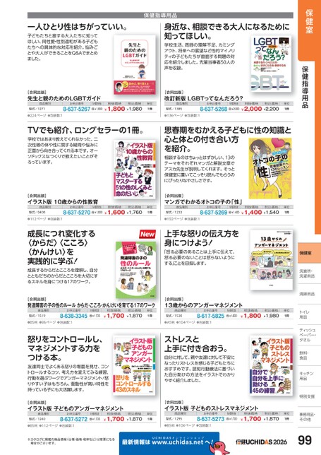 保健室保健指導用品一人ひとり性はちがっていい。子どもたちと接する大人たちに知ってほしい、同性愛・性別違和がある子どもたちへの具体的な対応を紹介。悩みごとや大人ができることをQ&Aでまとめました。保健指導用品身近な、相談できる大人になるために知ってほしい。学校生活、周囲の理解不足、カミングアウト、将来への展望など性的マイノリティの子どもたちが直面する問題の対応を紹介しました。先輩当事者50人の声を収録。[合同出版]先生と親のためのLGBTガイド商品種別型式/1271●224ページ●包装数:1お申込番号8-637-5267M価税抜¥1,800税抜価格税込価格¥1,800¥1,980単位1冊お申込番号8-637-5268M価税抜¥2,00税抜価格税込価格¥2,000¥2,200単位1冊商品種別型式/1385●136ページ●包装数:1[合同出版]改訂新版LGBTってなんだろう?TVでも紹介、ロングセラーの1冊。学校ではあまり教えてくれなかった、二次性徴の体や性に関する疑問や悩みに正面から向き合ってくれる本です。オーソドックスなつくりで教えたいことがそろっています。思春期をむかえる子どもに性の知識と心と体との付き合い方を紹介。相談するのはちょっとはずかしい、13のテーマをそれぞれマンガと解説文章でアスカ先生が説明してくれます。そっと保健室に置いてこっそり読んでもらうのにぴったりなやさしさです。単位1冊保健室洗面所・面所・洗濯用品濯用品清掃用品清掃用品ティッシュシュペーパー・パー・タオルタオル飲料・飲料・食品品キッチンキッチン用品品特別支援別支援税込価格¥1,980単位1冊トイレイ用品品税込価格¥1,870単位1冊事務用品・事務用品・その他その他202699[合同出版]イラスト版10歳からの性教育商品種別型式/0408●112ページ●包装数:1お申込番号8-637-5270M価税抜¥1,600税抜価格税込価格¥1,600¥1,760単位1冊[合同出版]マンガでわかるオトコの子の「性」商品種別型式/1233●192ページ●包装数:1お申込番号8-637-5269M価税抜¥1,00税抜価格税込価格¥1,400¥1,540成長につれ変化する〈からだ〉〈こころ〉〈かんけい〉を実践的に学ぶ!成長するからだとこころを理解し、自分とともだちのからだとこころを大切にするスキルを身につける17のワーク。上手な怒りの伝え方を身につけよう!「怒る必要のあることは上手に伝えて、怒る必要のないことは怒らないようにする」ことを目指します。[合同出版]発達障害の子の性のルールからだ・こころ・かんけいを育てる17のワーク[合同出版]13歳からのアンガーマネジメント商品種別型式/1519お申込番号8-638-3345M価税抜¥1,700税抜価格¥1,700税込価格¥1,870単位1冊商品種別型式/1530お申込番号8-617-5825M価税抜¥1,800税抜価格¥1,800●B5判●96ページ●包装数:1●A5判●104ページ●包装数:1怒りをコントロールし、マネジメントする力をつける本。友達同士でよくある怒りの場面を見せ、コントロールするコツ、考え方を変えてみる練習、行動を選ぶワークでアンガーマネジメント!怒りやすい子はもちろん、衝動性が高い特性を持っている子にも大活躍します。ストレスと上手に付き合おう。自分に対して、親や友達に対して不安になったりストレスを感じる子どもたちにおすすめです。認知行動療法に基づいた自分助けの方法をイラストでわかりやすく紹介しました。[合同出版]イラスト版子どものアンガーマネジメント商品種別型式/1240お申込番号8-637-5272M価税抜¥1,700税抜価格¥1,700税込価格¥1,870単位1冊[合同出版]イラスト版子どものストレスマネジメント商品種別型式/1295お申込番号8-637-5273M価税抜¥1,700税抜価格¥1,700●B5判●112ページ●包装数:1●B5判●104ページ●包装数:1※カタログに掲載の商品情報(仕様・価格・税率など)は変更になる場合がございます。最新情報はUCHIDASww.uchidas.netwへ!
