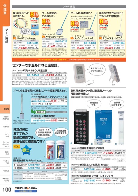 プール用品輪っかをくぐって水に慣れる。プール水面のごみ取りに。沖縄・離島はサービス対象外プール内の清掃に!ネット深さが約40cm、柄は2段パイプでプール内清掃に最適!柄の長さが170cmから250cmまで調整可能。おもりの扱いで2通りの使い方ができます。[エバニュー]パーパスリング(5色組)商品種別型式/EHA111お申込番号8-617-4845単位1組M価税抜税抜価格税込価格¥18,800¥16,300¥17,930(5本入)●寸法/700(径)mm、太さ18mm●質量/おもり:330g、1本:850gおもり含む)●材質/ポリエチレン●おもり5ヶ付(赤、青、黄、白、緑、各色1本1組)●包装数:1沖縄・離島はサービス対象外沖縄・離島はサービス対象外使用例沖縄・離島はサービス対象外[トーエイライト]メッシュクリーナー1商品種別型式/B7921お申込番号8-617-4717M価税抜税抜価格税込価格¥12,000¥11,403¥12,543単位1本●寸法/ネット:300(幅)×320(長)mm、ポール:30(径)mm×1665〜2800(長)mm(調節式、2段パイプ)●質量/1.1kg●材質/メッシュ:ポリエチレン、ポール:アルミ(2段パイプ)●包装数:1[トーエイライト]メッシュクリーナー2[エバニュー]スクープネット250商品種別型式/B2689お申込番号8-617-4784商品種別型式/EHB176お申込番号8-619-1004M価税抜税抜価格税込価格¥15,000¥14,238¥15,661単位1本M価税抜税抜価格税込価格¥24,500¥22,000¥24,200単位1本●寸法/ネット:480幅)×220(長)mm、ネット深さ:400mm、柄:30(径)mm×1665〜2800長)mm(アルミ2段パイプ)●質量/1.1kg●包装数:1●全体の長さ:1700〜2500mm●フレーム枠幅500×長さ250mm●質量/1.9kg●材質/網:ポリエチレン、フレーム・柄:アルミ●角度2段階調節付●ゴム付●PAT●日本製●包装数:1※メーカー直送品です。返品はご容赦ください。上記商品は受注日から8営業日以内のお届けになります。センサーで水温も計れる温度計。[エバニュー]デジタルIN-OUT温度計商品種別型式/EHB268お申込番号8-617-4843M価税抜¥3,400税抜価格¥3,240税込価格¥3,564単位1個●寸法/80幅)×19(奥)×122(高)mm●センサーコード/3長)m●質量/115g●材質/本体:ABS樹脂、外部センサー:ステンレススチール●電源/テスト用単四乾電池×1個●測定範囲/外部温度-20℃〜+70℃、本体温度-10℃〜+50℃●温度計精度/外部温度=±1℃(-5℃〜+45℃)それ以外は±2℃●表示/0.1℃単位●時計、カレンダー表示付●本体は防滴(IPX4)、外部温度センサー部は完全防水(IPX7)●包装数:1プールの水温を測って安全にプール授業が行えます。[久松計量器]プール用水温計ペッテンコーヘル式お申込番号M価税抜税抜価格8-617-4194¥11,000¥10,781¥11,859税込価格単位1本●商品種別アルコールタイプ●長さ/360mm●測定範囲/-10〜+50℃●0.5℃目盛り●真ちゅうクロームメッキ仕上げ●包装数:1※使用後は水洗いをしてください。取り替え用プール用水温計ペッテンコーヘル式用見やすい大きなデジタル表示。裏面飲料用水道水や水泳、遊泳用プールの残留塩素管理に!遊離残留塩素を含む検水に試薬を加えると淡赤紫〜赤紫色に呈色します。専用試薬です。交換用試験管です。●※製造上、内部はメッキされておりませんがご使用上は問題ありません。※水中に入れたままにしないでください。●包装数:1[久松計量器]交換用温度計お申込番号M価税抜税抜価格税込価格単位8-637-4569¥5,600¥5,532¥6,0851本日常点検におすすめ!!簡単に検査でき、廃棄も楽な検査紙です!水泳プールの低濃度遊離残留塩素、pHなどの測定。100枚入高濃度遊離残留塩素測定。●●●[日産化学]簡易水質検査紙アクアチェック100枚入3商品種別プール低濃度遊離残留塩素測定、pH3HC高濃度遊離残留塩素測定お申込番号8-620-70028-620-7003M価税抜¥4,500¥5,150税抜価格税込価格¥4,397¥4,836¥5,031¥5,534型式項目低濃度遊離残留塩素pHMアルカリ度測定範囲主な用途0/0.2/0.4/0.7/1.0/2.0/3.0/5.0/10.0mg/L5.8/6.5/7.0/7.5/8.0/8.60/20/40/80/120/180mg/L水泳プールの低濃度遊離残留塩素、pHなどの測定高濃度遊離残留塩素0/25/50/100/200/400/600mg/L高濃度遊離残留塩素測定アクアチェック3アクアチェックHC●包装数:1/3HC単位1個(100枚入)[柴田科学]残留塩素測定器DPD法商品種別お申込番号M価税抜税抜価格税込価格型式/080540-520●●寸法/67(幅)×37(奥)×156(高)mm●質量/300g●測定範囲/0.05/0.1/0.2/0.3/0.4/0.5/0.6/0.8/1.0/1.3/1.5/2.0●包装数:18-637-5840¥10,500¥10,500¥11,550〈セット内容〉比色板付測定器×1、シリコーンキャップ付角形試験管×3、ビニールケース×1※試薬は別売です。単位1台[柴田科学]粉体試薬DPD法用100回分商品種別お申込番号税抜価格型式/080540-501●●箱寸法/100(幅)×35(奥)×180(高)mm●質量/67g●包装数:18-637-5841¥1,800M価税抜¥1,800税込価格¥1,980単位1箱(100袋入)[柴田科学]角形試験管シリコーンキャップ付商品種別お申込番号型式/080540-0210A●●試験管寸法(1本)/25(幅)×14(奥)×149(高)mm●質量(1本)/95g●包装数:18-637-5842¥3,300(3本入)税込価格¥3,630単位1箱M価税抜¥3,300税抜価格保健室プール用品保健室洗面所・洗面洗濯用品洗濯用清掃用品清掃用品トイレトイ用品用ティッシュティッペーパー・タオルタオル飲料・飲料・食品食キッチンキッチン用品用特別支援特別支事務用品・事務用品・その他その他1002026本誌掲載