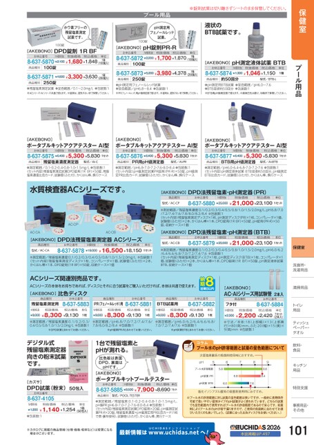 保健室プール用品保健室洗面所・面所・洗濯用品濯用品清掃用品清掃用品トイレイ用品品ティッシュシュペーパー・パー・タオルタオル飲料・飲料・食品品キッチンキッチン用品品特別支援別支援事務用品・事務用品・その他その他ホウ素フリーの残留塩素測定試薬です。100錠[AKEBONO]DPD錠剤1RBFお申込番号M価税抜税抜価格税込価格8-637-5870¥2,100¥1,680¥1,848単位1箱(100錠入)商品種別100錠8-637-5871¥4,600¥3,300¥3,6301箱(250錠入)商品種別250錠●残留塩素測定試薬●呈色範囲/0.1〜2.0mg/L●包装数:1※ACシリーズ・AIシリーズ共通で使えます。※錠剤は、湿気のない所で保管してください。プール用品※錠剤試薬は切り離さずシートのまま保管してください。pH測定用フェノールレッド試薬。液状のBTB試薬です。100錠[AKEBONO]pH錠剤PR-Rお申込番号M価税抜税抜価格税込価格8-637-5872¥2,200¥1,700¥1,870単位1箱(100錠入)商品種別100錠8-637-5873¥5,200¥3,980¥4,3781箱(250錠入)商品種別250錠[AKEBONO]pH測定液体試薬BTBお申込番号M価税抜税抜価格税込価格8-637-5874¥1,300¥1,046¥1,150単位1個商品種別約50回分型式/BTB-L●pH測定用フェノールレッド試薬●呈色範囲/pH6.8〜8.4●包装数:1※PRフェノールレッド)用pH値測定器で使えます。※錠剤は、湿気のない所で保管してください。●pH測定用BTB試薬●呈色範囲/pH6.0〜7.6●BTB溶液約50回分●包装数:1※BTB用pH値測定器で使えます。※直射日光は避け、冷暗所で保管してください。[AKEBONO]ポータブルキットアクアテスターAI型お申込番号M価税抜税抜価格税込価格単位8-637-5875¥6,400¥5,300¥5,8301セット[AKEBONO]ポータブルキットアクアテスターAI型お申込番号M価税抜税抜価格税込価格単位8-637-5876¥6,400¥5,300¥5,8301セット商品種別残留塩素濃度測定器型式/AI-C商品種別PR用pH値測定器型式/AI-PR●測定範囲/0.1・0.2・0.4・0.8・1.0・1.5mg/L●包装数:1〈セット内容〉残留塩素測定試薬DPD錠剤(1RBF)×50錠、残留塩素濃度比色カード、試験管(ふた付)、かくはん棒、携行ケース●測定範囲/pH6.8・7.0・7.2・7.6・8.0・8.4●包装数:1〈セット内容〉pH値測定試薬PR錠剤(PR-R)×50錠、pH値測定PR比色カード、試験管(ふた付)、かくはん棒、携行ケース[AKEBONO]ポータブルキットアクアテスターAI型お申込番号M価税抜税抜価格税込価格単位8-637-5877¥6,400¥5,300¥5,8301セット商品種別BTB用pH値測定器型式/AI-BTB●測定範囲/pH6.0・6.4・6.8・7.0・7.2・7.6●包装数:1〈セット内容〉pH測定液体試薬BTB溶液約50回分、pH値測定BTB比色カード、試験管(ふた付)、かくはん棒、携行ケース水質検査器ACシリーズです。AC-CPAC-CAAC-CB[AKEBONO]DPD法残留塩素測定器ACシリーズ商品種別型式/AC-CAお申込番号M価税抜税抜価格税込価格単位8-637-5878¥19,000¥16,500¥18,1501セット●測定範囲/残留塩素濃度:0.1/0.2/0.3/0.4/0.5/0.8/1.0/1.5/2.0mg/L●包装数:1〈セット内容〉残留塩素測定ディスク×1枚、コンパレータ×1個、試験管(ふた付)×2本、かくはん棒×1本、DPD錠剤(1RBF)×50錠、収納ケース×1個ACシリーズ関連別売品です。[AKEBONO]DPD法残留塩素・pH測定器(PR)商品種別型式/AC-CPお申込番号M価税抜税抜価格税込価格単位8-637-5880¥25,000¥21,000¥23,1001セット●測定範囲/残留塩素濃度:0.1/0.2/0.3/0.4/0.5/0.8/1.0/1.5/2.0mg/L、pH:6.8/7.0/7.2/7.4/7.6/7.8/8.0/8.2/8.4●包装数:1〈セット内容〉残留塩素測定ディスク×1枚、pH測定ディスク(PR)×1枚、コンパレータ×1個、試験管(ふた付)×2本、かくはん棒×1本、DPD錠剤(1RBF)×50錠、pH錠剤(PR-R)×50錠、収納ケース×1個[AKEBONO]DPD法残留塩素・pH測定器(BTB)商品種別型式/AC-CBお申込番号M価税抜税抜価格税込価格単位8-637-5879¥25,000¥21,000¥23,1001セット●測定範囲/残留塩素濃度:0.1/0.2/0.3/0.4/0.5/0.8/1.0/1.5/2.0mg/L、pH:6.0/6.2/6.4/6.6/6.8/7.0/7.2/7.4/7.6●包装数:1〈セット内容〉残留塩素測定ディスク×1枚、pH測定ディスク(BTB)×1枚、コンパレータ×1個、試験管(ふた付)×2本、かくはん棒×1本、DPD錠剤(1RBF)×50錠、pH測定液体試薬BTB、収納ケース×1個ACシリーズの本体をお持ちであれば、ディスクとそれに合う試薬をご購入いただければ、本体は共通で使えます。[AKEBONO]比色ディスク商品種別残留塩素測定用M価税抜税抜価格お申込番号8-637-5883商品種別PR(フェノールレッド)用お申込番号8-637-5881商品種別BTB試薬用お申込番号8-637-5882¥9,000¥8,300¥9,130税込価格単位1枚M価税抜税抜価格税込価格¥9,000¥8,300¥9,130単位1枚M価税抜税抜価格税込価格¥9,000¥8,300¥9,130単位1枚●測定範囲/残留塩素濃度:0.1/0.2/0.3/0.4/0.5/0.8/1.0/1.5/2.0mg/L●包装数:1※DPD試薬とあわせてお使いください。●測定範囲/pH6.8/7.0/7.2/7.4/7.6/7.8/8.0/8.2/8.4●包装数:1※pH錠剤PR-Rとあわせてお使いください。●測定範囲/pH6.0/6.2/6.4/6.6/6.8/7.0/7.2/7.4/7.6●包装数:1※pH試薬BTBとあわせてお使いください。[AKEBONO]AC・AIシリーズ用試験管2本入商品種別フタ付M価税抜お申込番号8-637-5884税抜価格税込価格¥2,300¥2,200¥2,420(2本入)●寸法/本体:18(上部幅)×13(上部奥行)×80(高)mm、ふた:20(幅)×15(奥)×9(高)mm●包装数:1単位1セットデジタル式残留塩素測定器向きの粉末試薬です。1台で残留塩素とpHが測れる。比色板は表面DPD、裏面はpHです。[カズサ]DPD試薬(粉末)50包入お申込番