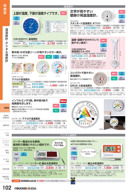 壁掛け-10〜+40℃35〜85%RH155mm税抜価格¥2,524税込価格¥2,776単位1個文字が見やすい壁掛け用温湿度計。[クレセル]スタンダード温湿度計ホワイト商品種別型式/CR-152WHお申込番号M価税抜8-615-3299¥2,700●壁掛けタイプ●寸法/155(径)×37(厚)mm●質量/187g●材質/スチロール樹脂●測定範囲/温度:-10〜+40℃、湿度:35〜85%RH●測定精度/温度:±2℃、湿度:±5%RH(常温時)●最小目盛り/温度:2℃、湿度:5%RH●包装数:1/40上部が温度、下部が湿度タイプです。壁掛け型名温度湿度寸法質量その他ファミリー-30〜+50(±2)℃20〜100(±5)%RH180(幅・高さ)×35mm約260g背面に壁掛け用の穴あり180mmー30〜+50℃20〜100%RH温湿度計307mmー10〜+50℃0〜100%RH壁掛け卓上100mmコンパクトで見やすい温湿度計。電池不要のアナログ温湿度計です。商品種別型式/1031-00●壁掛けタイプ●寸法/80幅)×21(奥)×307(高)mm●質量/65g●材質/ABS樹脂、ガラス●測定範囲/温度-30〜+50℃、湿度0〜100%RH●測定精度/温度±1℃(0〜30℃、その他は±2℃)、湿度±5%RH(40%〜70%RHat15〜25℃、その他は±8%RH)●色/ホワイト●包装数:1/10お申込番号M価税抜税抜価格税込価格単位8-615-2461¥3,200¥3,100¥3,4101個[佐藤計量器製作所]温湿度計ミルノEX熱中症・かぜ注意ゾーンが見やすいカラー表示。0〜電池がいらない室内用アナログ温湿度計。ー10〜+50℃壁掛け卓上100%RH129mmライトグリーンホワイト卓上用として壁掛け用として[マザーツール]アナログ温湿度計商品種別お申込番号M価税抜税抜価格税込価格単位型式/MTH-115G型式/MTH-115W8-615-3081オープン¥1,200¥1,3201個ライトグリーンホワイト●壁掛け・卓上タイプ●寸法/129幅)×35奥)×129高)mm●質量/約107g●材質/主にABS●測定範囲/温度:-10〜+50℃、湿度:0〜100%RH●最小目盛り/温度:1℃、湿度:2%RH●温度計精度/±1.5℃(23℃±5℃)、左記以外±2℃●湿度計精度/±5%RH23℃±5℃、40〜80%RH、左記以外±10%RH●付属品/木ネジ●包装数:1/258-615-3082[インテック]GRUS小型温湿度計商品種別型式/GRS110-WHお申込番号M価税抜8-615-4525¥2,000税抜価格¥1,800税込価格¥1,980単位1個●寸法/100幅)×25奥)×100(高)mm●質量/55g●測定範囲/温度:-10〜+50℃、湿度:0〜100%RH●最小目盛り/温度:1℃、湿度:5%RH●測定精度/温度:±2℃、湿度:5%RH●包装数:1/40インフルエンザ3色、熱中症4色で危険度を示します。●電池がいらないアナログ式。●指針の交差位置がインフルエンザ・熱中症の危険度目安をあらわします。壁掛け卓上+10〜+40℃20〜90%RH[ドリテック]アナログ温湿度計商品種別型式/O-329WTお申込番号8-619-0313M価税抜¥1,480税抜価格¥1,406税込価格¥1,546単位1個●寸法/約127(径)×32(奥)mm●質量/約100gスタンド含む)●材質/ABS樹脂、ガラス、アルミニウム●測定範囲/温度:10〜40℃、湿度:20〜90%RH●最小目盛り/温度:2℃、湿度:5%RH●スタンド付●包装数:1使用例ソーラー電池のみを使用、経済的で環境にやさしい設計です。低照度(100ルクス)で動作可能、高感度ソーラー電池を使用。-40〜+99.9℃気温マグネット式デジタル温度計防水仕様IP67準拠。●最高/最低温度値を自動メモリー。●IPX4防水保護等級に相当。気温-39.9〜+110℃マグネット式センサーケーブル長約3m。[エー・アンド・デイ]ソーラー式組込み型温度計商品種別型式/AD-5656SLお申込番号M価税抜8-615-3158¥3,000税抜価格¥2,850税込価格¥3,135単位1個[エー・アンド・デイ]組込み型温度計商品種別型式/AD-5658Aお申込番号M価税抜8-615-3160¥2,000税抜価格¥1,900税込価格¥2,090単位1個●寸法/104(幅)×41奥)×15(高)mm、温度センサーケーブル:φ2.2mm、長さ約1m、温度センサー金属部:φ3mm、長さ約25mm(皮膜部含む)●質量/54g●測定範囲/-40℃〜+99.9℃、最小表示0.1℃●マグネット内蔵●材質/ABS他●測定間隔/約10秒●付属品/取扱説明書●包装数:1/10●寸法/60幅)×39(奥)×14(高)mm、温度センサーケーブル:φ3mm×長さ約3m、温度センサー金属部:φ5mm、長さ約20mm●質量/40g●測定範囲/-39.9〜+110℃、最小表示0.1℃●電源/単四乾電池×1個●マグネット付●材質/ABS他●測定間隔/約10秒●付属品/テスト用電池、取扱説明書●包装数:1/10UCHIDASvol.20P.1095デジタル水温計を掲載しております。[佐藤計量器製作所]温湿度計商品種別ファミリー●壁掛けタイプ●包装数:1/10型式/TH-200お申込番号M価税抜8-615-1529¥4,000税抜価格¥3,720税込価格¥4,092単位1台温度・湿度が分かれていて見やすい表示!壁掛けー30〜+50℃0〜100%RH保健室温湿度計・デジタル温度計保健室洗面所・洗面洗濯用品洗濯用清掃用品清掃用品トイレトイ用品用ティッシュティッペーパー・タオルタオル飲料・飲料・食品食キッチンキッチン用品用特別支援特別支事務用品・事務用品・その他その他1022026