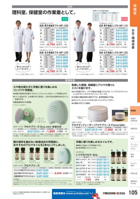 保健室白衣・環境改善理科室、保健室の作業着として。白衣ダブル(参考)サイズの目安(身長)SMLLL男性用160〜170165〜175170〜180175〜185女性用145〜155150〜160155〜165155〜165シングル[ナガイレーベン]白衣男子長袖ダブルNP-100商品種別100着丈)×103胸囲)×42肩幅)×56(袖丈)cm105着丈)×108胸囲)×44肩幅)×58(袖丈)cm110着丈)×113胸囲)×46肩幅)×60(袖丈)cm115着丈)×118胸囲)×48肩幅)×62(袖丈)cmSMLLLお申込番号8-615-30258-615-30268-615-30278-615-3028M価税抜¥5,100税抜価格¥4,794税込価格¥5,273単位1着●布地/ポリエステル65%、綿35%●包装数:1[ナガイレーベン]白衣女子長袖ダブルNP-120商品種別95着丈)×97(胸囲)×38肩幅)×53(袖丈)cm100着丈)×101胸囲)×39肩幅)×55(袖丈)cm105着丈)×105胸囲)×40肩幅)×57(袖丈)cm110着丈)×112胸囲)×42肩幅)×58(袖丈)cmSMLLLお申込番号8-615-30358-615-30368-615-30378-615-3038M価税抜¥5,000税抜価格¥4,700税込価格¥5,170単位1着[ナガイレーベン]白衣男子長袖シングルNP-110商品種別100(着丈)×103胸囲)×42肩幅)×56(袖丈)cm105(着丈)×108胸囲)×44肩幅)×58(袖丈)cm110(着丈)×113胸囲)×46肩幅)×60(袖丈)cm115(着丈)×118胸囲)×48肩幅)×62(袖丈)cmSMLLLお申込番号8-615-30208-615-30218-615-30228-615-3023M価税抜¥5,100税抜価格¥4,794税込価格¥5,273単位1着●布地/ポリエステル65%、綿35%●包装数:1[ナガイレーベン]白衣女子長袖シングルNP-130商品種別95着丈)×97(胸囲)×38肩幅)×53(袖丈)cm100(着丈)×101胸囲)×39肩幅)×55(袖丈)cm105(着丈)×105胸囲)×40肩幅)×57(袖丈)cm110(着丈)×112胸囲)×42肩幅)×58(袖丈)cmSMLLLお申込番号8-615-30308-615-30318-615-30328-615-3033M価税抜¥5,000税抜価格¥4,700税込価格¥5,170単位1着袖口にはひもが入っております。袖口にはひもが入っております。ポケットは左胸と両腰にあります。●布地/ポリエステル65%、綿35%●包装数:1ポケットは左胸と両腰にあります。●布地/ポリエステル65%、綿35%●包装数:1環境改善火や熱を使わずに手軽に香りを楽しめるコンパクト芳香器。●対話で気持ちを落ちつけたり、リフレッシュするシーンで利用します。●ファン式なので、火を使わずに安全に、さまざまな効用のあるオイルを使えます。●電池寿命約100時間。※アロマオイルは別売です。乾燥した教室、保健室にアロマの香りとミストを届けます。●水の容器の中に、アロマ精油も直接入れられる、シンプルでスタイリッシュなデザインのアロマディフューザーです。●5段階の運転時間の選択ができ、長時間運転が可能。●LEDナチュラルライト付き(ON/ライトダウン/OFF)。●お掃除・お手入れ簡単。使用例保健室洗面所・面所・洗濯用品濯用品清掃用品清掃用品トイレイ用品品ティッシュシュペーパー・パー・タオルタオル飲料・飲料・食品品キッチンキッチン用品品特別支援別支援事務用品・事務用品・その他その他リーフ形マットにアロマオイルを2〜3滴たらします。[カテックス]アロマブリーズEcomini本体のみ商品種別型式/ANE012Pお申込番号8-637-5010M価税抜¥1,900税抜価格¥1,800税込価格¥1,980単位1台●寸法/79(幅)×60(奥)×93(高)mm●質量/92g(電池別)●適用範囲/約4.5畳●付属品/テスト用電池(単三乾電池×2個)、リーフ形マット×5枚●包装数:1/12置き場所を選ばない乾電池式の芳香器に、おすすめのアロマオイルを2本セレクトしました。※超音波ミストチップ交換可能。[カテックス]アロマディフューザー(アクアブリーズFlora*はな)商品種別型式/PZ-UA20お申込番号M価税抜8-637-5019¥7,900税抜価格¥7,380税込価格¥8,118単位1台●寸法/174(幅)×174(奥)×110(高)mm●質量/410g●電源/DC24V500mA(専用アダプタ付)●水タンク容量/380mL●適用床面積/〜20畳●連続使用時間/約10時間●包装数:1/8手軽に香りを楽しめるオイルです。●●●●●●お申込番号8-637-50118-637-50128-637-50138-637-50148-637-50158-637-5016商品種別型式/95085型式/95078ティートリーヒノキラベンダーユーカリ・ラジアータ型式/95122ペパーミント型式/95108シトロネラ型式/95054型式/95153●●●●●●[クラウト]いつでもアロマ3mLM価税抜オープン税抜価格¥735税込価格¥808単位1本●寸法/22(径)×58(高)mm●内容量/3mL●包装数:1/12※3滴使用で約30回分です。●植物から抽出した天然精油100%。●水蒸気蒸留したオイルです。リラックス向きアロマオイルセット虫よけ向きアロマオイルセット[カテックス]アロマブリーズ抗菌消臭向きアロマオイルセットアロマブリーズEcomini本体商品種別お申込番号M価税抜税抜価格税込価格単位リラックス向きアロマオイルセット8-637-50308-637-5031虫よけ向きアロマオイルセット8-637-5032抗菌消臭向きアロマオイルセット●包装数:1〈セット内容〉リラックス向きアロマオイルセット:アロマブリーズEcomini本体、いつでもアロマ3mLヒノキ、ラベンダー各1本、虫よけ向きアロマオイルセット:アロマブリーズEcomini本体、いつでもアロマ3mLペパーミント、シトロネラ各1本、抗菌消臭向きアロマオイルセット:アロマブリーズEcomini本体、いつでもアロマ3mLティートリー、ユーカリ・ラジアータ各1本オープン¥3,245¥3,5691セット※カタログに掲載の商品情報(仕様・価格・税率など)は変更になる場合がございます。最新情報はUCHI