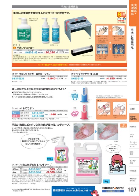 ●寸法/39×42×161mm●電源/単三アルカリ乾電池×4個(別売)●包装数:1/24●質量/約103.6g●紫外線/350〜380nm(ピーク370nm)洗面所・洗濯用品手洗い指導用品沖縄・離島はサービス対象外本体①専用のローションをワンプッシュ(約1mL)手に取り、まんべんなく塗り広げます。②手洗い石けん液を使って、手洗いを行います。手洗い指導用品手洗いの重要性を確認するのにぴったりの教材です。手洗い(医薬石けん液部外品)[サラヤ]手洗いチェッカー商品種別型式/41336お申込番号8-637-2143専用ローションM価税抜¥22,800税抜価格¥20,520税込価格¥22,572単位1セット●包装数:1〈セット内容〉手洗いチェッカー本体、ブラックライトLED(ブラックライトLED用単三アルカリ乾電池×4個(別売))、手洗い石けん液250mL手洗い石けん液ユ・ムP-5(医薬部外品))×1本、手洗いチェッカー専用ローション230mL×2本ブラックライトLED③ブラックライトLEDを取り付けた本体に手を入れます。④洗い残した部分が光ります。※メーカー直送品です。返品はご容赦ください。上記商品は受注日から8営業日以内のお届けになります。手洗いチェッカー専用消耗品[サラヤ]手洗いチェッカー専用ローション8-637-2539M価税抜¥1,960お申込番号税抜価格税込価格¥1,940¥2,134[サラヤ]ブラックライトLED8-637-2145お申込番号M価税抜¥4,320単位1本税抜価格税込価格¥4,150¥4,565単位1本●包装数:1/12楽しみながら上手に手を洗う習慣を身につけよう!●手を洗う前に手のひらにスタンプをポン、印影がキレイに消えるまで石鹸でしっかり洗います。●インキには安全性に配慮して食用色素を使用しています。[シヤチハタ]おててポン商品種別お申込番号型式/ZHT-A1ブルーピンク●寸法/48.9幅)×44.6(奥)×92.2(高)mm8-618-10378-618-1038型式/ZHT-A2M価税抜税抜価格税込価格単位¥500¥440¥4841個●質量/18g●包装数:1/10手洗い教育にピッタリな泡の色が変わるハンドソープ。しっかり手を洗っていくと、泡の色がピンクから白に変わり、楽しく手洗いを覚えることができます。フルーティな香り付き。小さな手でも取りやすいロングノズルが取りつけられます。ルズノ)品グ属ン付ロ(500mL[アルボース]泡の色が変わるハンドソープ型式/型式/M価税抜商品種別税抜価格お申込番号¥565税込価格¥621¥3,600¥3,960SW-530-003-08-637-2497オープンSW-530-004-08-637-2498500mL4kg●寸法/500mL:98幅)×61奥)×293高)mm●液色/ピンク●液性/弱酸性●泡タイプ●成分/有効成分:イソプロピルメチルフェノール、その他成分:ラウレス硫酸Na、ヤシ油脂肪酸ジエタノールアミドプロピルベタイン液、濃グリセリン、PEG(400)、安息香酸Na、フェノキシエタノール、パラベン、エデト酸塩、イソプロパノール、赤106、香料、pH調整剤●医薬部外品●販売名:薬用弱酸性泡ハンドソープa●包装数:1/24500mL)、1/44kg)●付属品/500mL泡ハンドソープ專用ノズル単位1本印面印面※約1000回スタンプできます。(インキ補充はできません)※30秒以上時間が経つと印影が落ちにくくなります。ブルー使い方ピンク1.手にスタンプする。2.印影が消えるまでしっかり洗う。保健室保健室洗面所・洗濯用品泡タイプ清掃用品清掃用品使用例しっかり時間をかけて洗おう。4kgトイレイ用品品ティッシュシュペーパー・パー・タオルタオル飲料・飲料・食品品キッチンキッチン用品品特別支援別支援事務用品・事務用品・その他その他※カタログに掲載の商品情報(仕様・価格・税率など)は変更になる場合がございます。最新情報はUCHIDASww.uchidas.netwへ!2026本誌掲載はP.1145107
