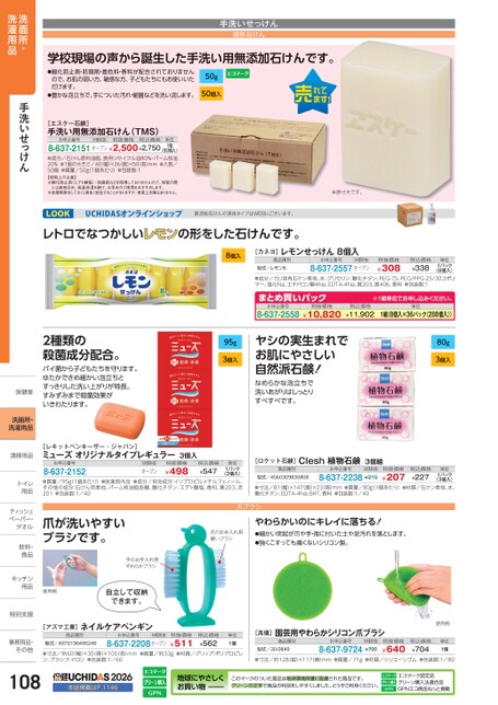 UCHIDASオンラインショップ無添加石けんの液体タイプはWEBにございます。レトロでなつかしいレモンの形をした石けんです。8個入95g3個入2種類の殺菌成分配合。バイ菌から子どもたちを守ります。ゆたかできめ細かい泡立ちとすっきりした洗い上がりが特長。すみずみまで殺菌効果がいきわたります。[レキットベンキーザー・ジャパン]ミューズオリジナルタイプレギュラー3個入お申込番号8-637-2152(3個入)●質量/95g(1個あたり)●医薬部外品●成分/有効成分:イソプロピルメチルフェノール、その他の成分:石けん用素地、パーム核油脂肪酸、酸化チタン、エデト酸塩、香料、黄203、赤201●包装数:1/40M価税抜オープン税抜価格¥498税込価格¥547単位1パック[カネヨ]レモンせっけん8個入商品種別型式/レモン8お申込番号M価税抜8-637-2557オープン税抜価格¥308税込価格¥338単位1パック(8個入)●成分/カリ含有石ケン素地、水、グリセリン、酸化チタン、PEG-75、PEG/PPG-25/30コポリマー、塩化Na、エチドロン酸4Na、EDTA-4Na、黄203、黄406、香料●包装数:1まとめ買いパック8-637-2558お申込番号¥10,820税抜価格※1組単位申込。税込価格¥11,902単位1組(8個入×36パック(288個入))ヤシの実生まれでお肌にやさしい自然派石鹸!なめらかな泡立ちで洗いあがりはしっとりすべすべです。80g3個入[ロケット石鹸]Clesh植物石鹸3個組商品種別お申込番号M価税抜型式/4560309830808(3個入)●寸法/81幅)×147(奥)×23高)mm●質量/80g1個あたり)●材質/石ケン素地、水、酸化チタン、EDTA-4Na、BHT、香料●包装数:1/408-637-2238¥215税抜価格¥207税込価格¥227単位1パック爪ブラシ爪のお手入れ用硬いブラシやわらかいのにキレイに落ちる!●細かい突起が爪や手・指に付いた土や泥汚れを落とします。●強くこすっても痛くないシリコン製。爪が洗いやすいブラシです。手のお手入れ用やわらかブラシ使用例自立して収納できます。[アズマ工業]ネイルケアペンギン商品種別型式/4970190490249お申込番号M価税抜8-637-2208オープン税抜価格¥511税込価格¥562単位1個●寸法/約60幅)×30(奥)×100(高)mm●質量/約33g●材質/グリップ:ポリプロピレン、ブラシ:ナイロン●包装数:1/60[髙儀]園芸用やわらかシリコン爪ブラシ商品種別型式/20-0849お申込番号M価税抜8-637-9724¥700税抜価格¥640使用例税込価格¥704単位1個●寸法/約128(縦)×117(横)mm●質量/71g●材質/シリコーンゴム●包装数:1/801082026本誌掲載はP.1146地球にやさしくお買物いこのマークのついた商品は地球環境保護に配慮された商品です。グリーンの文字で商品の判別をしやすくしました。どうぞご利用ください。エコマーク認定品グリーン購入法適合品GPNエコ商品ねっと掲載洗面所・洗濯用品手洗いせっけん保健室保健室洗面所・洗濯用品清掃用品清掃用品トイレトイ用品用ティッシュティッペーパー・タオルタオル飲料・飲料・食品食キッチンキッチン用品用特別支援特別支事務用品・事務用品・その他その他学校現場の声から誕生した手洗い用無添加石けんです。●酸化防止剤・防腐剤・着色料・香料が配合されておりませんので、お肌の弱い方、敏感な方、子どもたちにもお使いいただけます。●豊かな泡立ちで、手についた汚れ・細菌などを洗い流します。[エスケー石鹸]手洗い用無添加石けん(TMS)単位1箱お申込番号M価税抜税抜価格税込価格8-637-2151オープン¥2,500¥2,750(50個入)●成分/石けん原料油脂、食用リサイクル油80%・パーム核油20%●1個の大きさ/40(幅)×26奥)×50(高)mm●入数/50個●質量/50g1個あたり)●包装数:1【使用上の注意】※酸化防止剤(エデト酸塩)・防腐剤などを使用しておりませんので、保管の際には直射日光、高温多湿を避け、お早めのご使用をおすすめします。※長期間保存しておくと黄色く変色することがありますが、使用上支障はありません。手洗いせっけん固形石けん50g50個入※原寸大です。