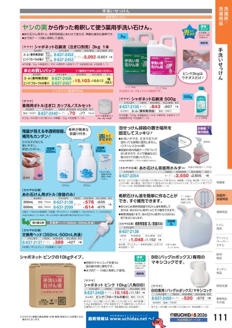 ※注ぎ口(カップ&ノズル)は別売です。ピンク3kg[サラヤ]シャボネット石鹸液500gお申込番号M価税抜8-637-2100オープン税抜価格¥843商品種別ユ・ム(香料無添加)税込価格¥927型式/30831単位1本●内容量/500g●医薬部外品●包装数:1/24●殺菌成分/IPM●希釈用●液体タイプユ・ム500g泡せっけん容器の置き場所を固定してスッキリ!●水洗いができ、丈夫で圧力が加わっても容易に変形しません。(ステンレス2mm厚)●仮留め用の両面テープがついておりますので、ネジで壁面などに取り付けてお使いください。※仮留め用両面テープのみでは固定できません。95mm使用例[さわやか広場]お申込番号8-637-2254あわ石けん容器用ホルダー仮留め用両面テープ付きM価税抜オープン税抜価格¥2,550税込価格¥2,805単位1個●寸法/約103(幅)×108(奥)×70(高)mm、穴径:95mm●質量/290g●材質/ステンレス(2mm厚)●付属品/取付用ネジ(直径4mm×長さ32mm)×3本、コンクリート用プラグアンカー×3本●お客様取付商品●包装数:1/18保健室保健室洗面所・洗濯用品手洗いせっけん液体※タイプ※泡容器に入れることで、泡状でも使えます。希釈用ピンク3kgはウチダスだけ!500g手洗いせっけん希釈用せっけんヤシの実から作った希釈して使う薬用手洗い石けん。●あわ石けん用ボトル、希釈用容器とあわせて使えば、準備も補充も簡単です。●水で約7〜10倍に希釈して使用。3kg[サラヤ]シャボネット石鹸液(注ぎ口別売)3kg1本8-637-2452オープン¥5,092¥5,601お申込番号税抜価格税込価格商品種別30831M価税抜単位1本8-637-2453ユ・ム(香料無添加)型式/ピンク(フローラルの香り)型式/●内容量/3kg23134●殺菌成分/IPM●希釈用●液体タイプ●医薬部外品●包装数:1/3商品種別まとめ買いパック8-637-2456ユ・ム(香料無添加)ピンク(フローラルの香り)8-637-2457お申込番号※1組単位申込。税抜価格税込価格単位¥15,103¥16,6131組(3本入)ユム3kg・シャボネット関連別売品[サラヤ]業務用ボトル注ぎ口カップ&ノズルセットお申込番号M価税抜税抜価格税込価格単位商品種別型式/920918-637-2440オープン●寸法/60(径)×45(高)mm●質量/32g¥70¥77●包装数:1/301セット※サラヤ業務用ボトル2kg・3kg・5kg用残量が見える半透明容器。補充もカンタン!希釈が簡単な目盛り付き。小さな子どもにも使いやすい、安定したボトル。収容量350mL使用例350mL500mL収容量500mL※石けん液は容器の8分目程度でお使いください。[さわやか広場]あわ石けん用ボトル(容器のみ)商品種別お申込番号底径/75mm350mL500mL●高さ/195mm(使用時)●材質/ポリエチレン●包装数:1/36350mL)、1/24500mL)※石けん液は入っていません。中に入れる石けん液は泡状で使えるものを入れてください。8-637-2136オープン8-637-2099¥578¥614底径/90mm1本税込価格¥635¥675税抜価格M価税抜単位取り替え用交換用ヘッド(350mL・500mL共通)[さわやか広場]交換用ヘッド(350mL・500mL共通)8-637-2137オープン税込価格¥427¥389お申込番号税抜価格単位1個M価税抜●材質/ポリエチレン●包装数:1/60シャボネットピンクの10kgタイプ。希釈石けん液を簡単に作ることができ、すぐ補充できます。7〜9倍の希釈に便利な目盛り付き●あらかじめ希釈用容器で石けん液を希釈しておけば、あわ石けん用ボトルにすぐ補充できます。●希釈用容器1本で、あわ石けん用ボトル(500mL)約7本分になります。希釈用容器3L(容器のみ)[さわやか広場]お申込番号8-637-2138税込価格税抜価格¥1,048¥1,152M価税抜オープン●材質/ポリエチレン●希釈目盛り、注ぎ口付●包装数:1/20単位1本収容量3L※石けん液は入っていません。●別売のマキシコックを使うと詰め替え時に便利です。●水で約7〜10倍に希釈して使用。BIB(バッグinボックス)専用のマキシコックです。液体※タイプ※泡容器に入れることで、泡状でも使えます。希釈用[サラヤ]シャボネットピンク10kg(八角BIB)お申込番号M価税抜税抜価格税込価格単位8-637-2458オープン¥10,165¥11,1811本ピンク(フローラルの香り)型式/23135商品種別●寸法/262(幅)×252(奥)×234(高)mm●内容量/10kg●殺菌成分/IPM●液体タイプ●販売名:シャボネット石鹸液Eピンク、芳香タイプ)●医薬部外品●包装数:1[サラヤ]BIB専用(バッグinボックス)マキシコックお申込番号M価税抜8-637-2459オープン税抜価格¥520税込価格¥572単位1個商品種別型式/72039●寸法/48幅)×63奥)×53高)mm●包装数:1/50洗面所・洗濯用品清掃用品清掃用品トイレイ用品品ティッシュシュペーパー・パー・タオルタオル飲料・飲料・食品品キッチンキッチン用品品特別支援別支援事務用品・事務用品・その他その他※カタログに掲載の商品情報(仕様・価格・税率など)は変更になる場合がございます。最新情報はUCHIDASww.uchidas.netwへ!2026本誌掲載はP.1149