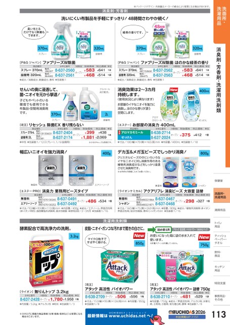 洗面所・洗濯用品消臭剤・芳香剤・洗濯用洗剤類保健室保健室洗面所・洗濯用品清掃用品清掃用品トイレイ用品品ティッシュシュペーパー・パー・タオルタオル飲料・飲料・食品品キッチンキッチン用品品特別支援別支援事務用品・事務用品・その他その他[P&Gジャパン]ファブリーズW除菌商品種別お申込番号M価税抜スプレー370mL詰替用320mL●成分/消臭成分、除菌成分、香料●包装数:1型式/286307型式/8644828-637-2560オープン8-637-2561せんいの奥に浸透して、菌・ニオイを元から撃退!子どもやペットのいる環境でも使用できる布製品・空間用消臭剤です。370mLスプレー税抜価格¥583¥468税込価格¥641¥514単位1本1袋アルコール成分配合。2L詰替用[花王]リセッシュ除菌EX香り残らない商品種別お申込番号M価税抜型式/49013013560318-637-2404オープンスプレー370mL詰替用2L●中性●包装数:1/12スプレー)、1/6(詰替用)8-637-2174型式/503381税抜価格¥399税込価格¥438¥1,881¥2,069単位1本[P&Gジャパン]ファブリーズW除菌ほのかな緑茶の香り商品種別お申込番号M価税抜スプレー370mL詰替用320mL●成分/消臭成分、除菌成分、香料●包装数:1型式/4987176286260型式/2864758-637-2562オープン8-637-2563税抜価格¥583¥468税込価格¥641¥514単位1本1袋消臭効果は2〜3カ月持続します。(使用状況により異なります)お部屋のイヤなニオイを強力に消臭し、ほのかな香りが漂う空間にします。アロマカモミール[エステー]お部屋の消臭力400mL商品種別アロマカモミールせっけんお申込番号M価税抜8-638-2714オープン8-637-2024400mLせっけん税抜価格税込価格単位¥375¥4121個消臭剤・芳香剤※パッケージデザイン・内容量はメーカーの都合により変更になる場合があります。洗いにくい布製品を手軽にすっきり!48時間さわやか続く!緑茶の香りです。臭いをとるだけでなく除菌もできます。370mLスプレー320mL詰替用370mLスプレー320mL詰替用※小分けキャップは別売です。●寸法/100(幅)×70(奥)×165(高)mm●内容量/400mL●包装数:1/18幅広いニオイを強力消臭!400gデカ玉&メガ玉ビーズでしっかり消臭!クリスタルビーズの中にいろいろなイヤなニオイに対し消臭作用のある植物系消臭成分などをしっかり浸透させた消臭剤です。※お手持ちの容器に入れてお使いください。800g無香料エアリーソープ無香料シャボン[エステーPRO]商品種別消臭力業務用ビーズタイプ無香料エアリーソープ●寸法/93幅)×93(奥)×113(高)mm型式/4901070130245型式/4901070130252お申込番号M価税抜税抜価格8-637-0491オープン¥4868-637-0492税込価格単位¥5341個●内容量/400g●成分/エタノール、界面活性剤(非イオン・両性)、脂肪酸塩系消臭剤、吸水性樹脂●使用目安/2〜3カ月●包装数:1/16[ライオンケミカル]アクアリフレ消臭ビーズ大容量詰替商品種別お申込番号M価税抜税抜価格税込価格単位型式/4900480221864型式/4900480221871無香料シャボン●寸法/160(幅)×75(奥)×260(高)mm●容量/800g界面活性剤、吸水性樹脂、香料(シャボンのみ)●包装数:1/168-637-04688-637-0467オープン¥298●成分/植物系消臭剤・非イオン¥3271個洗濯用洗剤類酵素配合で高洗浄力の洗剤。皮脂・ニオイ・ガンコな汚れまで驚きの白さに。詰め替え用アタック高活性バイオパワーつめかえパック3.2kgマイクロ粒子ですばやく溶ける。お使いになった箱に袋のまま入れて使います。※計量スプーンは付属していません。850g750g[ライオン]無りんトップ3.2kgお申込番号M価税抜税抜価格税込価格8-637-2428オープン¥1,780¥1,958単位1箱●内容量/3.2kg●アルカリ性●粉状●包装数:1/3[花王]アタック高活性バイオパワーお申込番号M価税抜8-638-2709オープン税抜価格¥506税込価格¥556単位1箱[花王]アタック高活性バイオパワー詰替750gお申込番号M価税抜8-638-2710オープン税抜価格¥481税込価格¥529単位1袋●寸法/153幅)×95(奥)×126高)mm●内容量/850g●包装数:1/8●内容量/750g●成分/界面活性剤、アルカリ剤、水軟化剤、工程剤、分散剤、蛍光増白剤、酵素●包装数:1/8※カタログに掲載の商品情報(仕様・価格・税率など)は変更になる場合がございます。最新情報はUCHIDASww.uchidas.netwへ!2026本誌掲載はP.1151