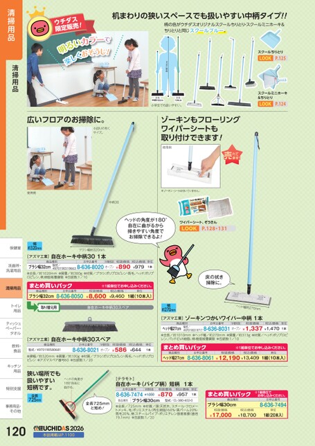 スクールちりとりP.125スクールミニホーキ&ちりとりP.124身長134cm全長全長中柄102cm小学生でも扱いやすい。134cm机まわりの狭いスペースでも扱いやすい中柄タイプ!!柄の色がウチダスオリジナルスクールちりとり・スクールミニホーキ&ちりとりと同じスクールブルー。ラーカでおそうじ!明いくしる楽広いフロアのお掃除に。小回りの利くサイズ。ゾーキンもフローリングワイパーシートも取り付けできます!使用例使用例※ゾーキン・シートは付いていません。中柄30ヘッドの角度が180°自在に曲がるから掃きやすい角度でお掃除できるよ!ワイパーシート、ぞうきんP.128・131保健室保健室幅約320mm[アズマ工業]自在ホーキ中柄301本ブラシ幅約320mm商品種別お申込番号M価税抜税抜価格型式/49701903196638-636-8020オープン¥890ブラシ幅32cm●全長/約1020mm●質量/約300g●材質/ブラシ:ポリプロピレン・馬毛、ヘッド:ポリプロピレン、柄:樹脂被覆鋼管●包装数:1/10税込価格¥979単位1本まとめ買いパックブラシ幅32cm商品種別8-636-8050お申込番号※1組単位申込。税抜価格¥8,600税込価格¥9,460単位1組(10本入)床の拭き掃除に。取り替え用自在ホーキ中柄30スペア幅約270mmヘッド幅約270mm[アズマ工業]自在ホーキ中柄30スペア商品種別型式/4970190580681お申込番号M価税抜8-636-8021オープン税抜価格¥586税込価格¥644単位1本●掃幅/約320mm●質量/約100g●材質/ブラシ:ポリプロピレン・馬毛、ヘッド:ポリプロピレン●アズマスペア番号60●包装数:1/20[アズマ工業]ゾーキンつかいワイパー中柄1本商品種別お申込番号M価税抜税抜価格税込価格型式/49701903197178-636-8031オープンヘッド幅27cm●全長/約1010mm●ヘッド幅/約270mm●質量/約313g●材質/ヘッド:ポリプロピレン、パッド:EVA樹脂、柄:樹脂被覆鋼管●包装数:1/10¥1,337¥1,470単位1本まとめ買いパックヘッド幅27cm商品種別お申込番号※1組単位申込。8-636-8061¥12,190¥13,409税抜価格税込価格単位1組(10本入)狭い場所でも扱いやすい短柄です。全長725mmヘッドの角度が180°自在に曲がる。全長725mmと短め![テラモト]自在ホーキ(パイプ柄)短柄1本お申込番号8-636-7474M価税抜¥1,050税抜価格¥870税込価格¥957単位1本商品種別ブラシ幅30cm型式/CL-380-402-0●全長/725mm●材質/頭:天然木、スチール・クロメートメッキ、毛:ポリエステル(再生樹脂)60%・黒パーム20%・馬毛20%、柄:スチールパイプ・ポリエチレン接着被膜(直径19.1mm)●包装数:1/20まとめ買いパックブラシ幅30cm商品種別税抜価格¥17,000税込価格¥18,700※1組単位申込。お申込番号8-636-7494単位1組(20本入)1202026本誌掲載はP.1100清掃用品清掃用品洗面所・洗面洗濯用品洗濯用清掃用品トイレトイ用品用ティッシュティッペーパー・タオルタオル飲料・飲料・食品食キッチンキッチン用品用特別支援特別支事務用品・事務用品・その他その他