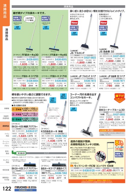 継ぎ柄タイプの床ホーキです。工具不要でスペア着脱!※継ぎ柄は再分解できません。全長約1395mm※継ぎ柄は再分解できません。全長約1395mm清掃用品掃く・拭く・洗う・水切りに!柄を3分割できるジョイントタイプ。大きなゴミをコシのある毛がしっかりと掃き出します。除電材配合でごみが絡みにくくしっかりと掃けます。全長1320mm全長1320mm約30cm約45cm[テラモト]FF床ホーキα30[テラモト]FF床ホーキα45商品種別型式/CL-840-090-3お申込番号8-636-8003商品種別型式/CL-840-091-3お申込番号8-636-8005M価税抜税抜価格税込価格オープン¥1,635¥1,798単位1本M価税抜税抜価格税込価格オープン¥1,800¥1,980単位1本●掃幅/300mm●質量/469g●材質/頭:ポリプロピレン、毛:PET、柄:スチールパイプにポリエチレン樹脂接着被覆●お客様組立商品●包装数:1/10●掃幅/450mm●質量/517g●材質/頭:ポリプロピレン、毛:PET、柄:スチールパイプにポリエチレン樹脂接着被覆●お客様組立商品●包装数:1/10約32cm[山崎産業]JSブルロンF商品種別型式/BR953-000J-MBお申込番号8-637-0823単位1本税込価格税抜価格¥1,800¥1,980M価税抜オープン●掃幅/約320mm●質量/380g●材質/ハンドル:アルミパイプ、甲:ポリプロピレン、毛:PET※ネジ式組立ハンドルなので組立後の分解ができます。●お客様組立商品●包装数:1/10[山崎産業]JS自由箒32約33cm商品種別型式/BR952-032J-MBお申込番号8-637-0822単位1本税抜価格税込価格¥1,800¥1,980M価税抜オープン●掃幅/約330mm●質量/320g●材質/ハンドル:アルミパイプ、甲:ポリプロピレン、毛:ポリプロピレン・再生PET・馬毛・除電材●お客様組立商品●包装数:1/10※ネジ式組立ハンドルなので組立後の分解ができます。[テラモト]FF床ホーキスペア30[テラモト]FF床ホーキスペア45[山崎産業]JPブルロンFスペア[山崎産業]JP自由箒32スペア商品種別型式/CL-841-190-3お申込番号8-636-8004商品種別型式/CL-841-191-3お申込番号8-636-8006税抜価格M価税抜オープン●掃幅/300mm●質量/約115g●包装数:1/20税込価格¥844¥768単位1個税抜価格M価税抜オープン●掃幅/450mm●質量/約163g●包装数:1/20税込価格¥1,012¥920単位1個商品種別型式/BR675-000J-SPM価税抜オープン●掃幅/320mm税抜価格¥906お申込番号8-636-7873税込価格¥996●包装数:1/10単位1個商品種別型式/BR668-032J-SPM価税抜オープン●掃幅/330mm税抜価格¥780お申込番号8-636-7871税込価格¥858●包装数:1/20単位1個柄を使いやすい長さに調整できます。●低学年から高学年まで身長に合わせて使えます。●柄は180°自在に角度が変わり、適切な角度で軽く止まるのでヘッドは常に床面にフィットします。全長664〜1020mm全長約870〜1400mmコーナー汚れを掃き出すコンパクトなホーキ。張り出したブラシが廊下や階段コーナーの汚れを効果的に掃き出します。全長約1015mm使いやすい長さに節ができます。調ドの角度が16段階ヘッ°自在に曲がる。180約26cm約30cm[テラモト]KSⅡ自在ホーキ伸縮商品種別型式/CL-884-130-0お申込番号8-636-7262(平均身長:約122〜127cm)■長さ調節の目安1・2年生約100〜105cm3・4年生約110〜115cm5・6年生約120〜130cm(平均身長:約133〜139cm)(平均身長:約145〜152cm)[テラモト]BM-2ホーキ26伸縮柄アクアブルー商品種別型式/CL-465-220-5お申込番号8-636-8127トイレトイ用品用M価税抜¥2,000税抜価格税込価格¥1,523¥1,675単位1本テラモト][BMコーナーブルーム30商品種別お申込番号1本柄M価税抜¥2,300型式/CL-465-201-78-637-0805税抜価格税込価格¥1,840¥2,024単位1本●質量/約280g●掃幅/300mm●材質頭:ポリプロピレン、毛:ポリエステル、柄:/Φ16アルミパイプ●毛の長さ/約40mm●包装数:1/10P.1107セットでご利用いただけるエコBM-2チリト利たるエコM-チリトリを掲載しております。掲てす。約30cm道具の着脱が簡単、お掃除用品をスッキリ収納。●モップなどを吊り下げた重みではさむ力が加わる独自構造のアーム型フックが6カ所(固定)とスライド式フック4個付き。●モップを押し上げるだけで脱着がワンタッチでできます。沖縄・離島はサービス対象外[テラモト]モップハンガーRC型コンパクト6本掛商品種別型式/CE-491-340-08-636-8129¥41,500¥27,429¥30,171お申込番号M価税抜税抜価格税込価格単位1台●寸法/536(幅)×505(奥)×1375(高)mm●質量/9kg●材質/本体・受皿:スチール(粉体塗装)、丸パイプ:スチール(ユニクロメッキ)●キャスター付●付属品/スパナ2本●お客様組立商品●包装数:1※メーカー直送品です。返品はご容赦ください。上記商品は受注日から8営業日以内のお届けになります。●掃幅/260mm●質量/260g●材質/頭:ポリプロピレン、毛:ポリエステル60%(再生樹脂)、馬毛20%、黒パーム20%、柄:アルミパイプ、グリップ:ポリプロピレン●屋内用●包装数:1/10※毛先の曲がりぐせを防ぐため、吊り下げて保管してください。M価税抜オープン税抜価格税込価格¥1,436¥1,579単位1本●掃幅/300mm●質量/480g●材質/頭:ABS樹脂、ブラシ:ポリエステル、柄:スチールパイプにAAS樹脂接着被膜●包装数:1/20取り替え用スペア※BM-2ホーキ26スペアアクアブルー、自在ホーキスペア(樹脂タイプ)共に互換性があります。※毛先の曲がりぐせを防ぐため、吊り下げて保管し